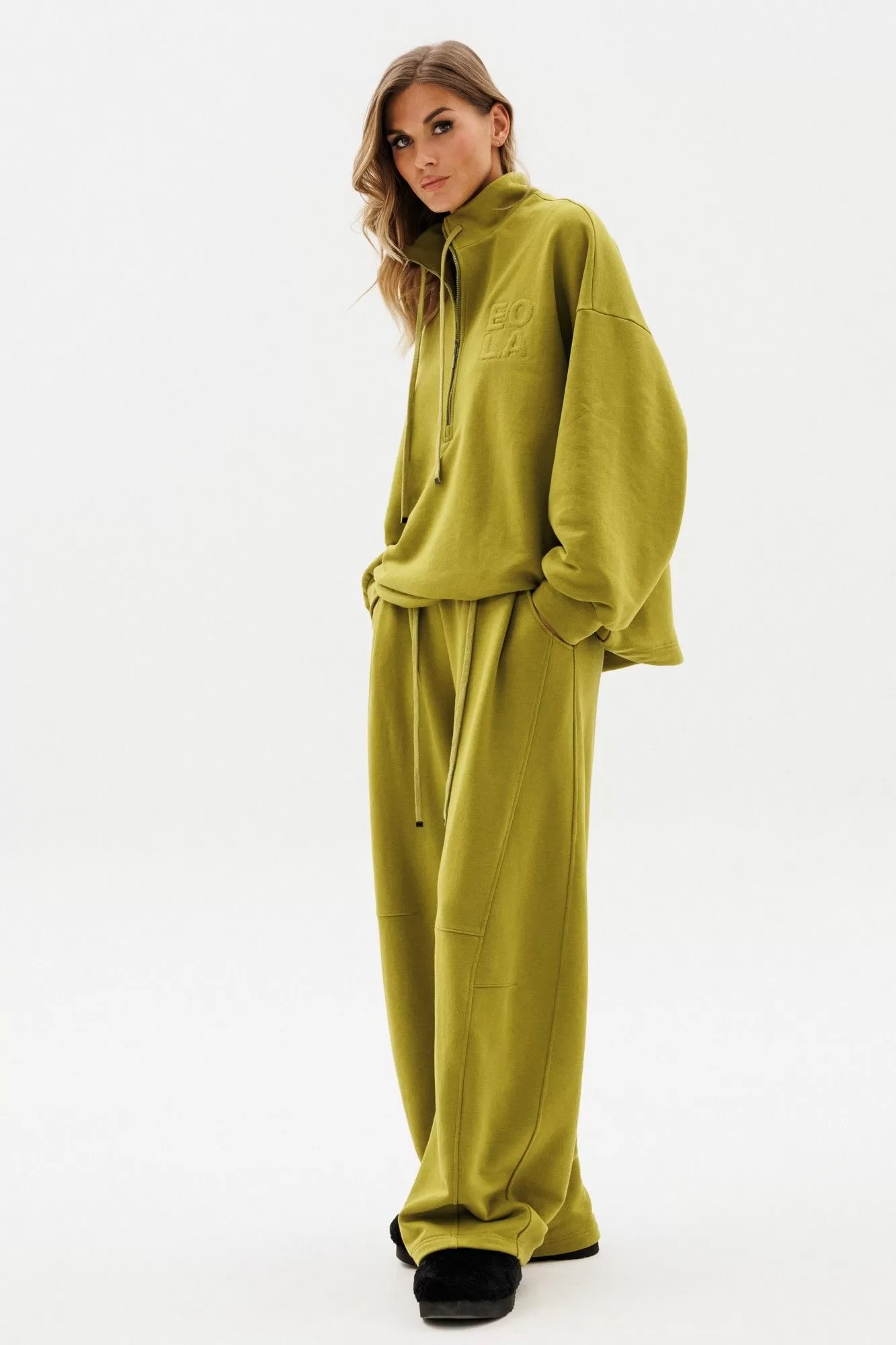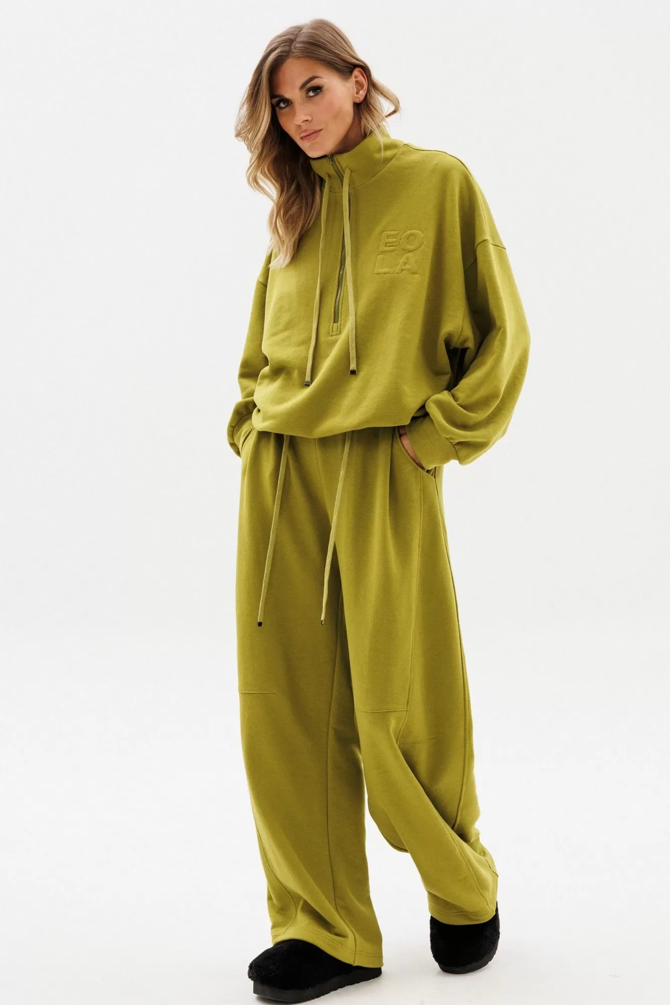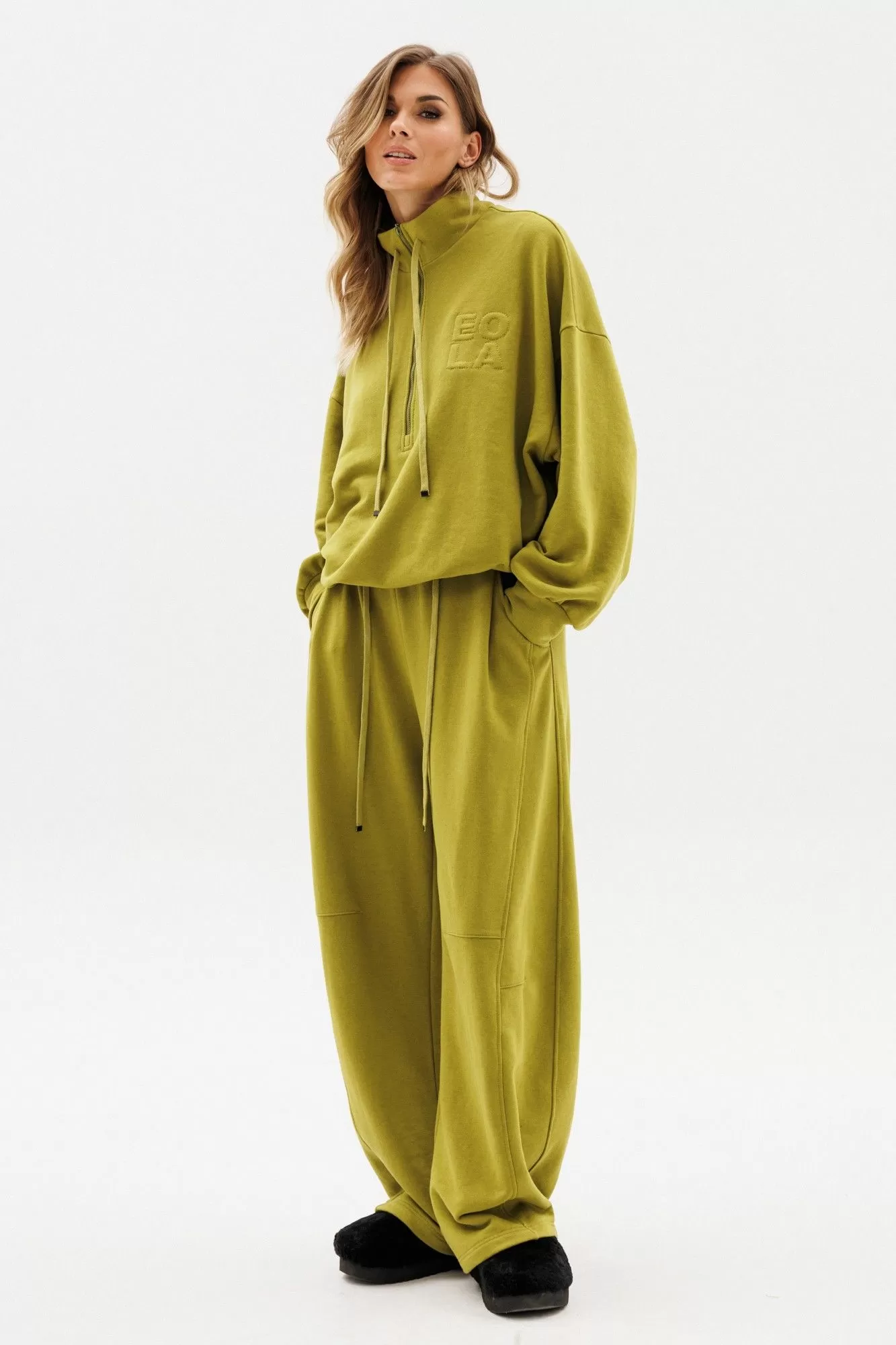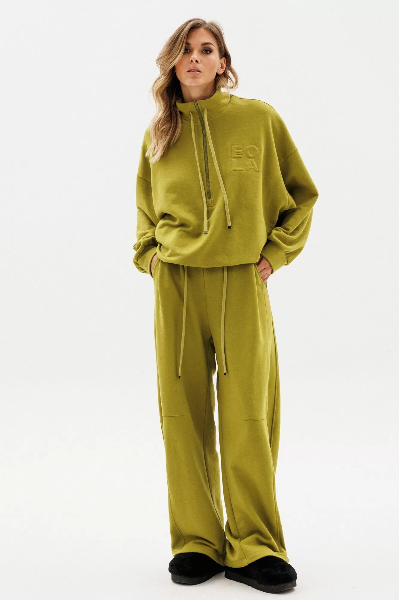 Комплект: джемпер+брюки. Комплект выполнен из трикотажного полотна. Джемпер прямого силуэта, покроя "oversize" длиной до линии бедер. Спереди застежка на молнию. Воротник-стойка. Плечевой шов удлинен. Рукав рубашечного покроя, одношовный, расширенный и присборенный к низу. Низ рукава на притачной манжете. Низ джемпера на эластичной тесьме с фиксаторами. Джемпер декорирован вышивкой по переду. Брюки прямого силуэта, длиной в пол, на притачном поясе с эластичной тесьмой. Спереди боковые карманы с фигурным входом, петли в поясе, в которые втянут шнур из основной ткани, коленные вытачки, складки. Сзади справа накладной карман.