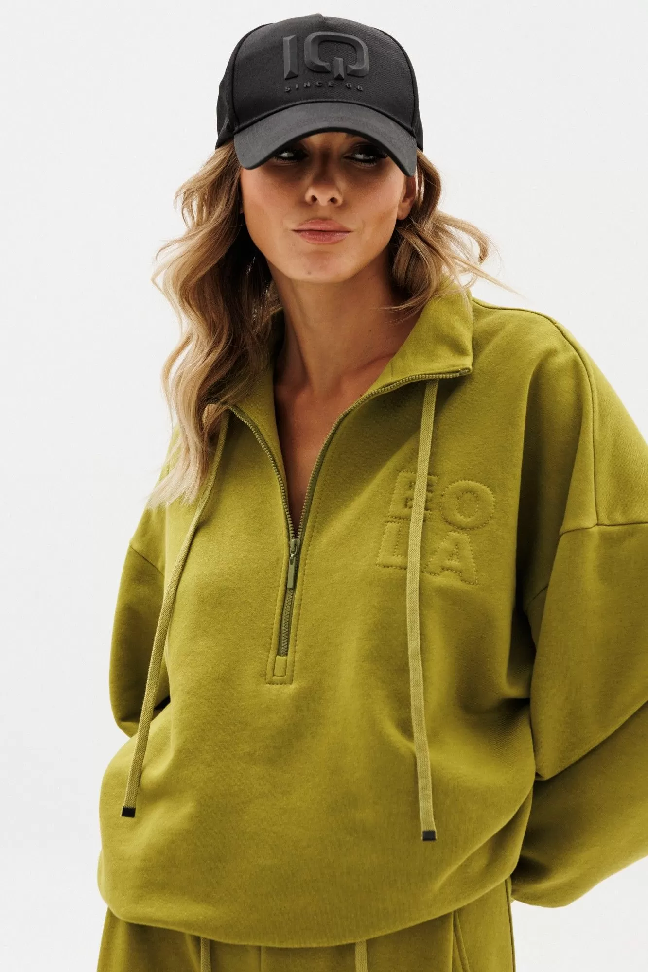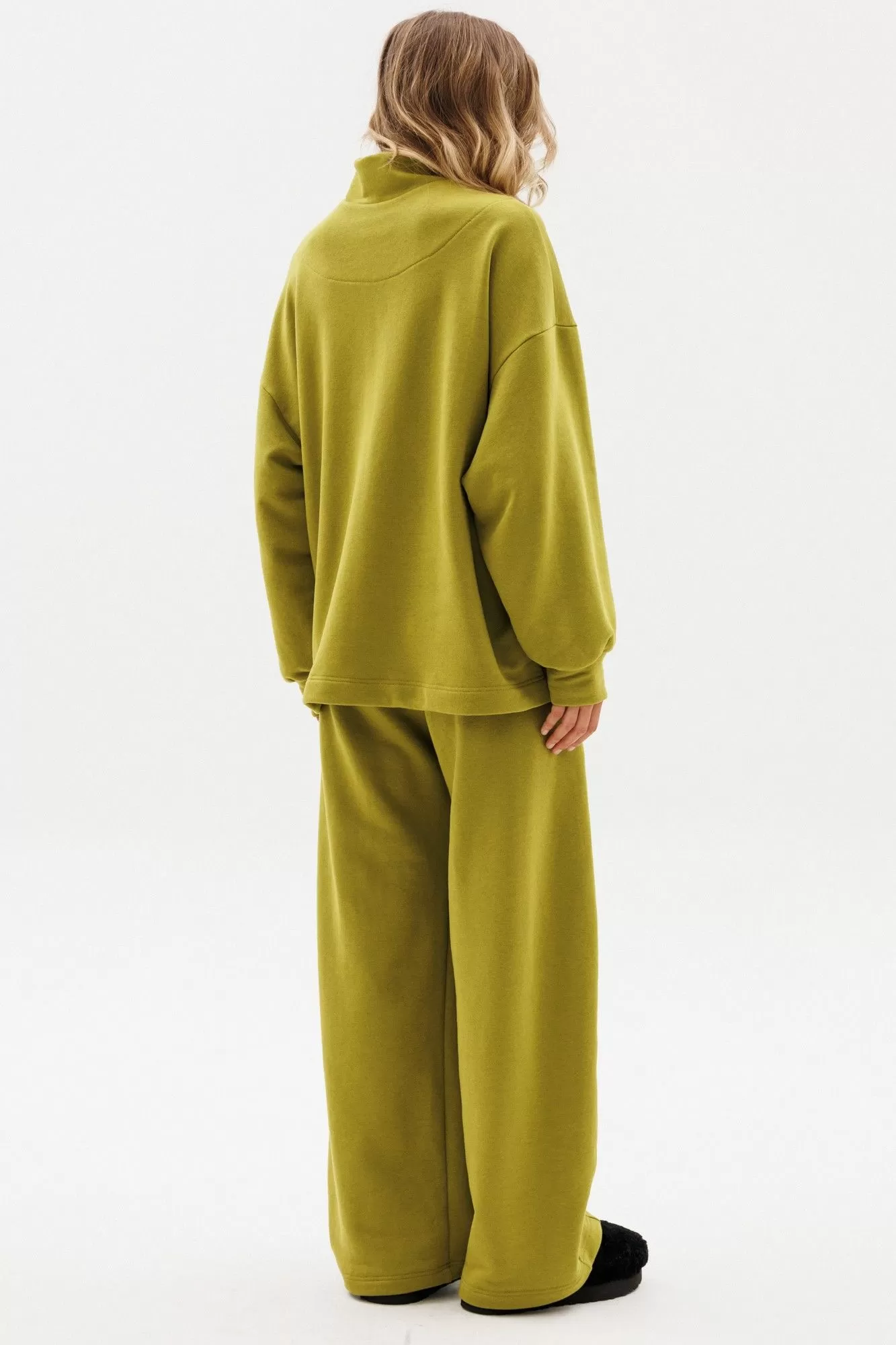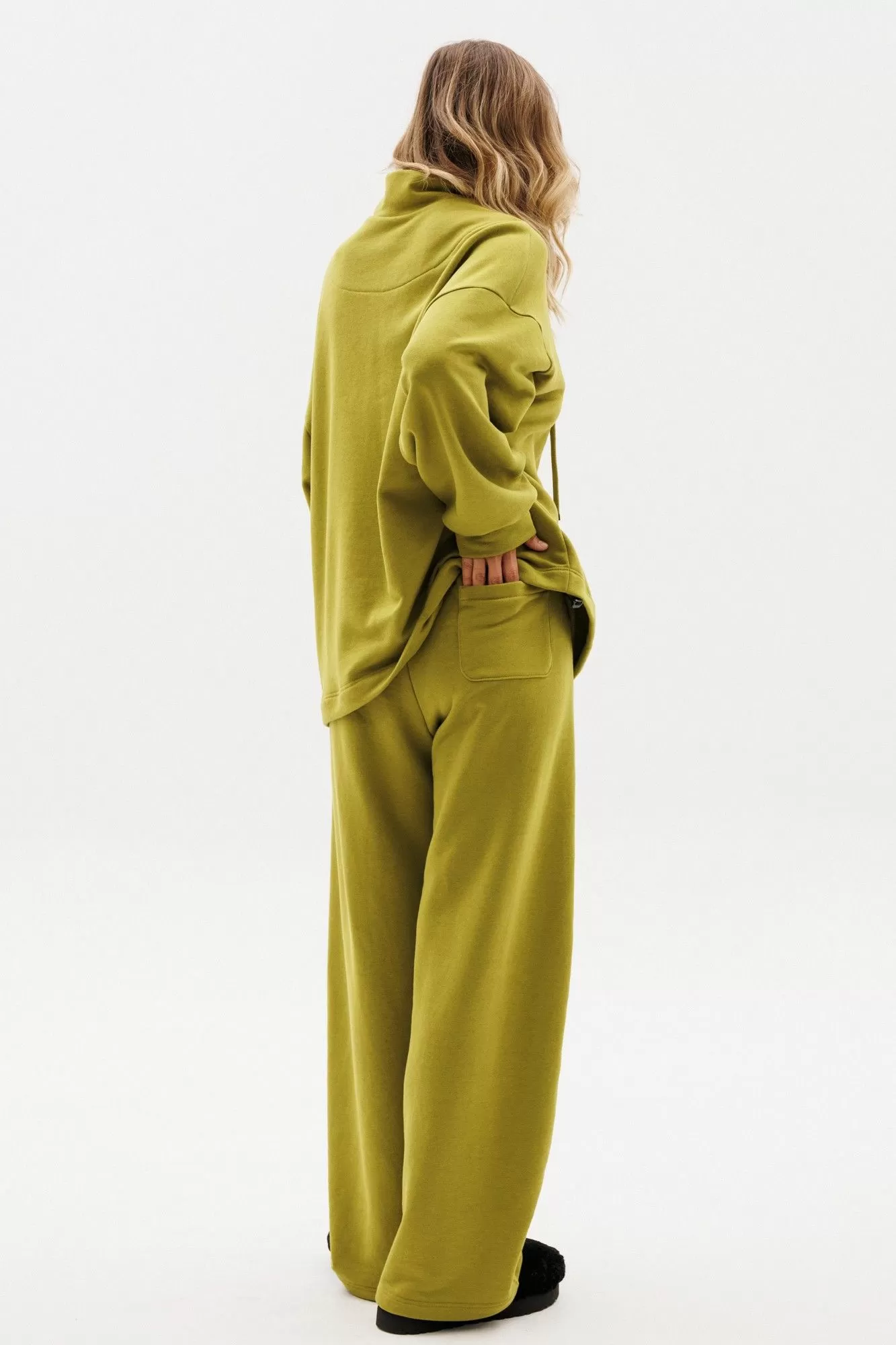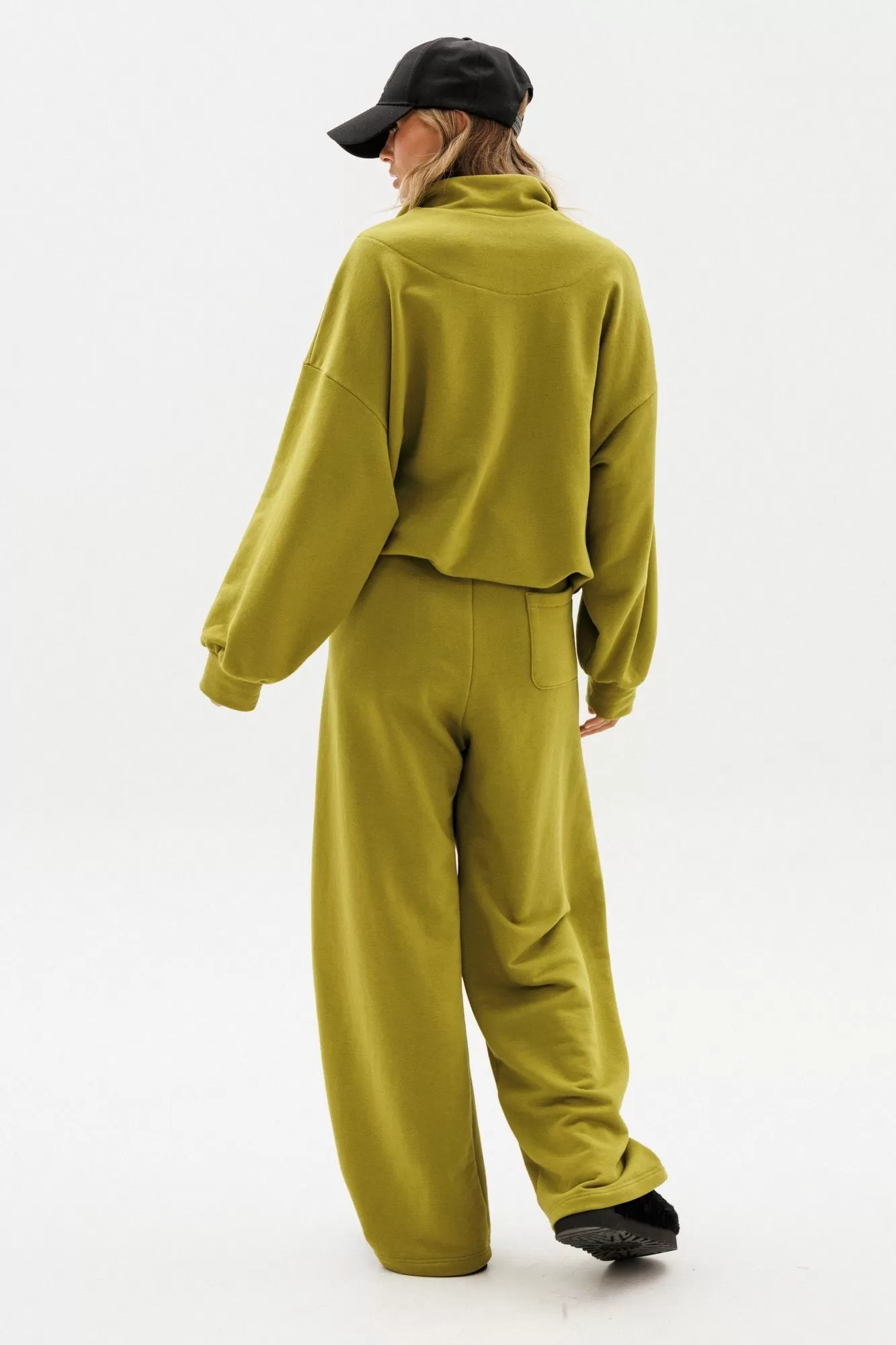 Комплект: джемпер+брюки. Комплект выполнен из трикотажного полотна. Джемпер прямого силуэта, покроя "oversize" длиной до линии бедер. Спереди застежка на молнию. Воротник-стойка. Плечевой шов удлинен. Рукав рубашечного покроя, одношовный, расширенный и присборенный к низу. Низ рукава на притачной манжете. Низ джемпера на эластичной тесьме с фиксаторами. Джемпер декорирован вышивкой по переду. Брюки прямого силуэта, длиной в пол, на притачном поясе с эластичной тесьмой. Спереди боковые карманы с фигурным входом, петли в поясе, в которые втянут шнур из основной ткани, коленные вытачки, складки. Сзади справа накладной карман.