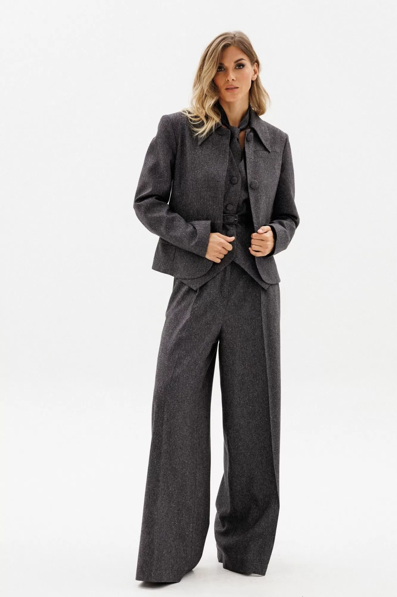 Брюки-палаццо выполнены из костюмной ткани меланж. Брюки на притачном поясе, длиной в пол, расширенные к низу. Спереди складки и боковые карманы с наклонным входом. Застежка спереди на молнию с гульфиком и пуговицу. На задних частях обработаны талиевые вытачки.