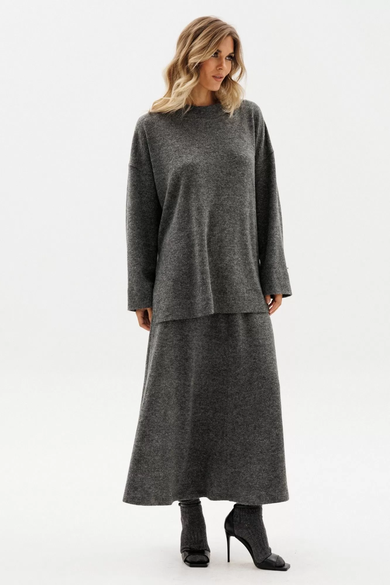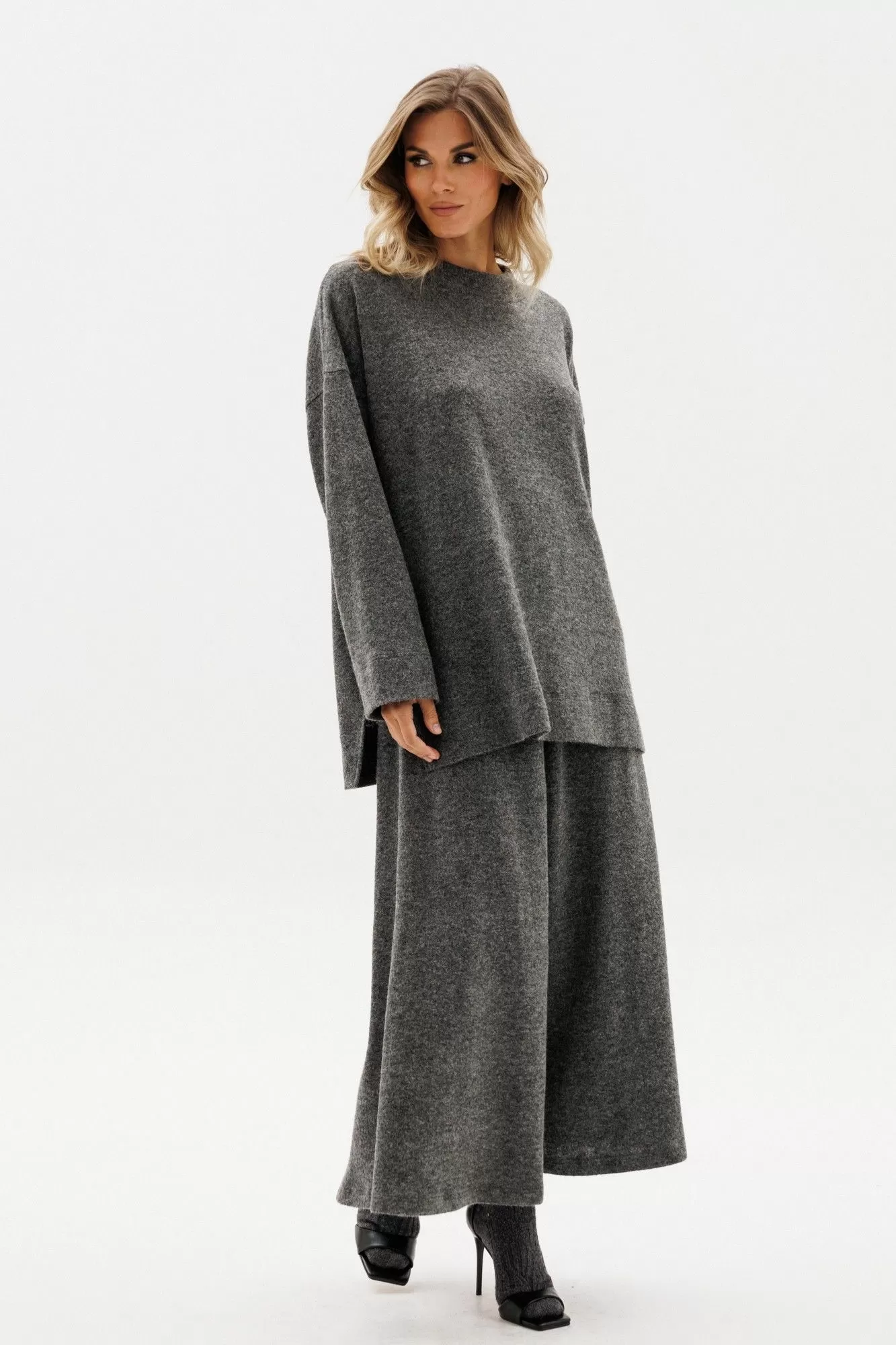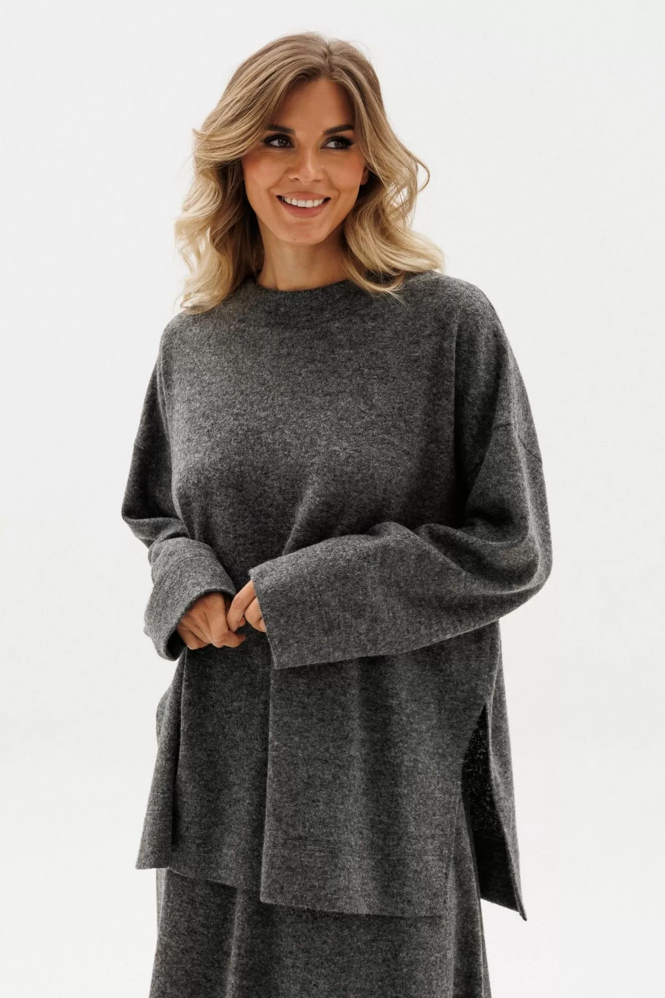 Джемпер выполнен из трикотажного полотна. Джемпер прямого силуэта, длиной ниже линии бедер. Перед и спинка цельные. Горловина округлой формы, обработана широкой бейкой. Плечевой шов удлинен. Рукав рубашечного покроя, одношовный. В боковых швах разрезы.