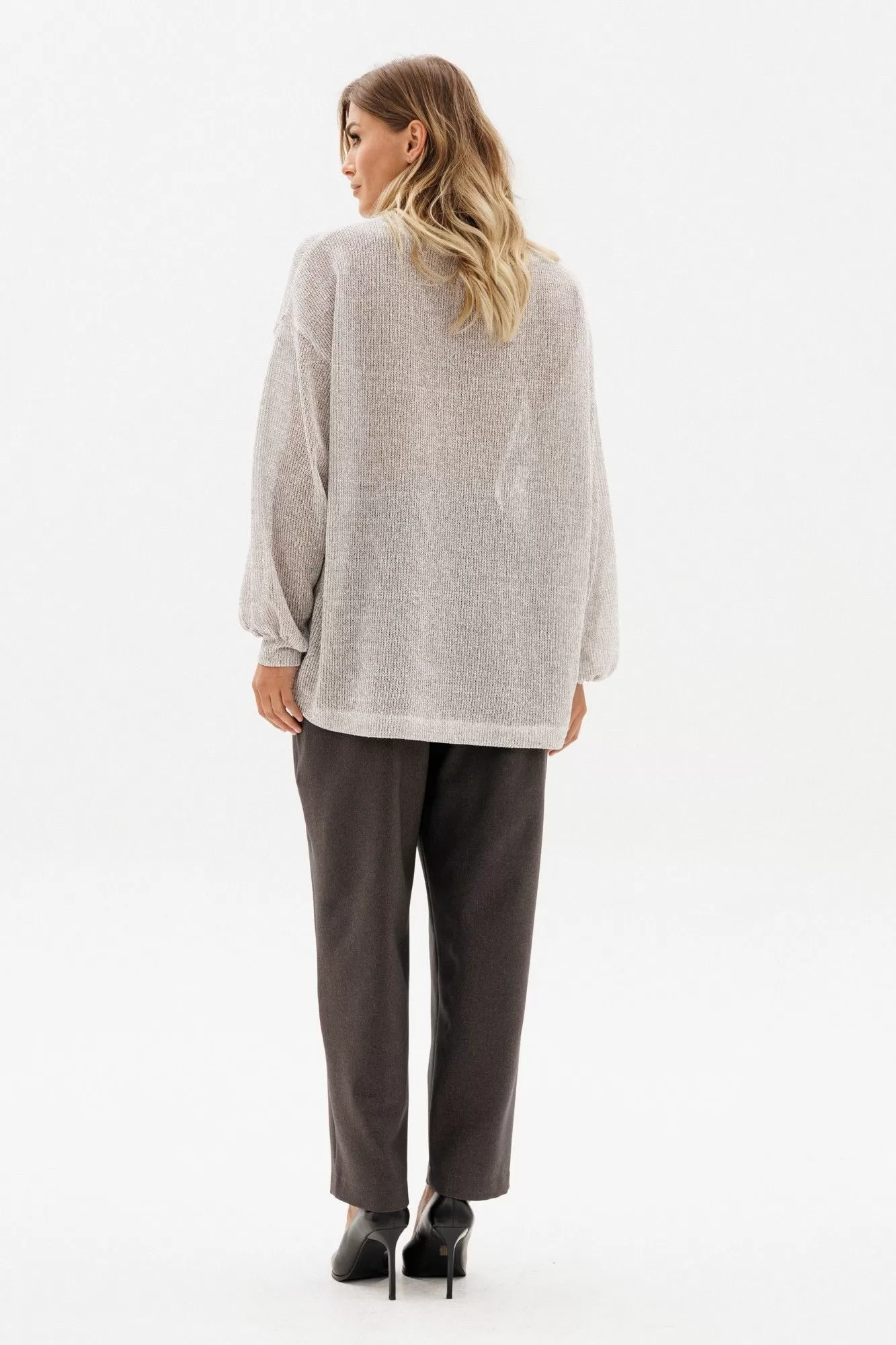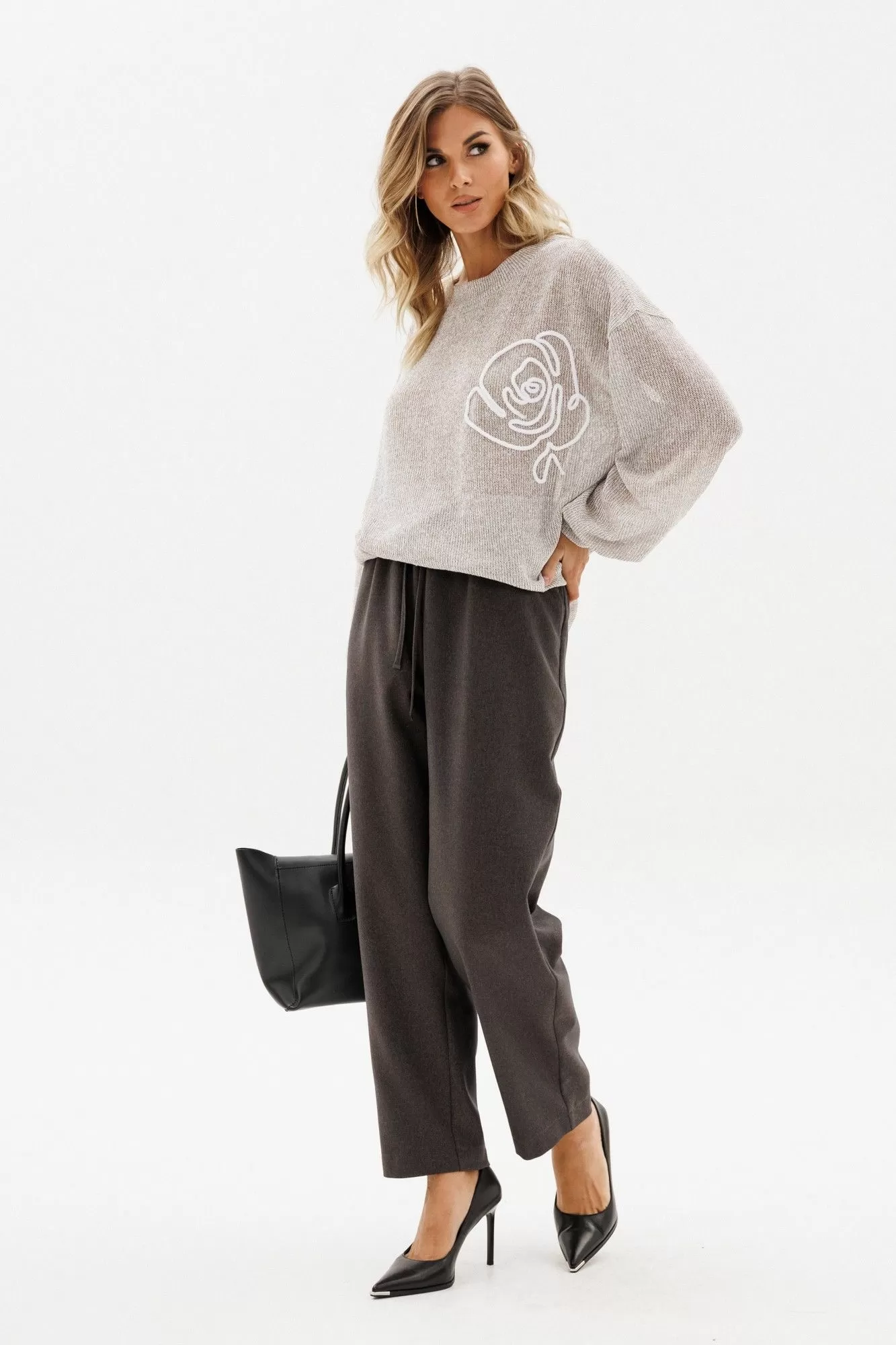 Джемпер выполнен из трикотажного полотна. Джемпер прямого силуэта, длиной до линии бедер. Перед и спинка цельные. Горловина округлой формы, обработана бейкой. Плечевой шов удлинен. Рукав рубашечного покроя, одношовный, расширенный и присборенный к низу. Низ рукава на манжете. Джемпер декорирован вышивкой шнуром по переду.