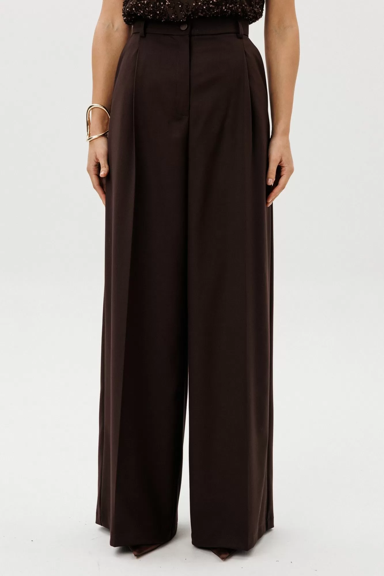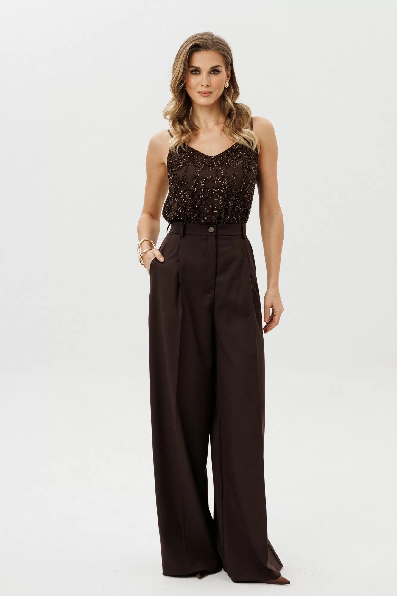 Брюки-палаццо выполнены из плательно-костюмной ткани. Брюки на притачном поясе, длиной в пол, расширенные к низу. Спереди складки и боковые карманы с наклонным входом. Застежка спереди на молнию с гульфиком и пуговицу. На задних частях обработаны талиевые вытачки.