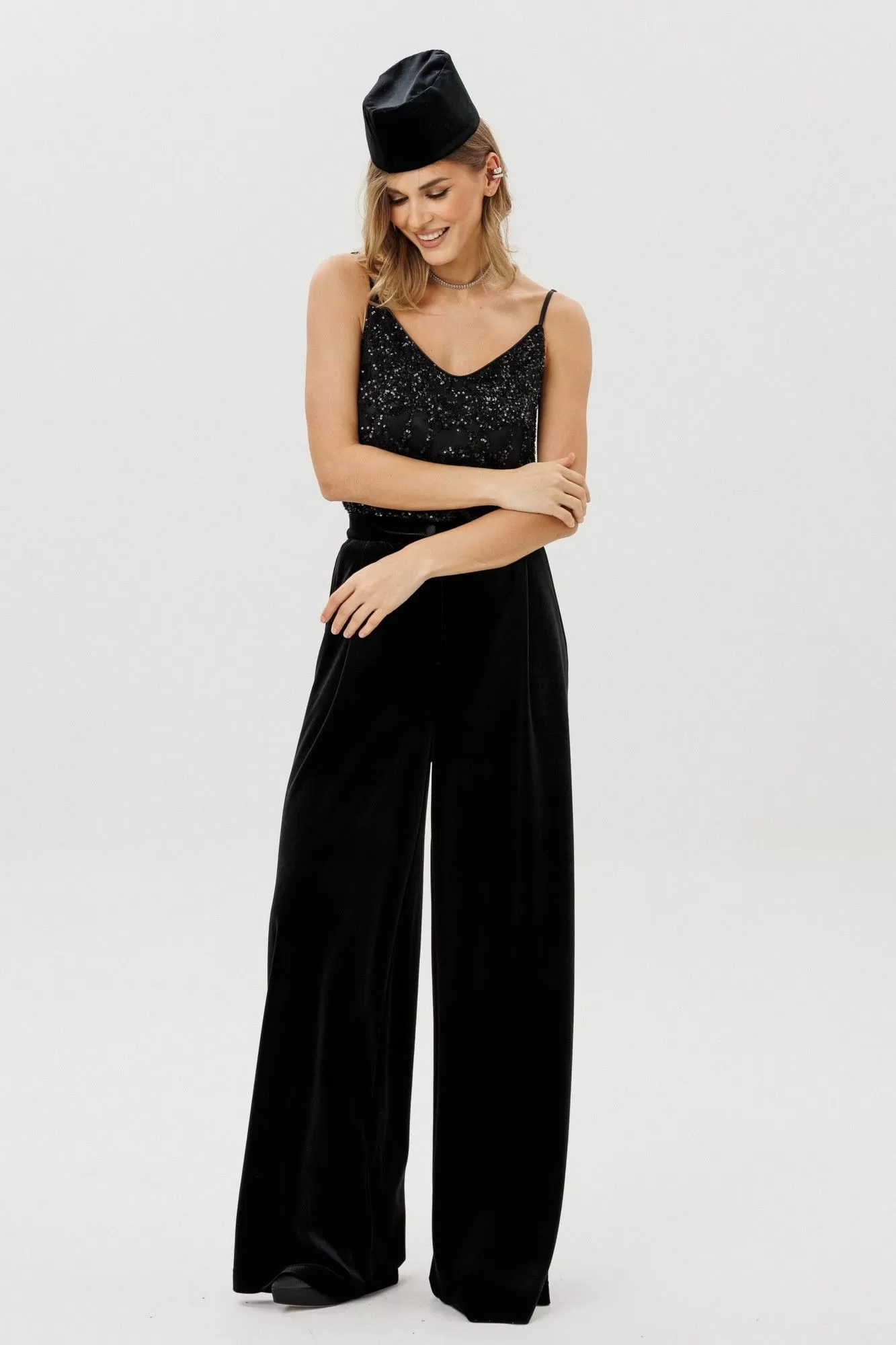 Брюки-палаццо выполнены из бархата. Брюки на притачном поясе, длиной в пол, расширенные к низу. Спереди складки и боковые карманы с наклонным входом. Застежка спереди на молнию с гульфиком и пуговицу. На задних частях обработаны талиевые вытачки.