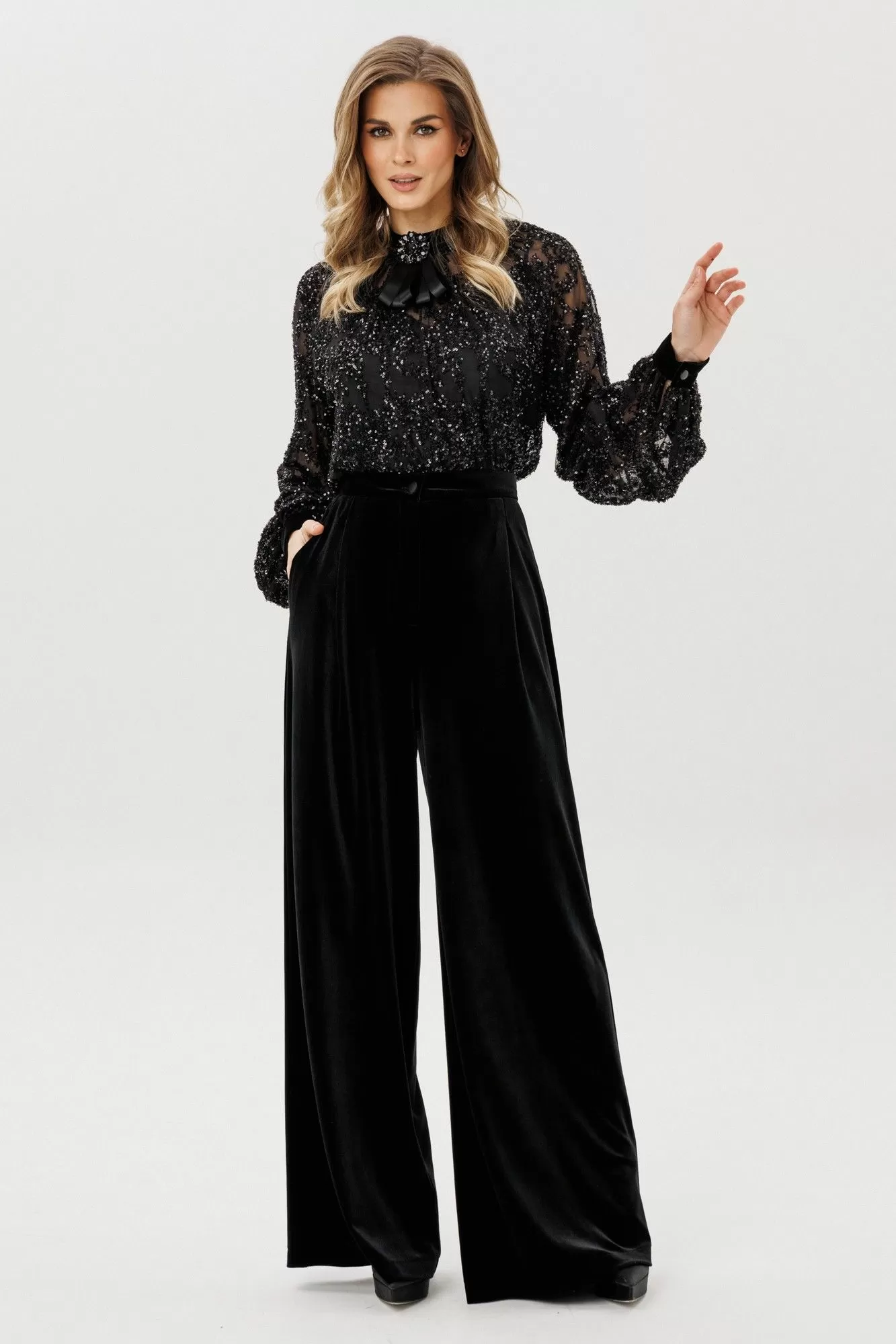 Брюки-палаццо выполнены из бархата. Брюки на притачном поясе, длиной в пол, расширенные к низу. Спереди складки и боковые карманы с наклонным входом. Застежка спереди на молнию с гульфиком и пуговицу. На задних частях обработаны талиевые вытачки.