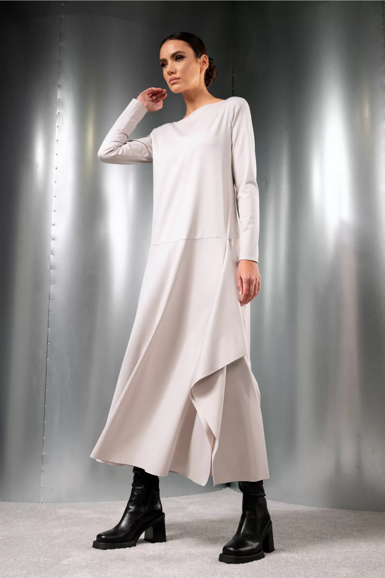 Платье расклешенное с отрезной частью по линии бедер.С левой стороны платья оригинальный защип имитирующий волан.В боковом шве справа карман.
