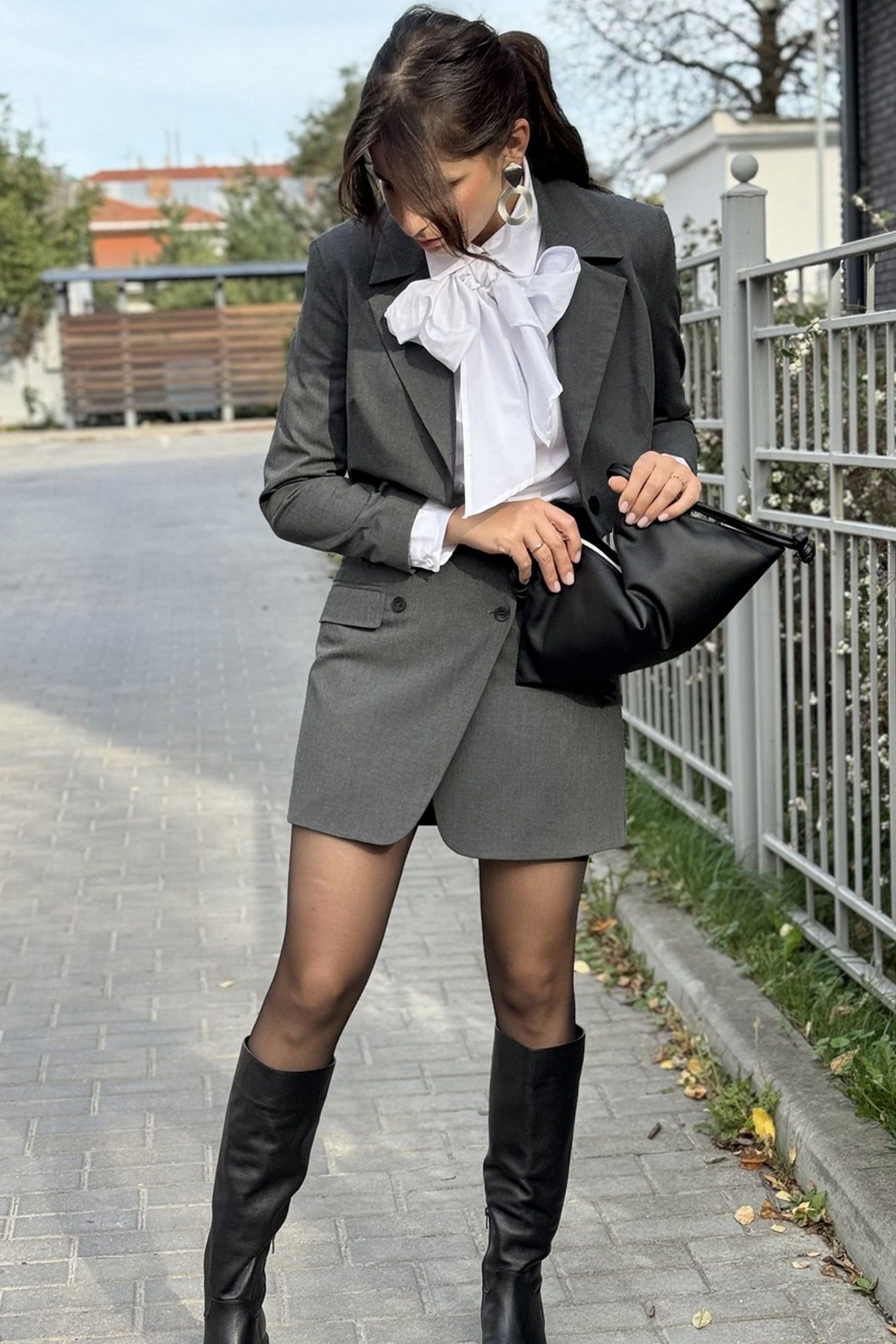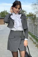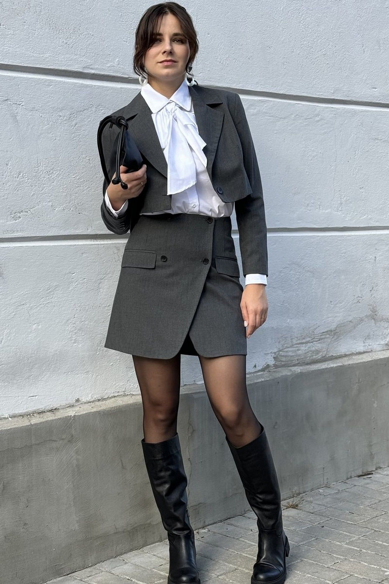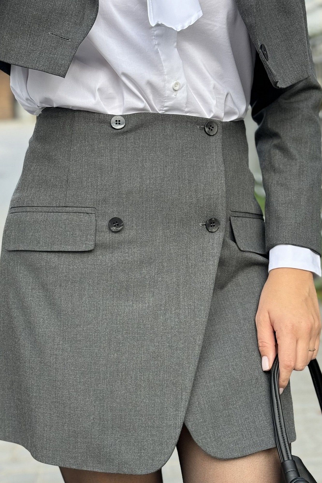 Элегантная мини-юбка на запах в универсальном темно-сером цвете станет идеальным дополнением вашего гардероба. Трапециевидный крой придает образу легкости и женственности, а застежка на пуговицы добавляет удобства и стильного акцента. Особенность модели — имитация клапана, которая придает ткани интересную текстуру. Сзади предусмотрены выточки для идеальной посадки по фигуре, обеспечивая комфорт и утонченность. Юбка выполнена на подкладке, что гарантирует комфорт в носке и износостойкость. Для создания гармоничного образа вы можете дополнить юбку жакетом или брюками такого же оттенка, которые также представлены в нашей коллекции. Создайте стильный комплект для офиса или особого случая! На рост 170см. Параметры модели: рост- 173 см, ог 90, от 74, об 98, на модели р. 44. Обмеры готового изделия: 42р - от(66см), об(92см); 44р - от(72см), об(98см); 48р – от(76см), об(104см); р50 от(80см), об(108см).