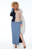 Костюм женский выполнен из костюмной ткани с небольшой растяжимостью состоит из джемпера и длинной юбки. Джемпер свободного кроя по переду джемпера расположена молния и нагрудные вытачки. Рукав втачной по низу рукава расположена широкая манжета из основной ткани. горловина высокая с капюшоном. Низ джемпера обработан манжетой с резинкой. Юбка длинная с высокими разрезам с двух сторон застегивающимися на потайную молнию.