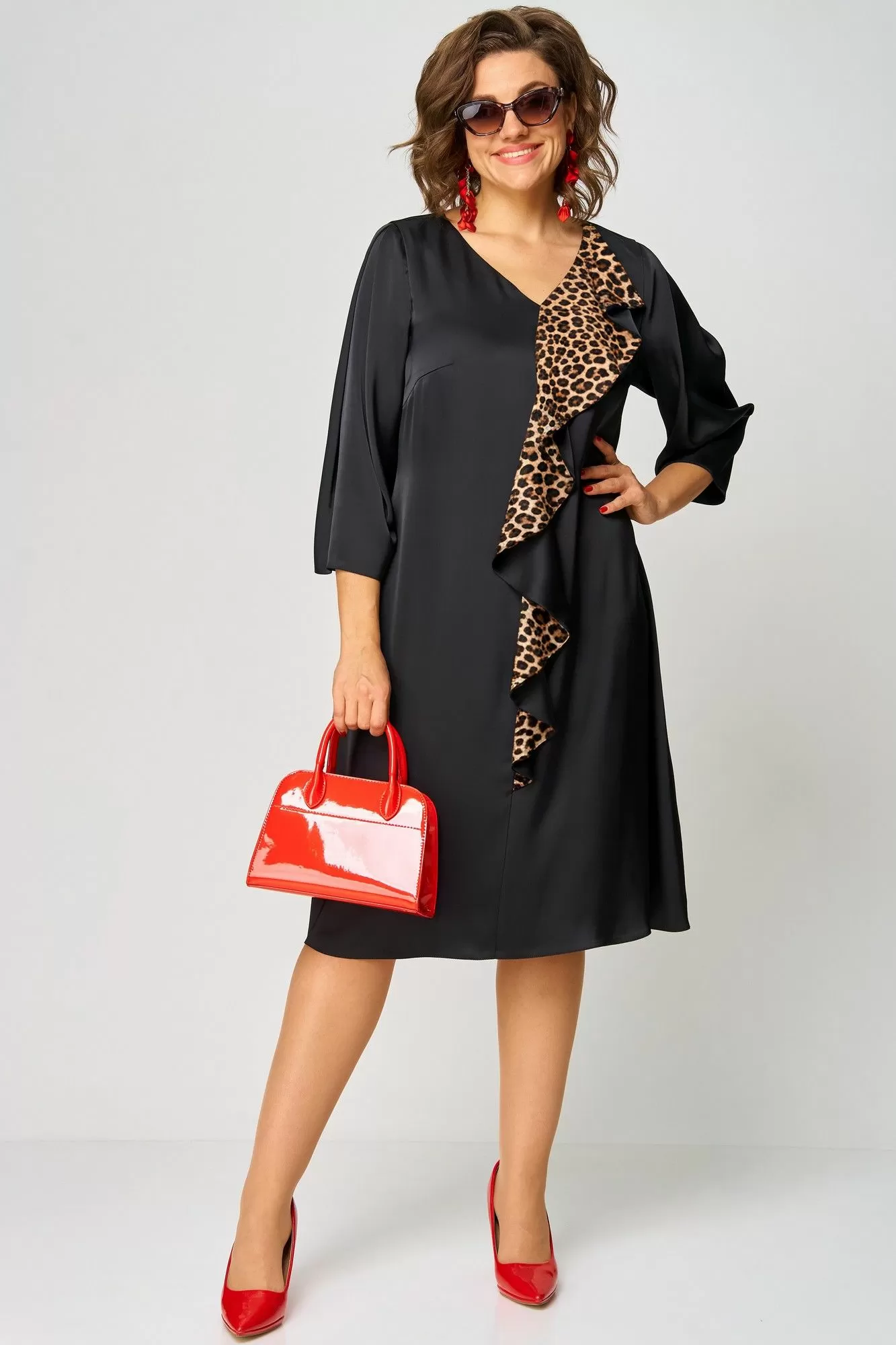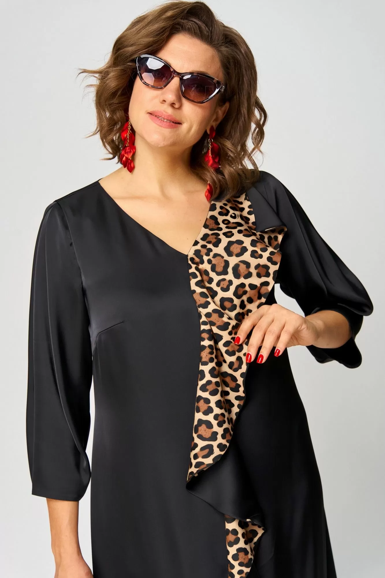 Платье женское А-образного силуэта, выполнено из плательной ткани в сочетании с отделкой. Вырез горловины V-образный обработан обтачкой. Рукав втачной 7/8, со встречной складкой по центру. От плеча по левой стороне переходящее по центру платья вставлен отделочный элемент в виде волана.