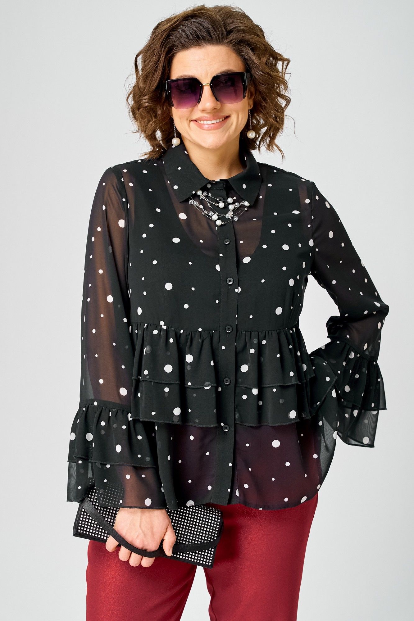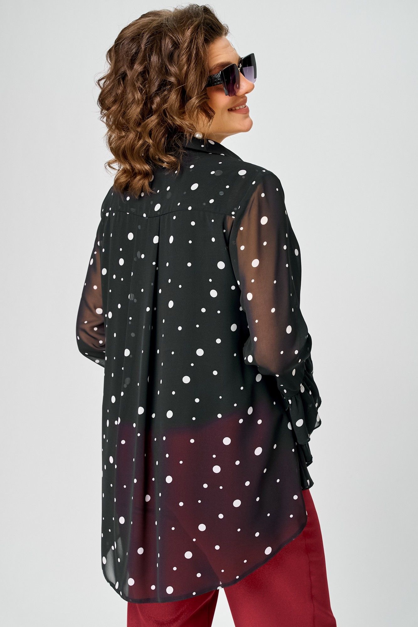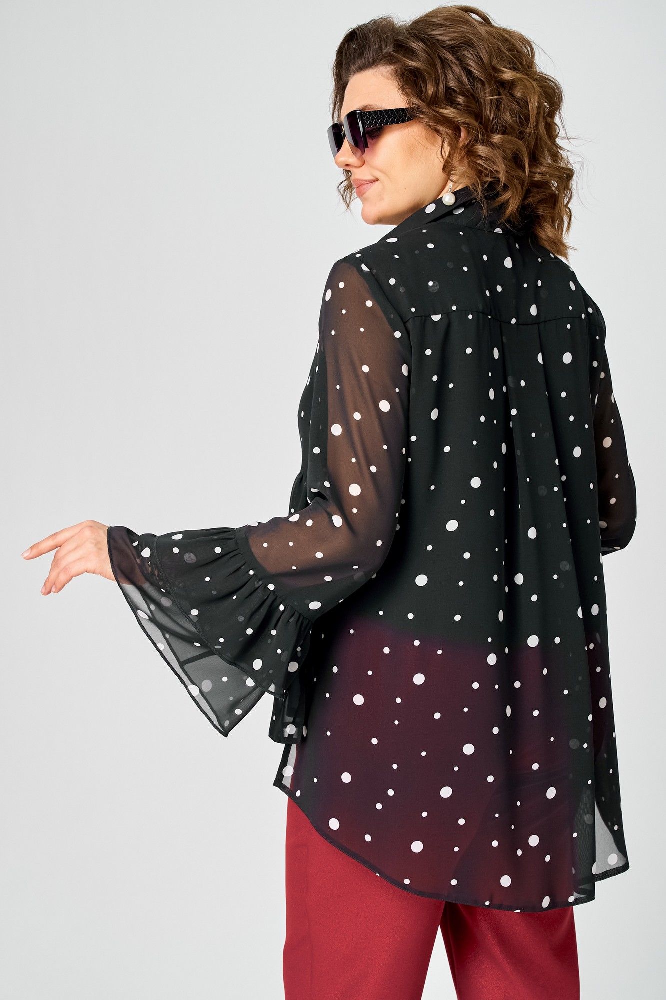 Блуза женская шикарная нарядно - повседневнаая полуприлегающего силуэта на подклдке, выполнена из красивого шифона с принтом. Вырез горловины воротник на стойке рубашечного типа, рукав втачной по низу с притачными воланми. Застежка доверху на обметанные петли и пуговицы, низ блузы фигурный (по спинке длиннее). По переду блузы притачные воланы, в боковых швах обработаны разрезы. Декором блузы служит принт амой ткани и отделочные элементы в виде воланов.