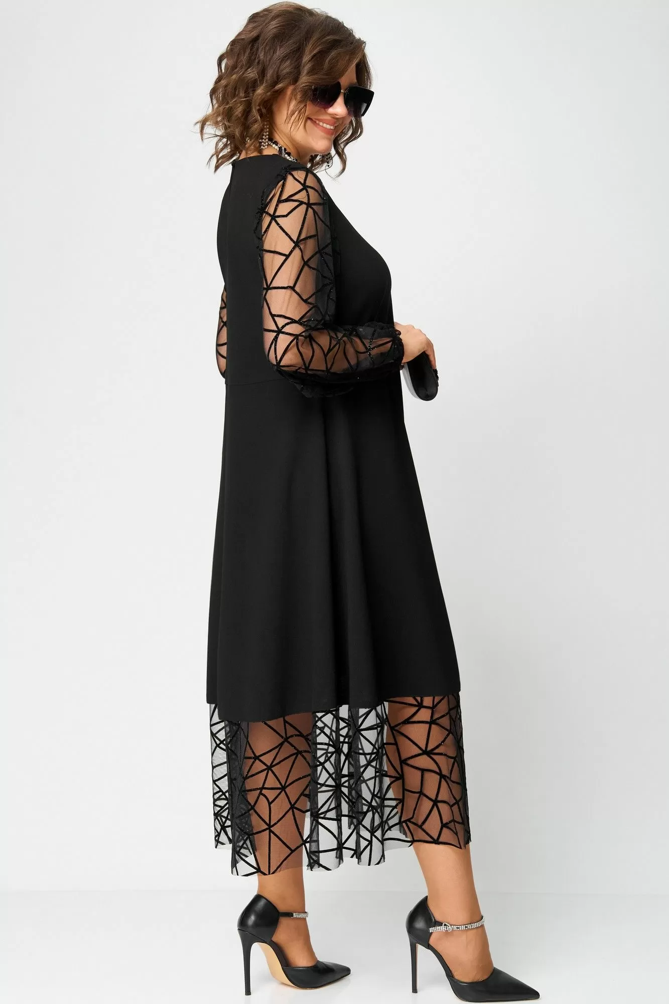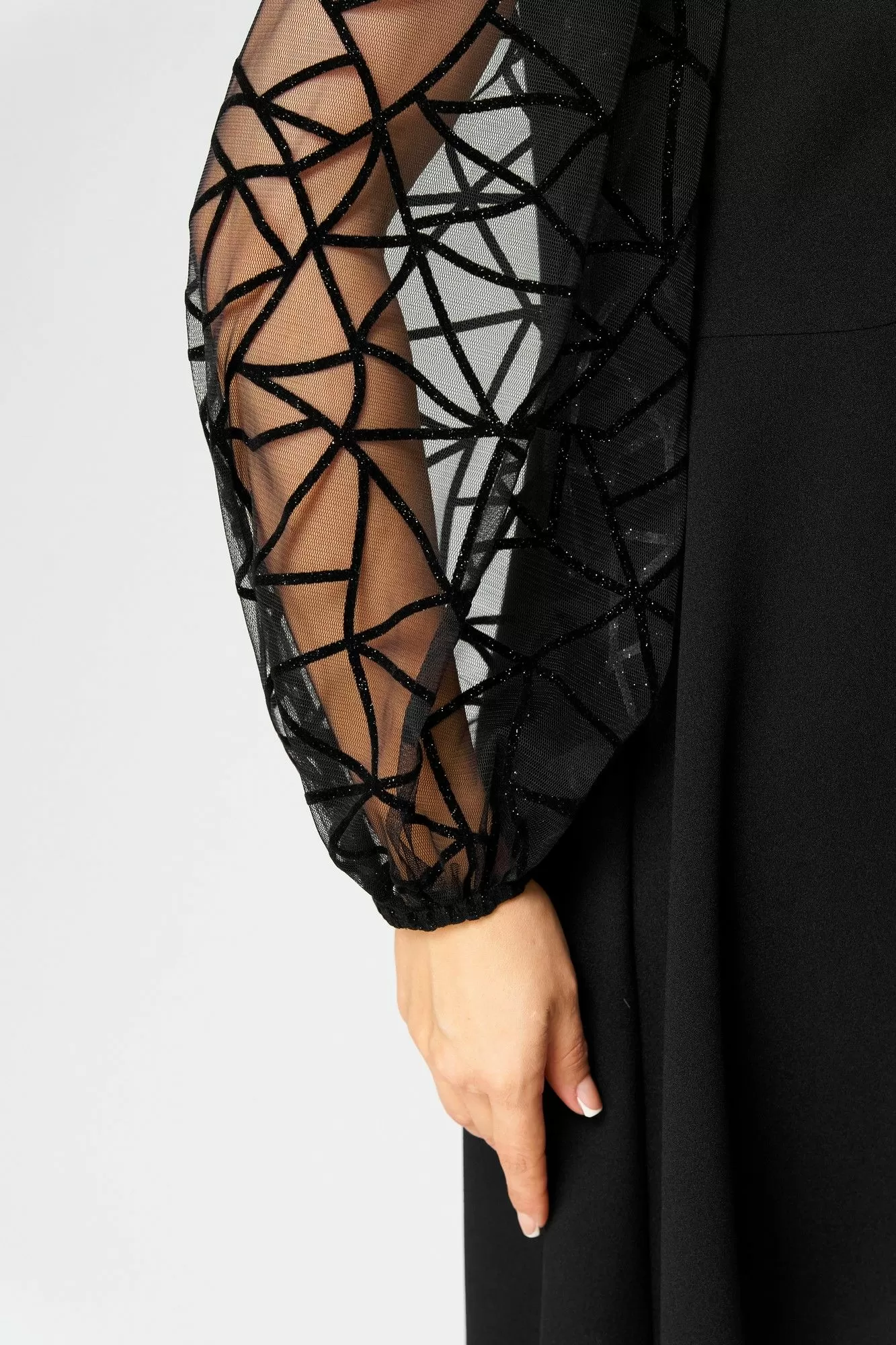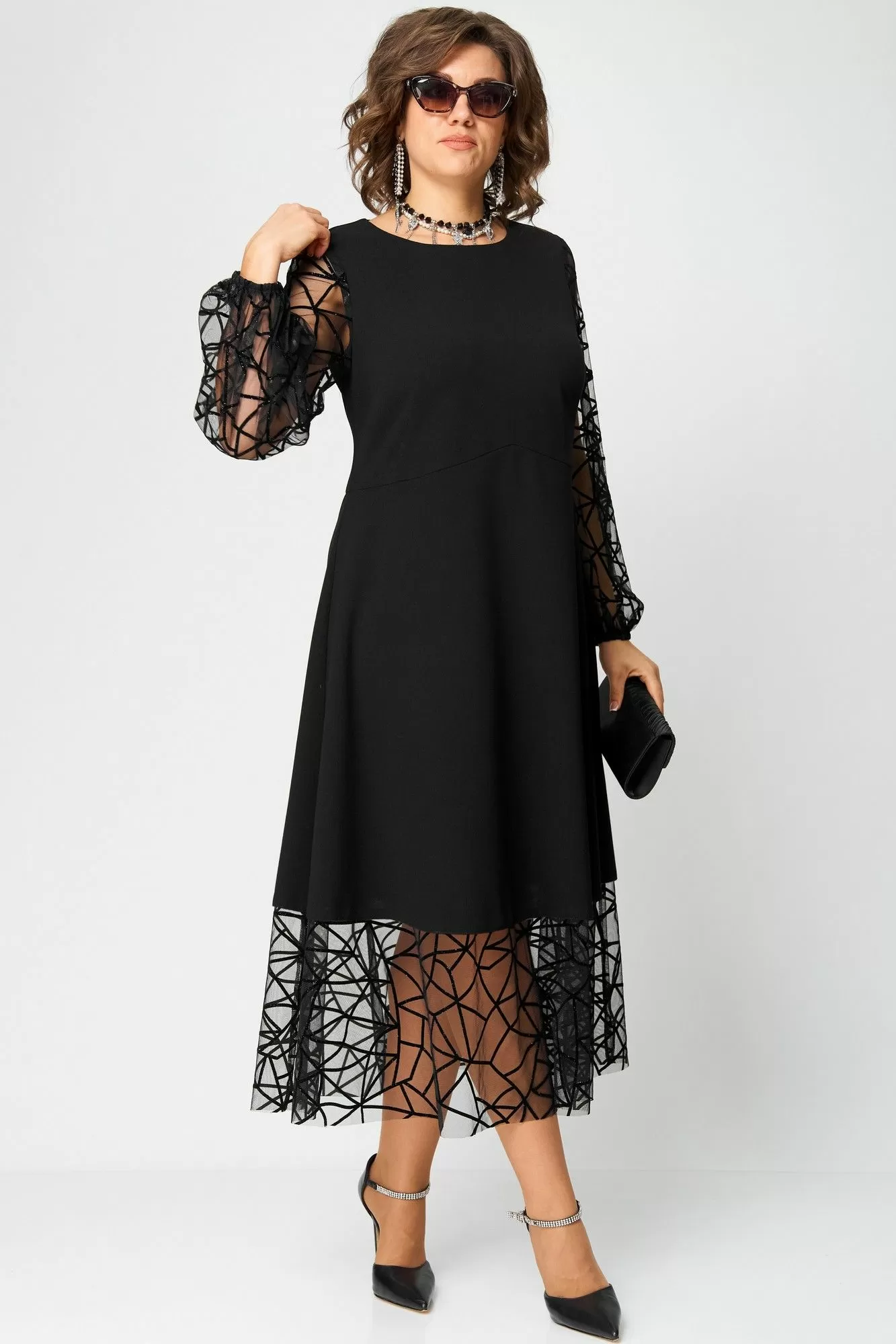 Платье шикарное женское нарядное вечернее полуприлегающего силуэта расширенное к низу, выполнено из плательного крепа в сочетании с сеткой с принтом в виде паутинки. Вырез горловины круглый на обтаке, по пинке застежка на навесную петлю и пговицу. Рукав втачной из сетки по низ собрн на резинку. Платье с фигурным подрезом по полочке, по низу притачной волан из сетки. Декором служит красивая нарядная отделочная ткань на рукавах и волане.