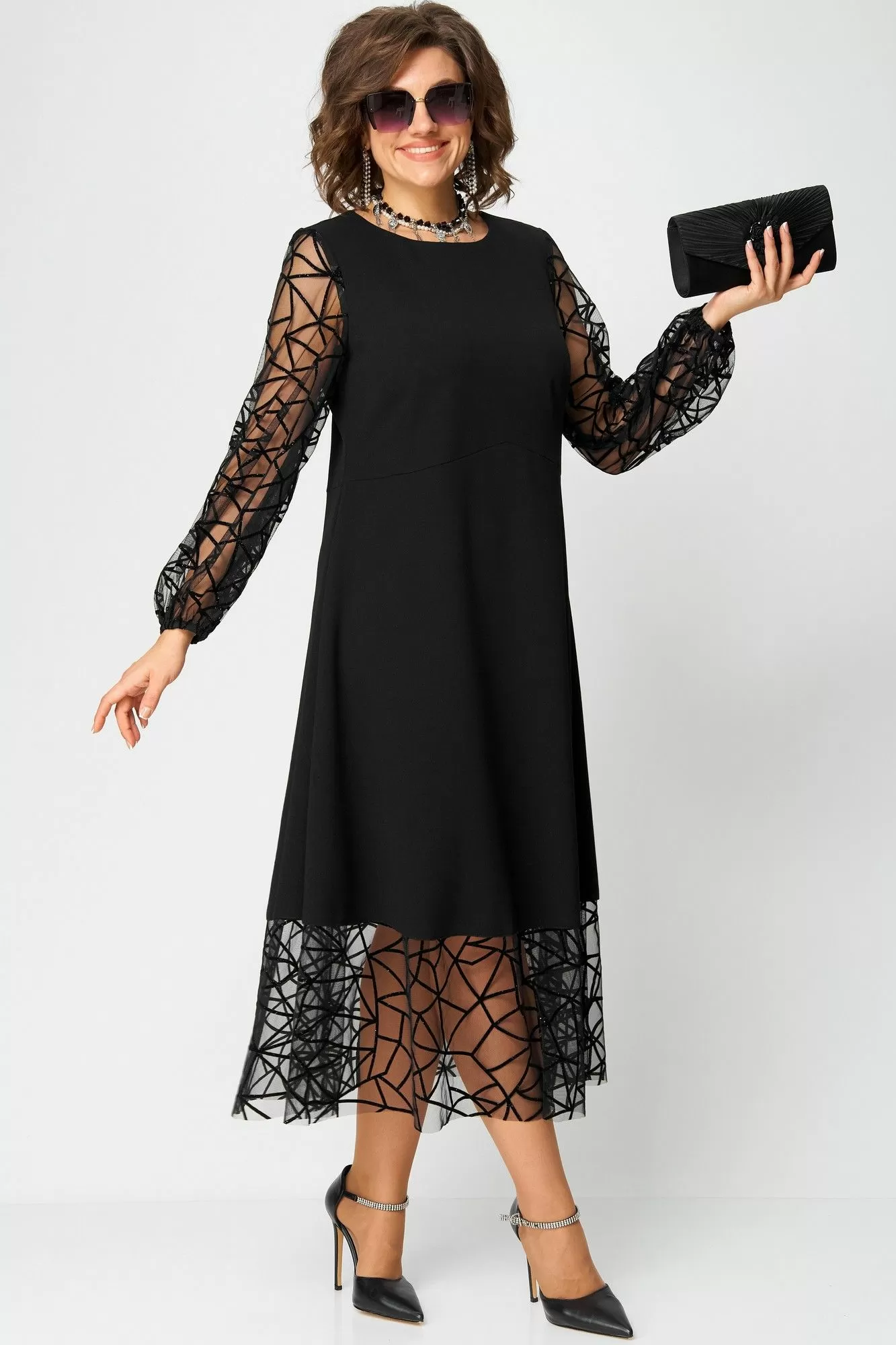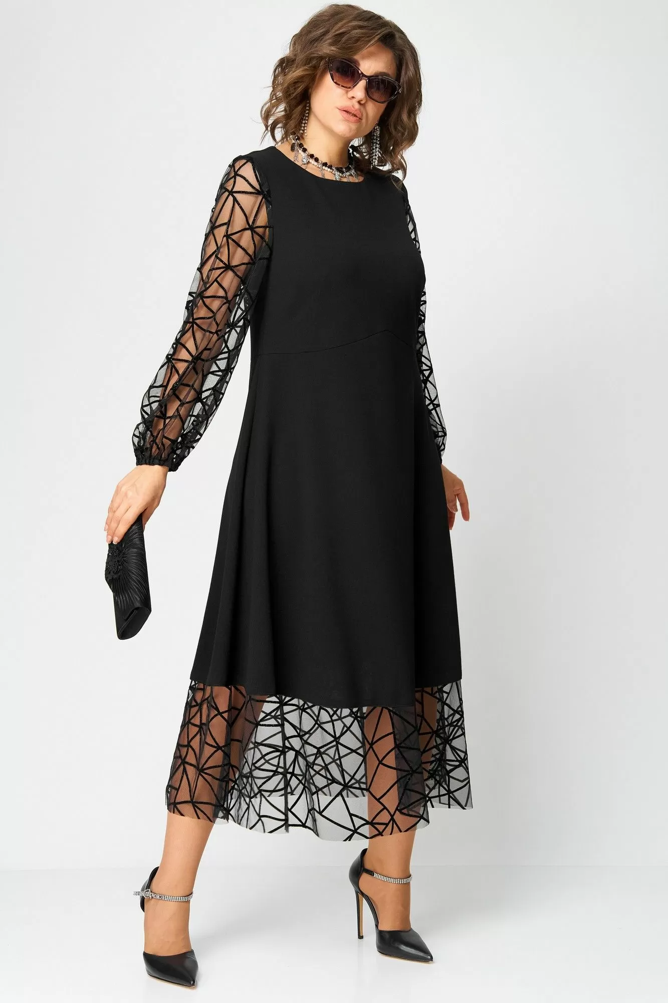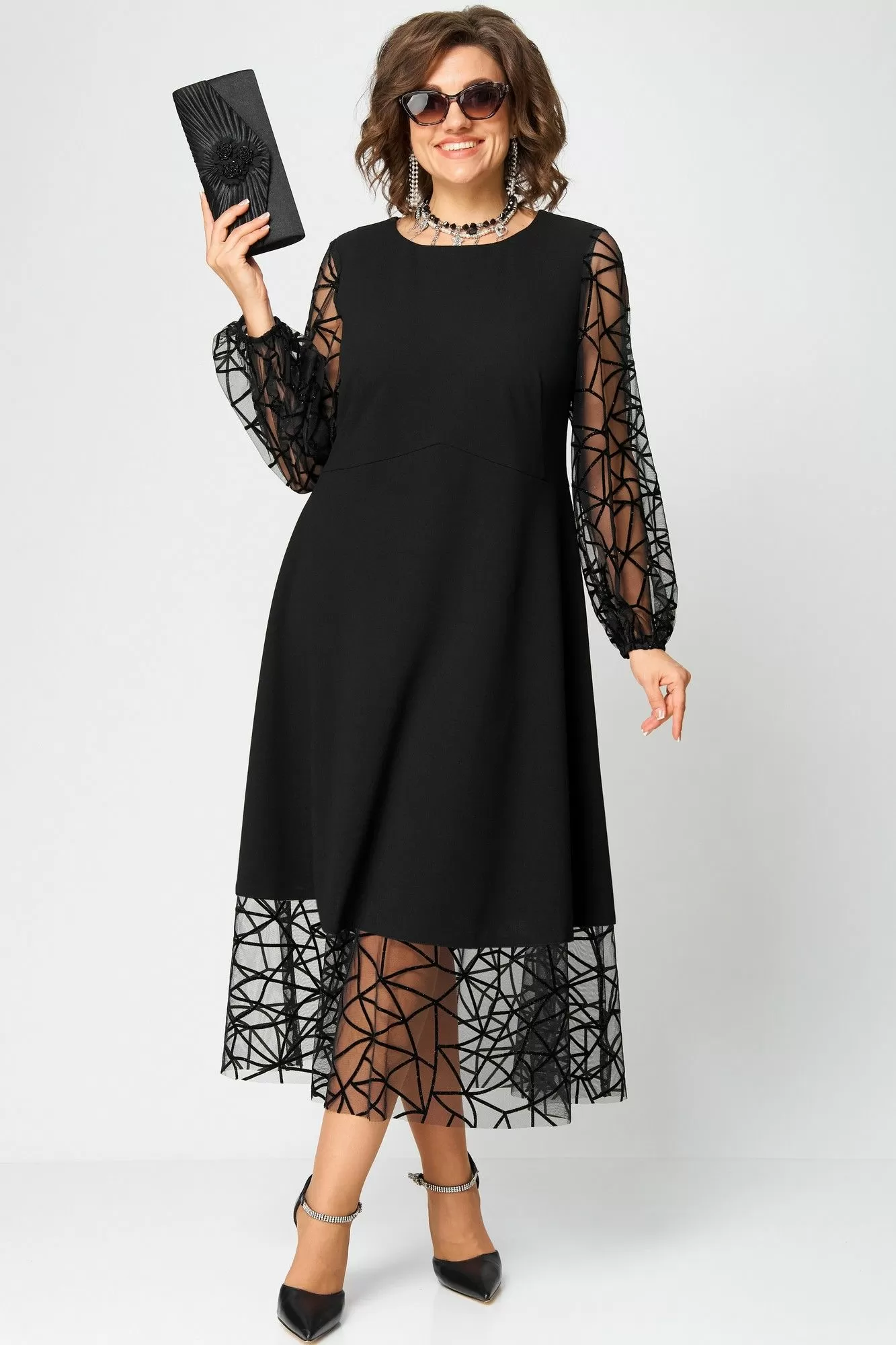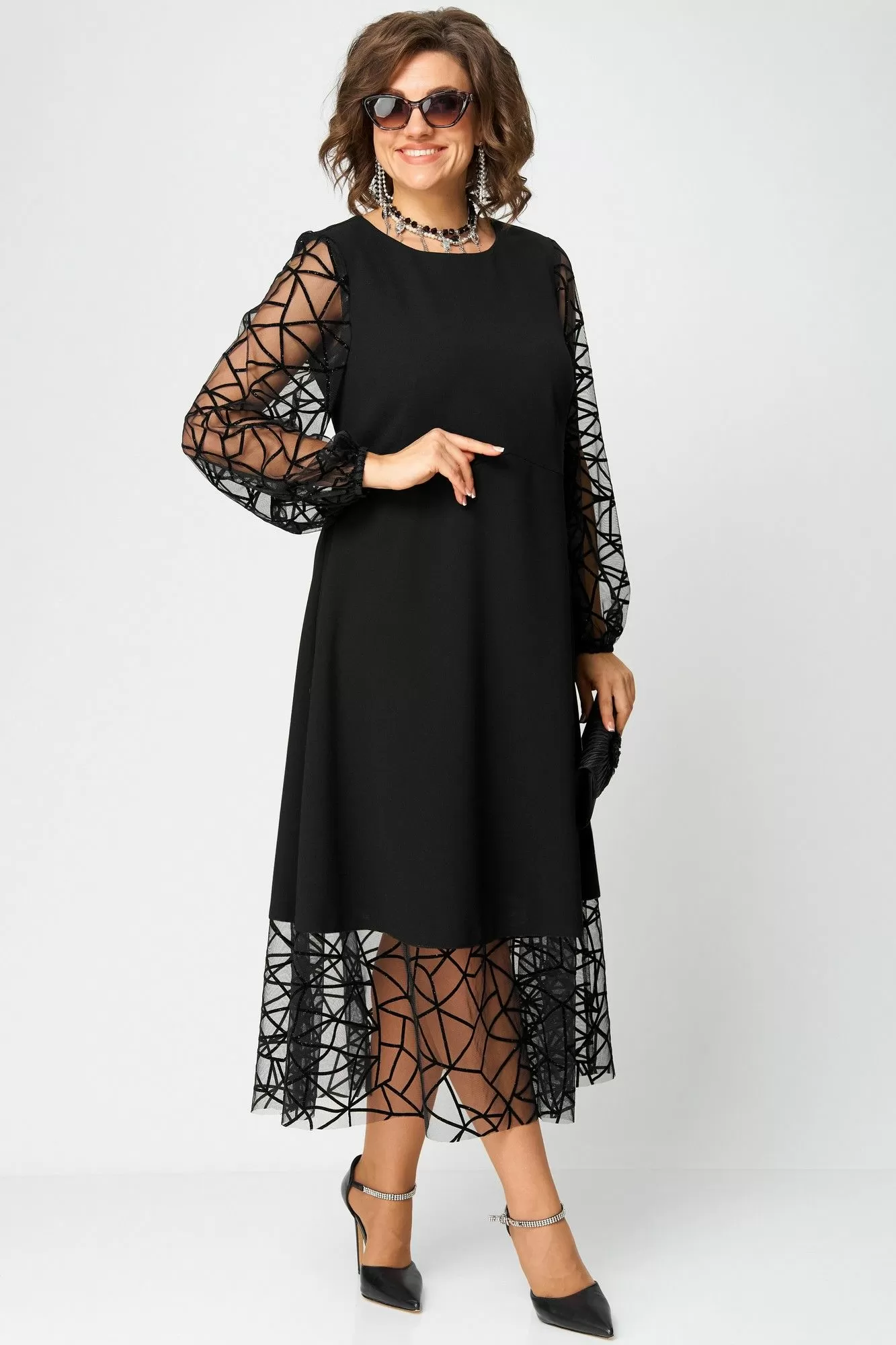 Платье шикарное женское нарядное вечернее полуприлегающего силуэта расширенное к низу, выполнено из плательного крепа в сочетании с сеткой с принтом в виде паутинки. Вырез горловины круглый на обтаке, по пинке застежка на навесную петлю и пговицу. Рукав втачной из сетки по низ собрн на резинку. Платье с фигурным подрезом по полочке, по низу притачной волан из сетки. Декором служит красивая нарядная отделочная ткань на рукавах и волане.