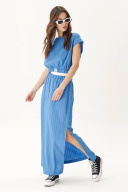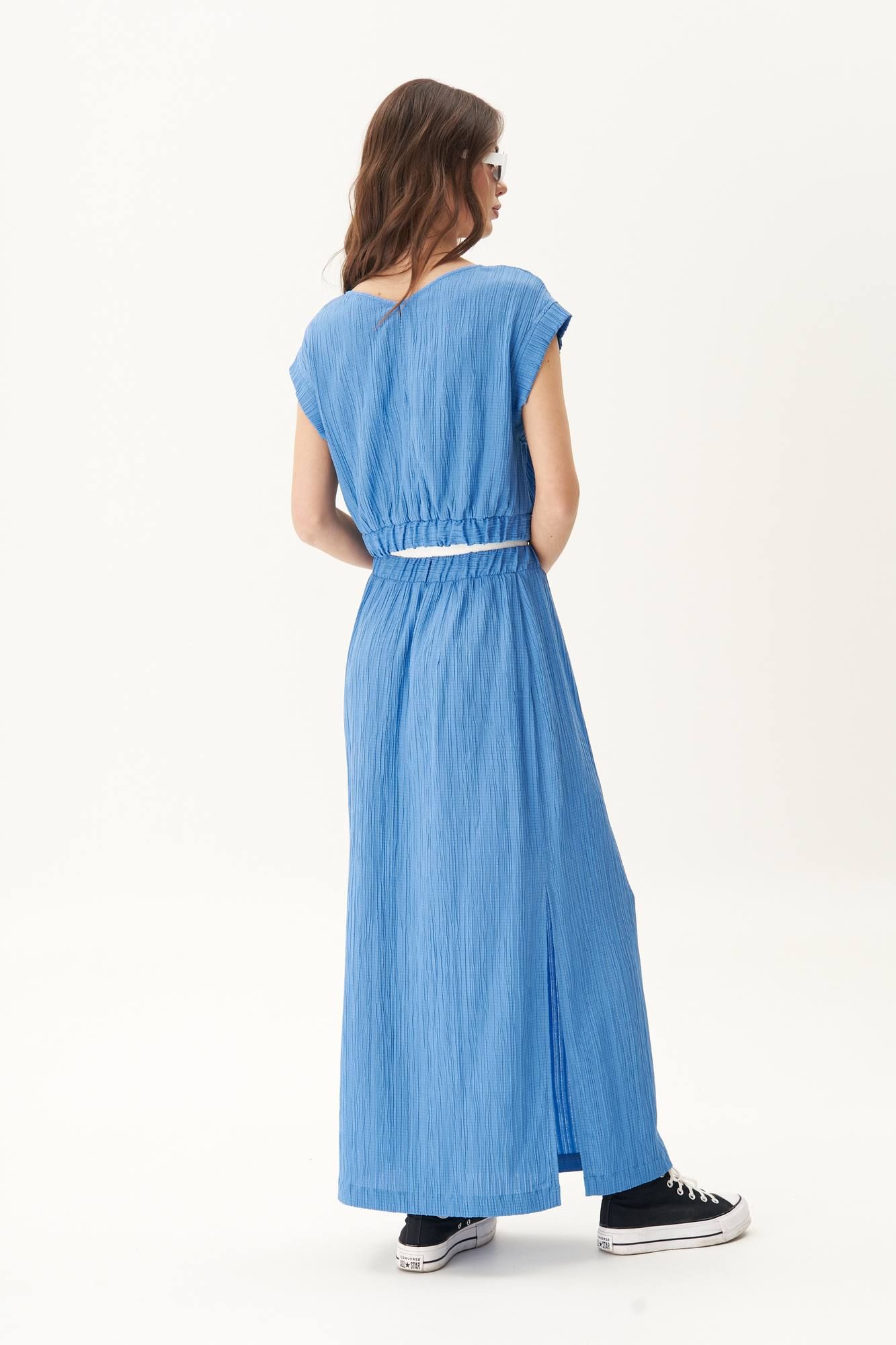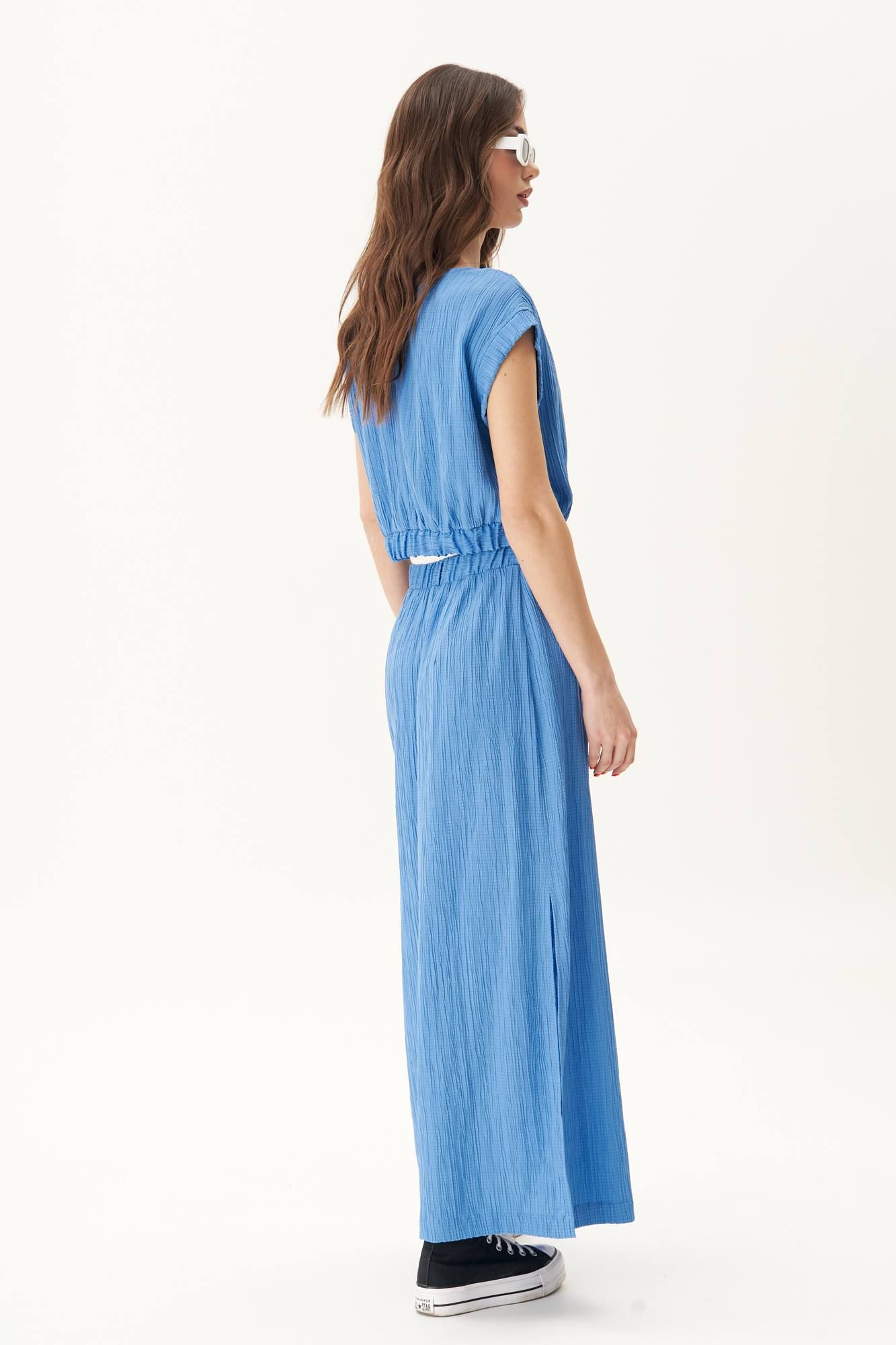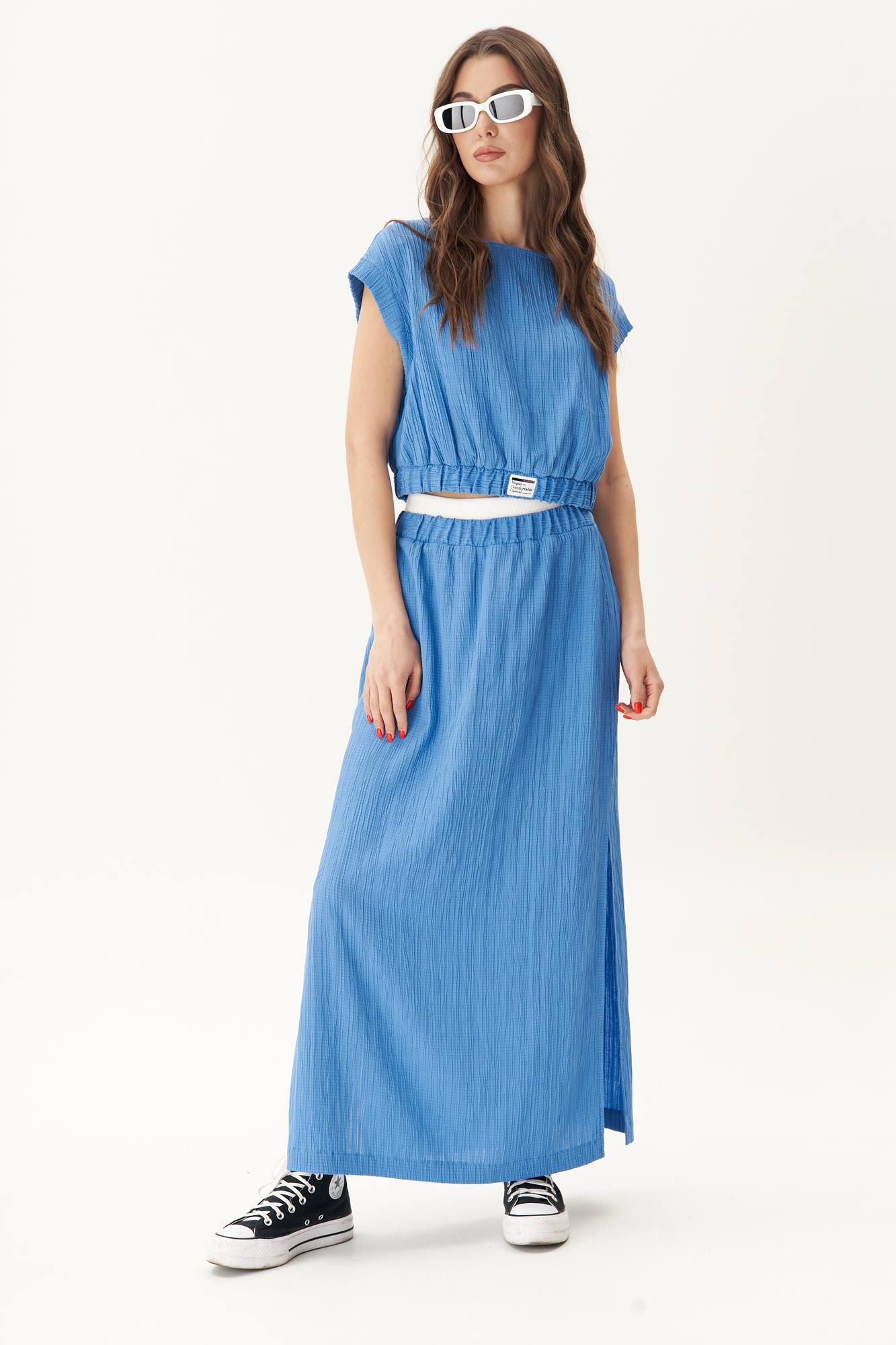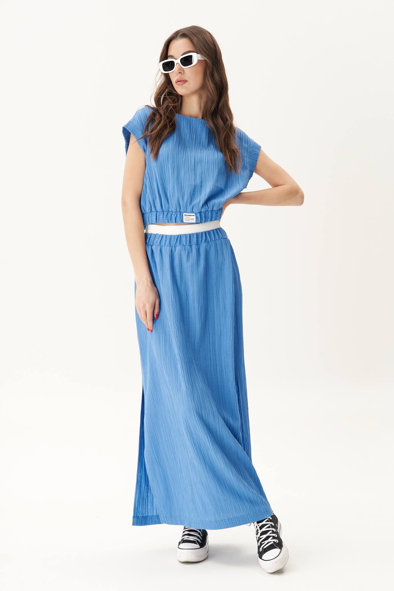 Секрет успеха костюма заключается не только в его красоте, но и в комфорте, в возможности создавать многогранные луки и сногсшибательные ансамбли. Комплект состоит из укороченной блузы-топа и юбки. Такие модели всегда смотрятся стильно и женственно. Форма топа-упрямлённая с широкой эластичной тесьмой по линии низа. Вырез горловины в форме лодочки по переду и с углом по спинке. Застёжка сзади на потайную пуговку с разрезом-капелькой в среднем шве спинки. Спущенная линия проймы оформлена широкой полоской. Юбка прямая, длинная с высокими разрезами в боковых швах. Пояс притачной с эластичной широкой тесьмой по спинке - для лучшей посадки на любой талии. Для удобства эксплуатации - карманы в боковых швах. Длина блузы-топа по спинке около 44 см. Длина юбки около 90 см