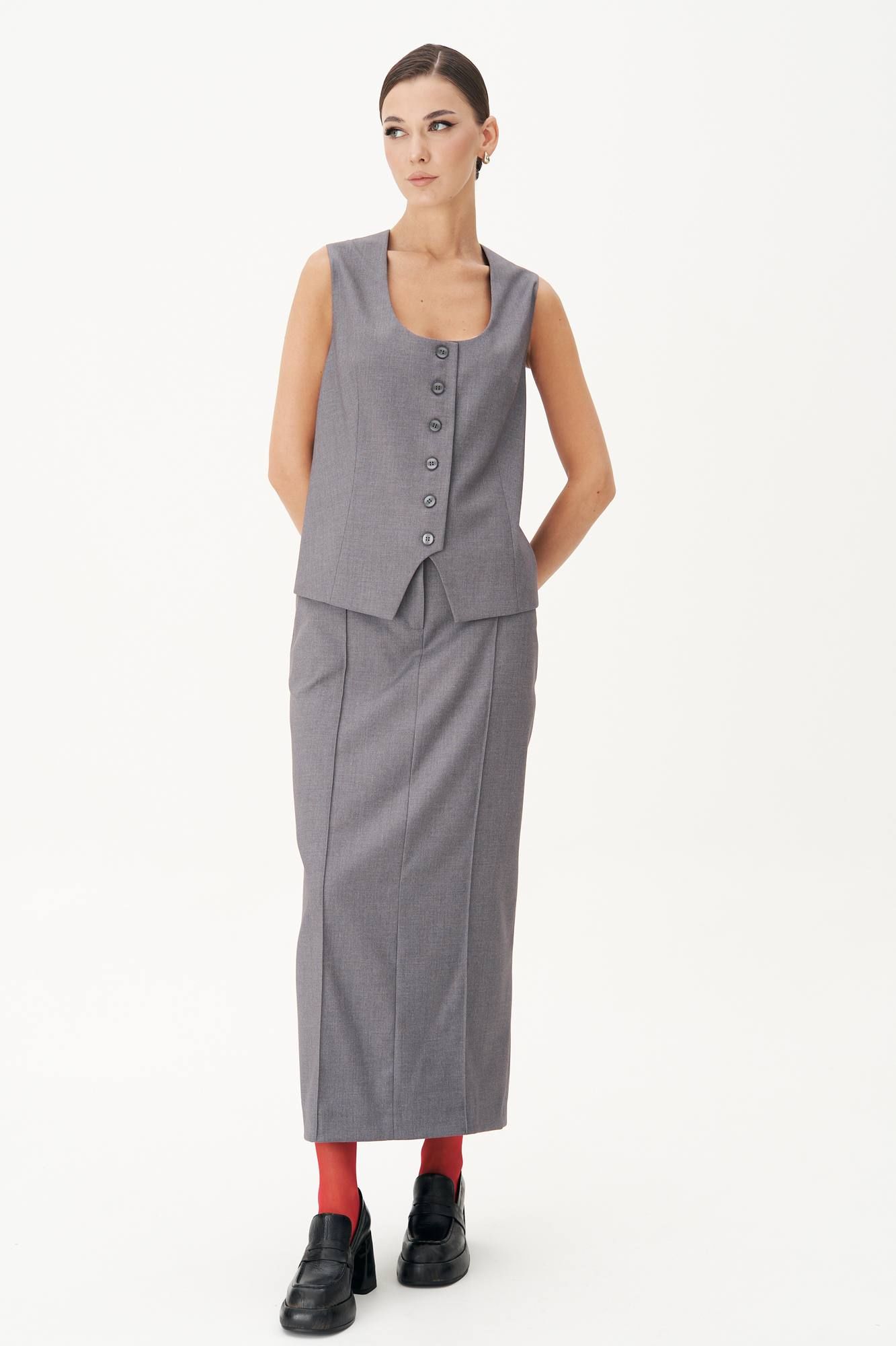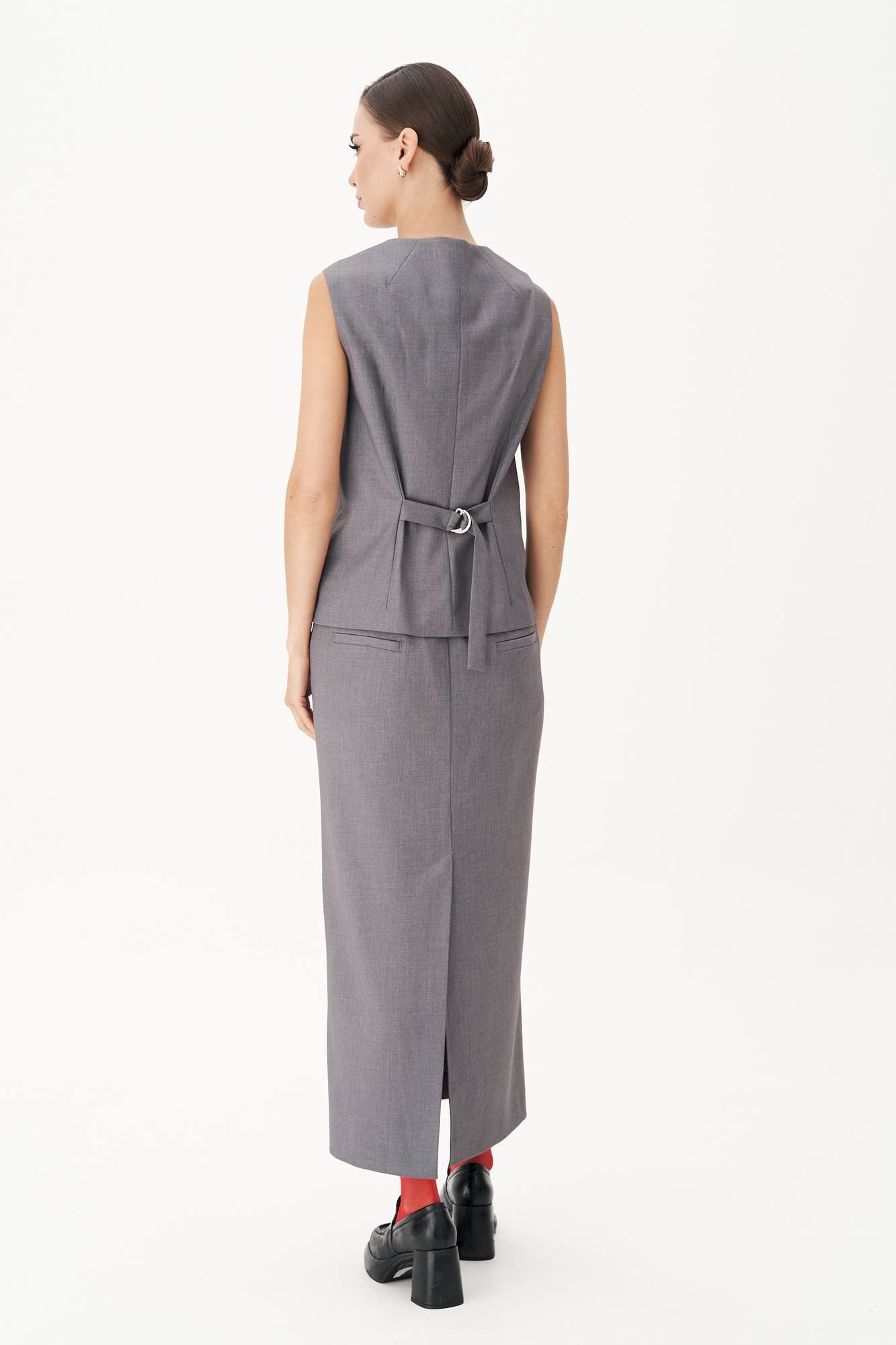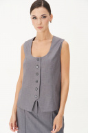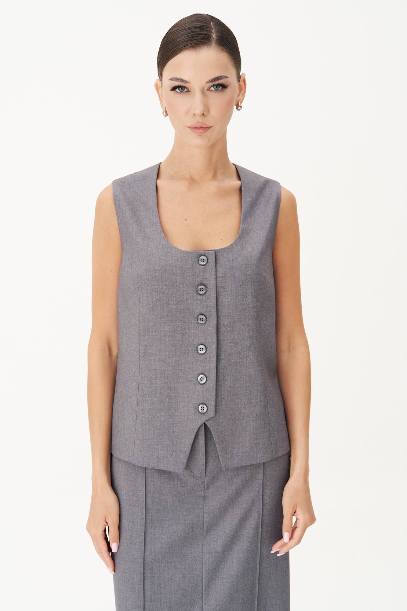 Классический удлинённый жилет полуприлегающего силуэта с центральной застёжкой на петли и пуговицы, нагрудной вытачкой от линии низа, фигурным бортом и овальным вырезом. Спина с центральным швом, талиевой и плечевой вытачкой и отделочным хлястиком, подчёркивающим талию, регулирующимся поясом с полукольцами. Длина жилета около 68 см.