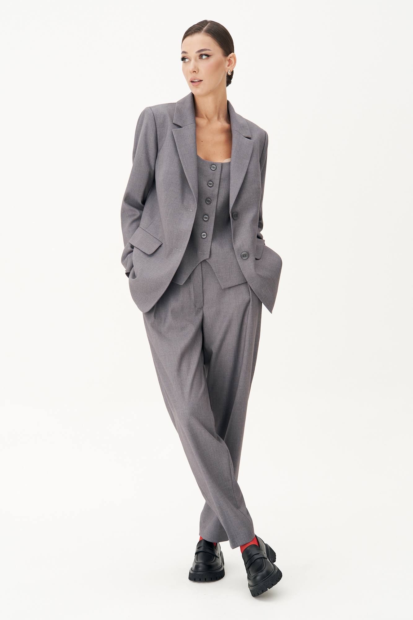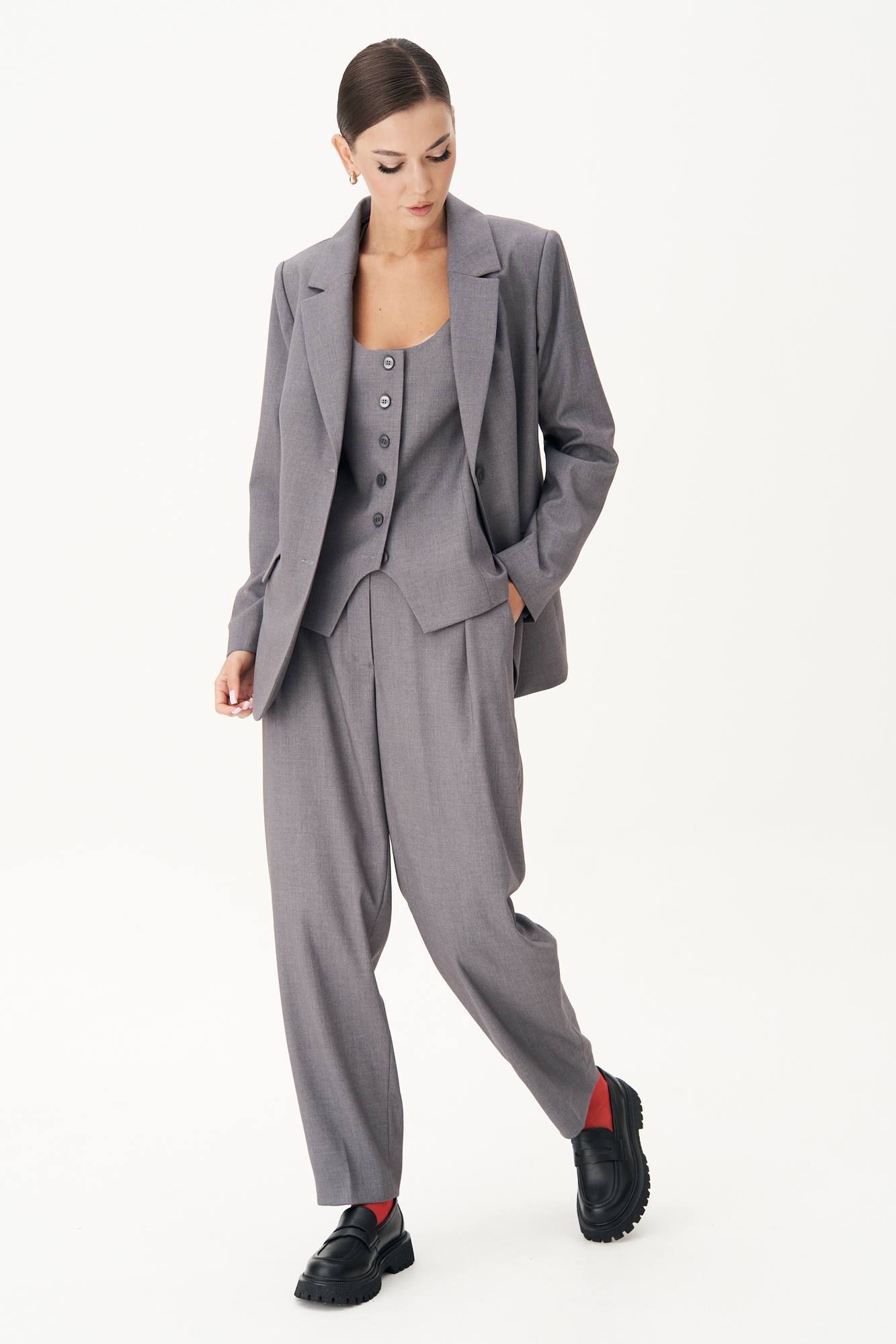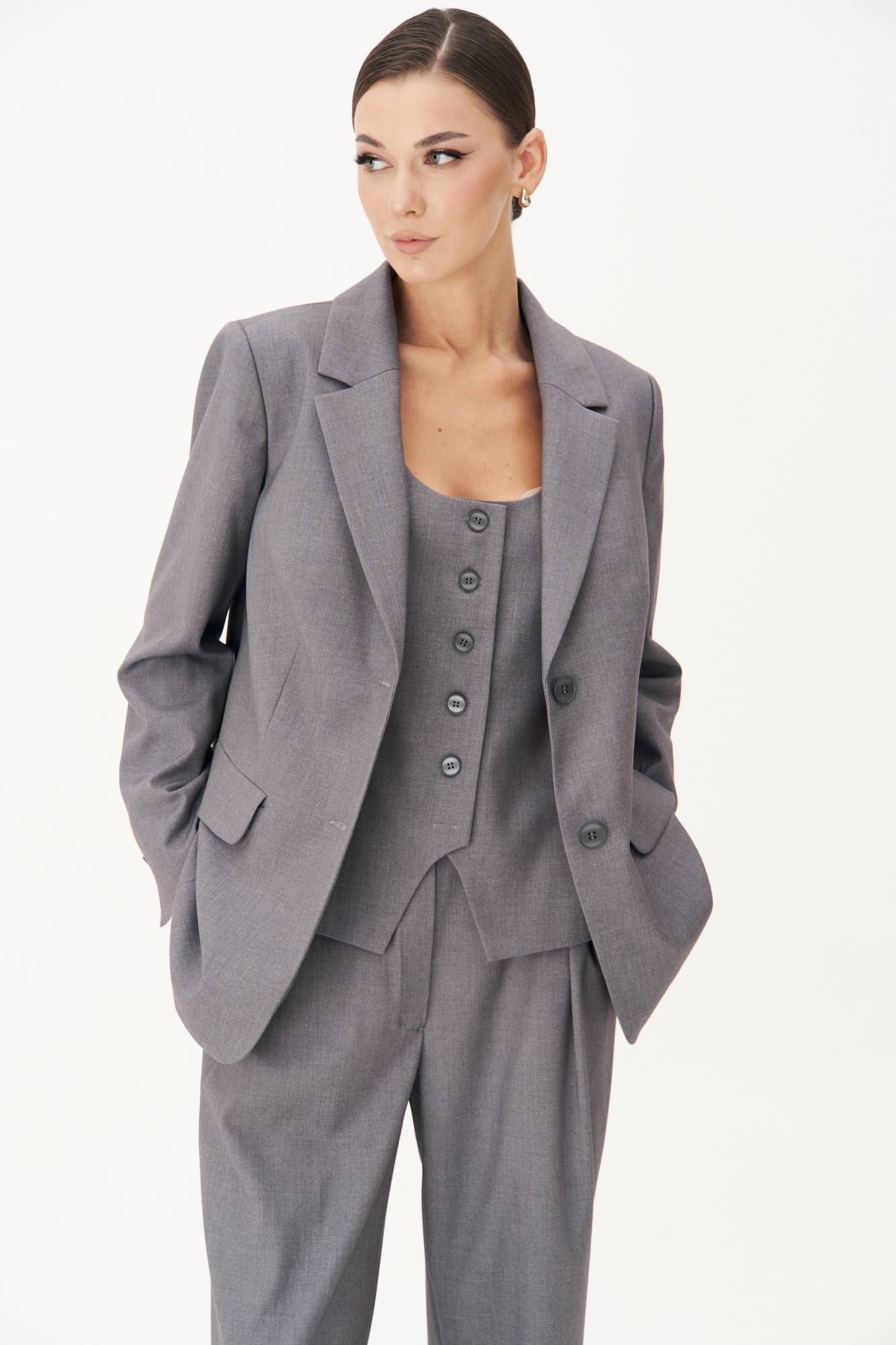 Классический удлинённый жилет полуприлегающего силуэта с центральной застёжкой на петли и пуговицы, нагрудной вытачкой от линии низа, фигурным бортом и овальным вырезом. Спина с центральным швом, талиевой и плечевой вытачкой и отделочным хлястиком, подчёркивающим талию, регулирующимся поясом с полукольцами. Длина жилета около 68 см.