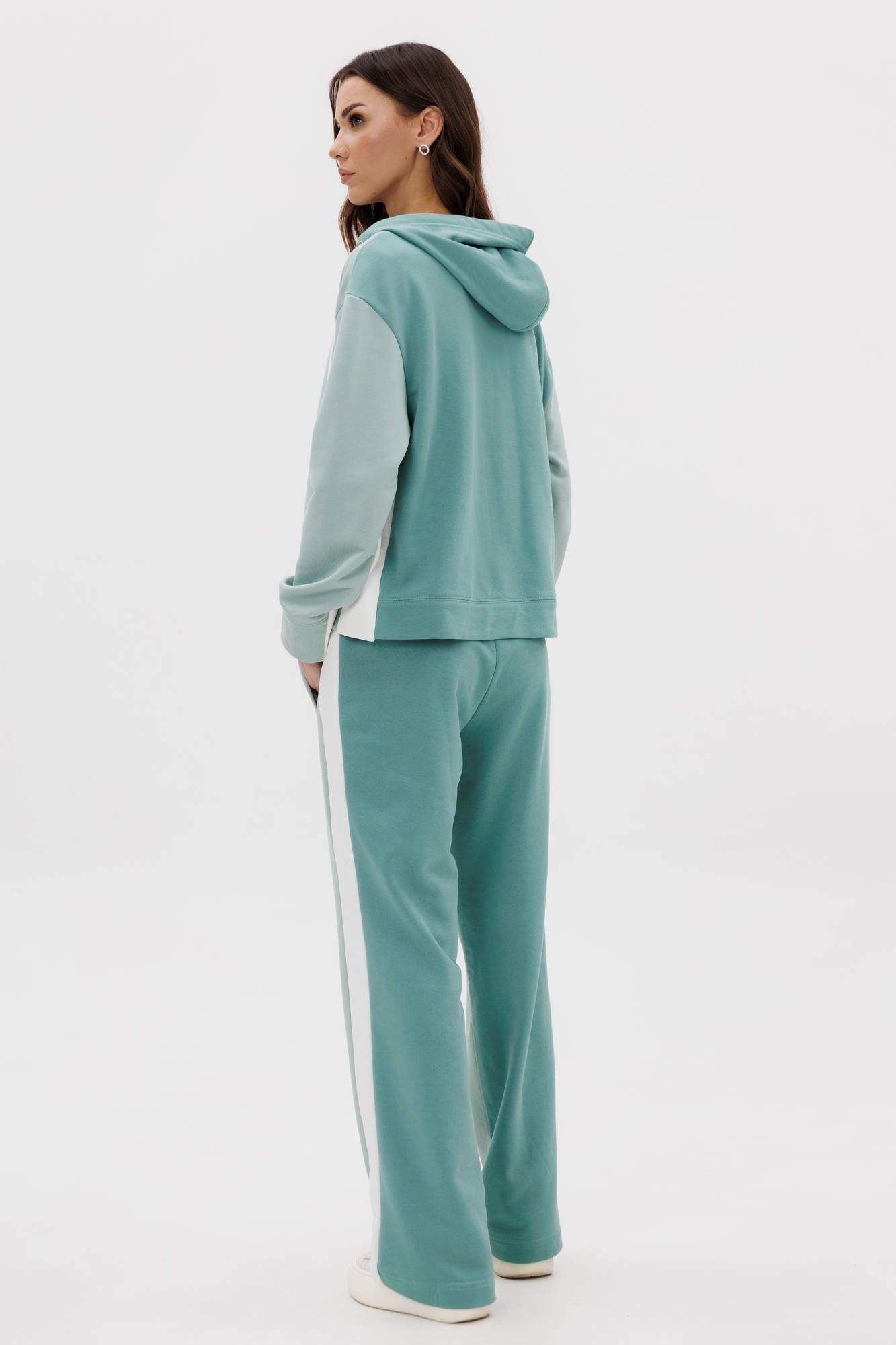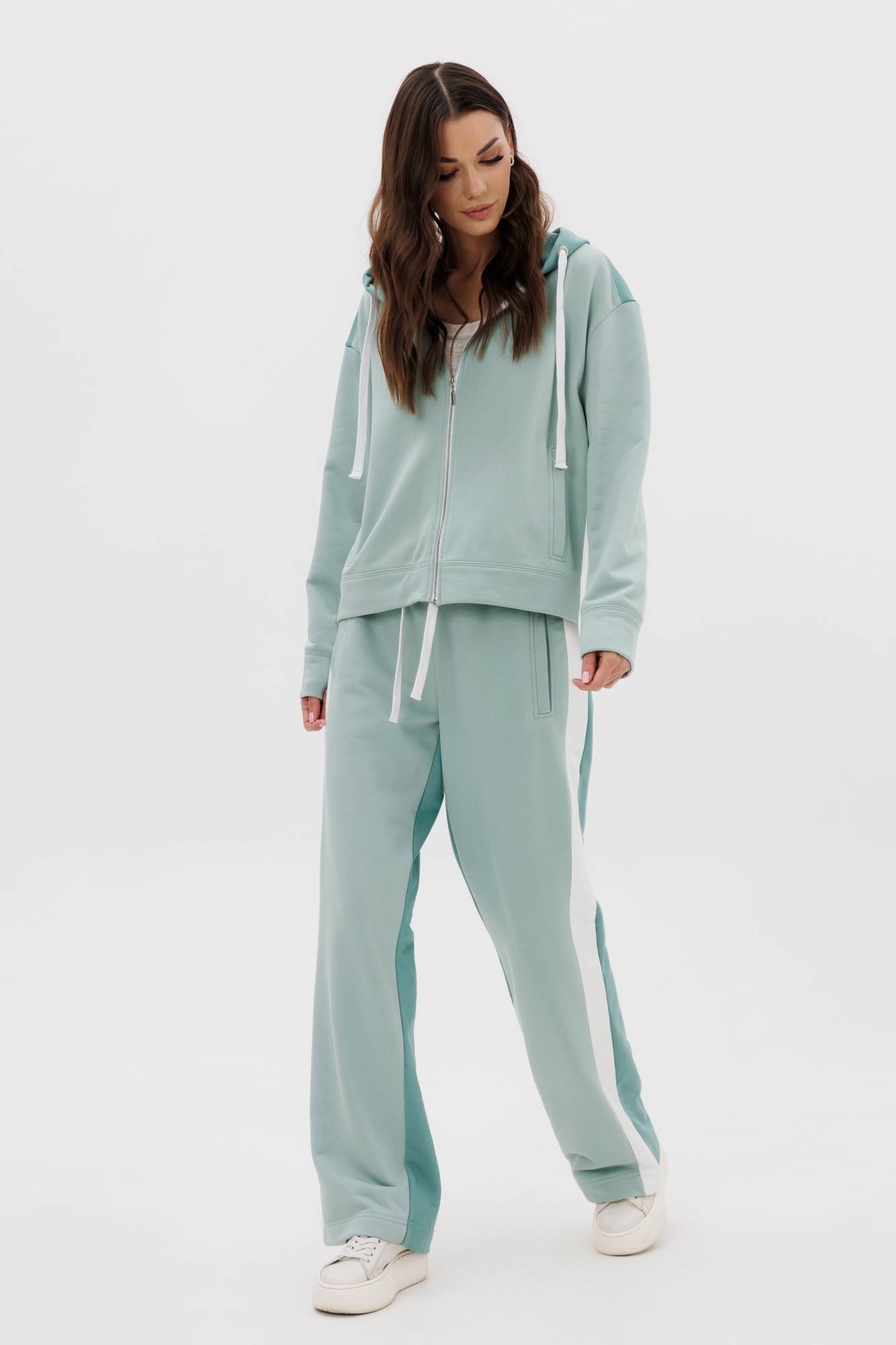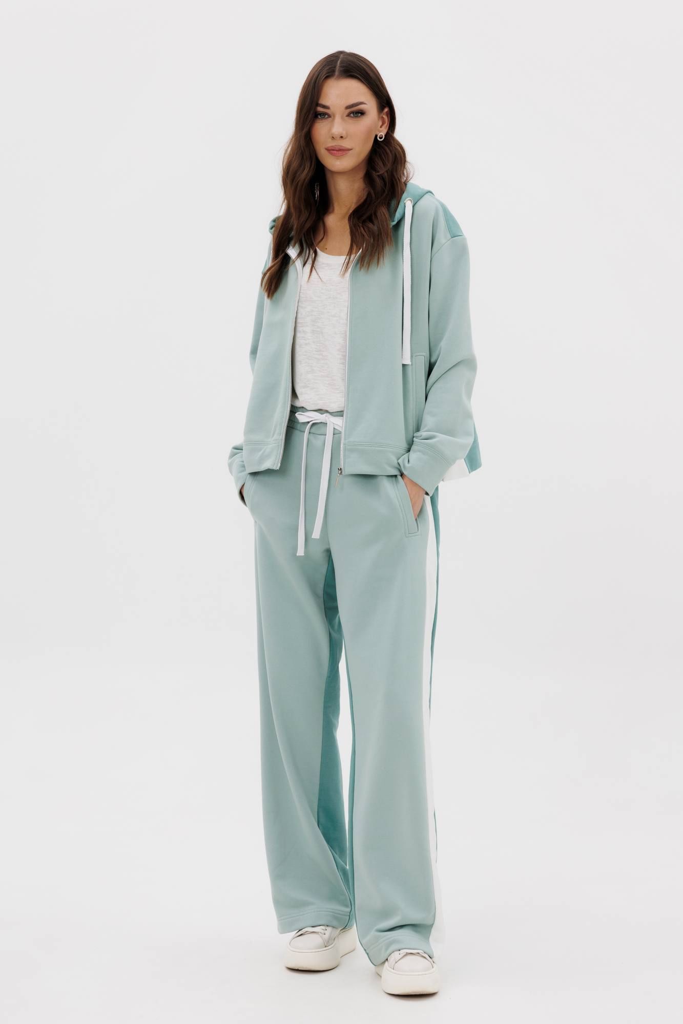 Перед тем, как отправиться на прогулку, шоппинг или активный вид отдыха, каждая из нас задумывается об одежде, которая будет практичной и одновременно стильной. Толстовка свободного силуэта, рубашечного покроя с заниженной линией плеча, рукавом, расширенным в области оката, на притачной манжете, центральной застёжкой на тесьму-молнию и капюшоном с люверсами и отделочным шнуром. Полочка с прорезным карманом с листочкой. По низу изделия - притачной пояс. Брюки в расслабленном стиле. Высокая посадка, боковой карман с листочкой, эластичный пояс с люверсами и отделочным шнуром. Длина брюк около 104 см