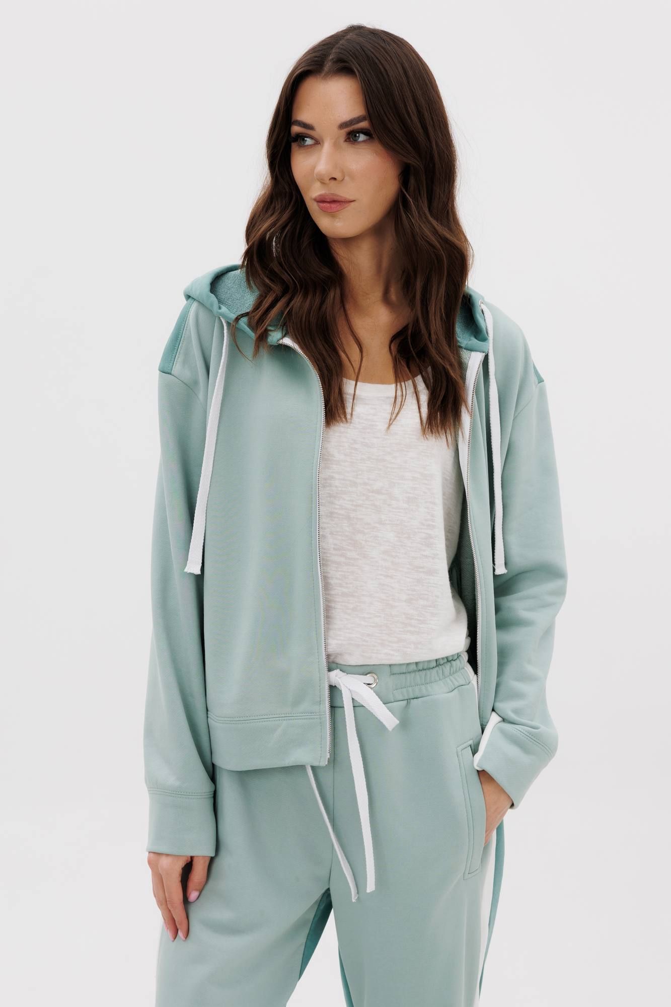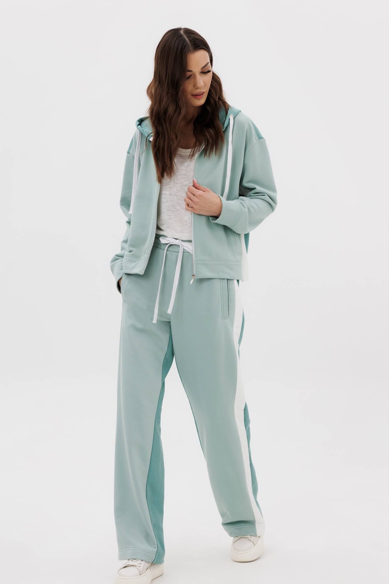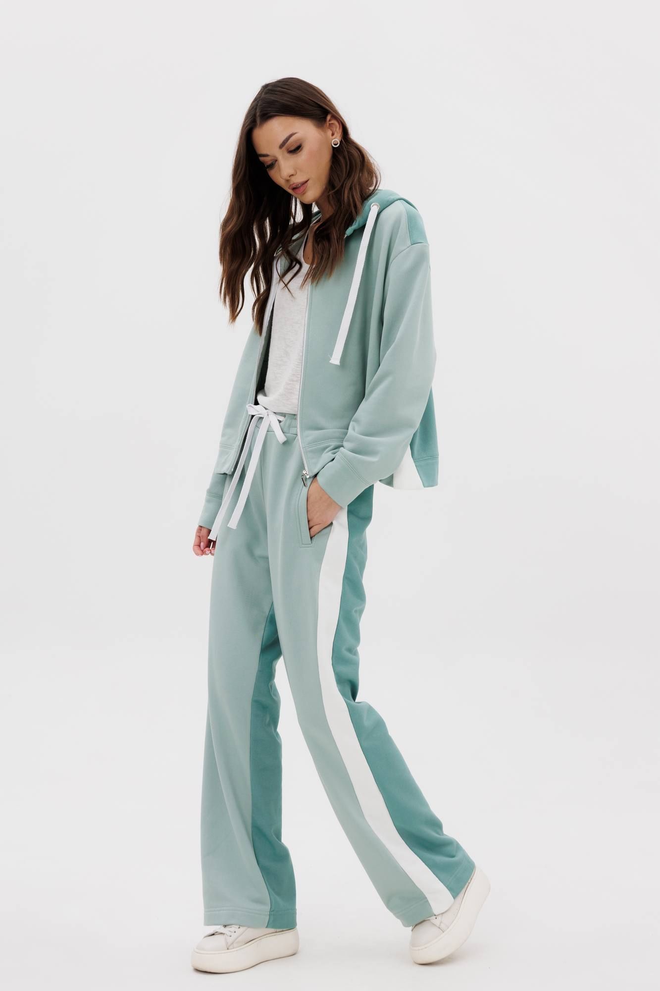 Перед тем, как отправиться на прогулку, шоппинг или активный вид отдыха, каждая из нас задумывается об одежде, которая будет практичной и одновременно стильной. Толстовка свободного силуэта, рубашечного покроя с заниженной линией плеча, рукавом, расширенным в области оката, на притачной манжете, центральной застёжкой на тесьму-молнию и капюшоном с люверсами и отделочным шнуром. Полочка с прорезным карманом с листочкой. По низу изделия - притачной пояс. Брюки в расслабленном стиле. Высокая посадка, боковой карман с листочкой, эластичный пояс с люверсами и отделочным шнуром. Длина брюк около 104 см