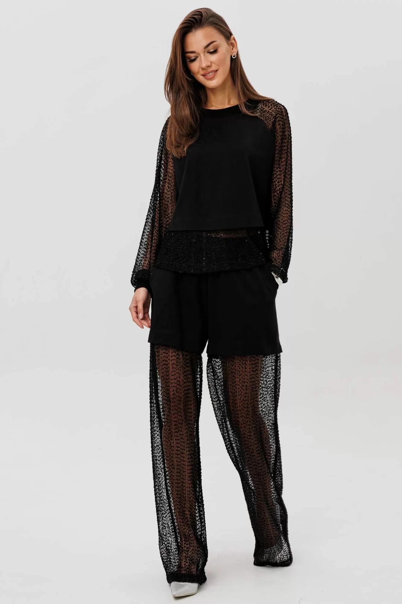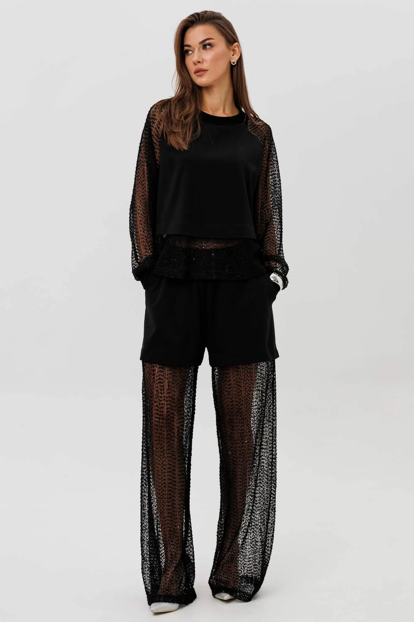 Современный брючный комплект, который создаёт эффект многослойности и лёгкого сияния. Джемпер выполнен из мягкого, комфортного вискозного полотна с нейлоном и дополнен воздушными рукавами из мерцающей сетки с россыпью микропайетки. Брюки на удобном эластичном поясе имеют прозрачную нижнюю часть в тон — подвижную, блестящую и подчёркивающую силуэт. Стильное решение для тех, кто ценит тренды и оригинальное звучание образа.