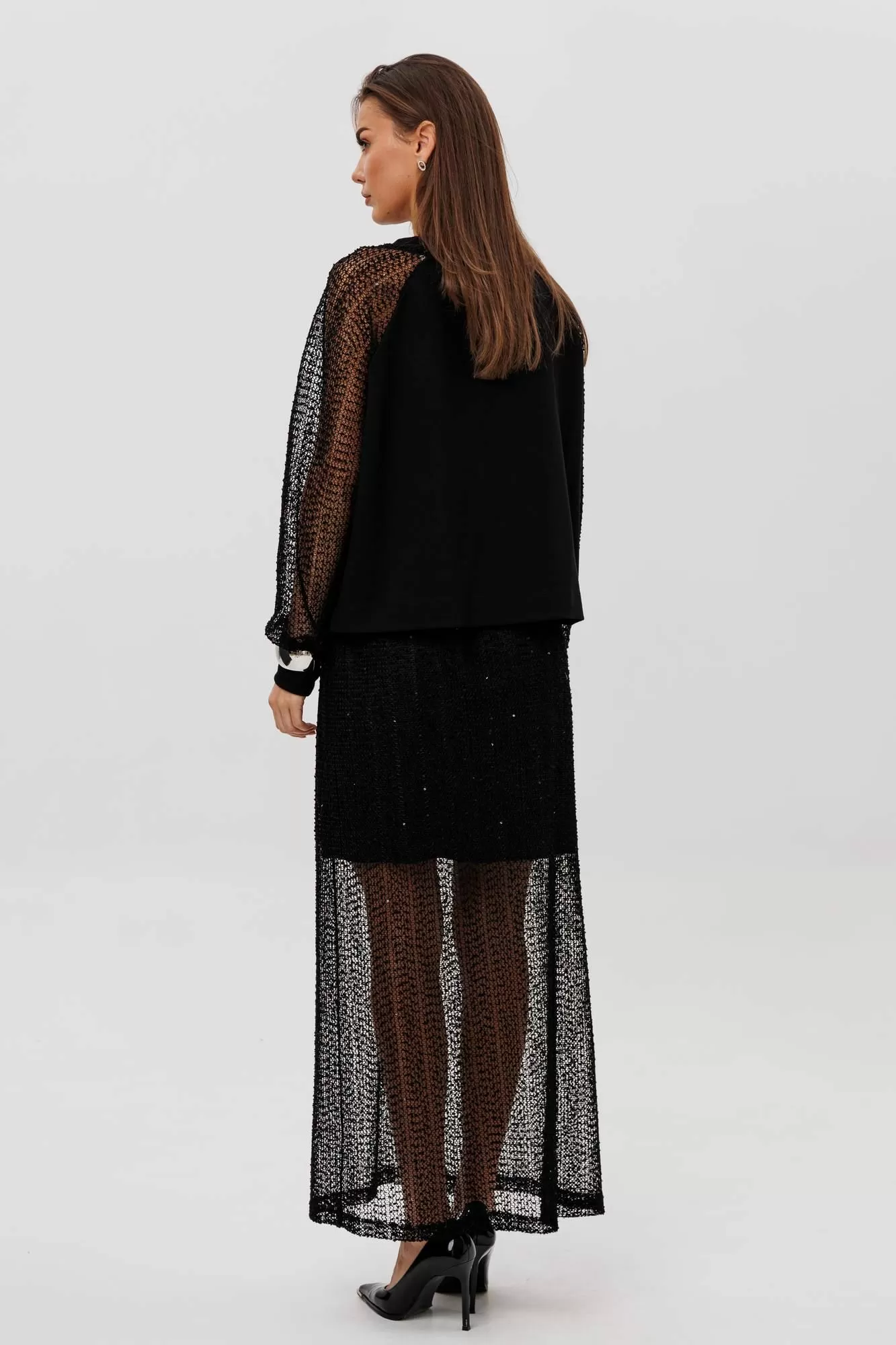 Юбка макси гармонично поддерживает дизайн: плотная внутренняя часть обеспечивает комфорт и уверенность, а длинная прозрачная нижняя вставка из мерцающей сетки добавляет загадочности и женственности. Комплект смотрится нарядно, но остаётся практичным — идеален как для вечерних выходов, так и для особых событий, где хочется выглядеть эффектно, но без излишнего пафоса.