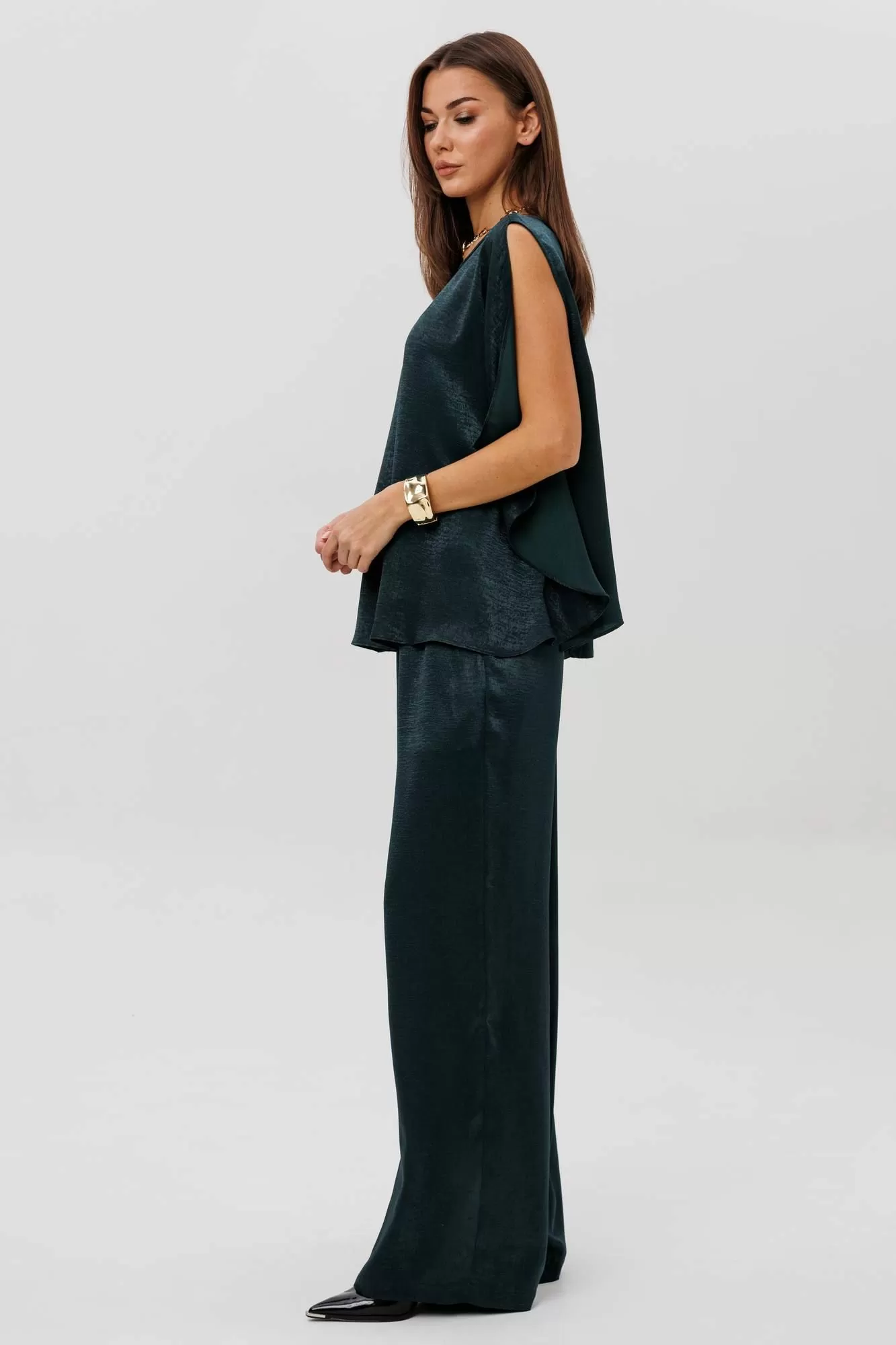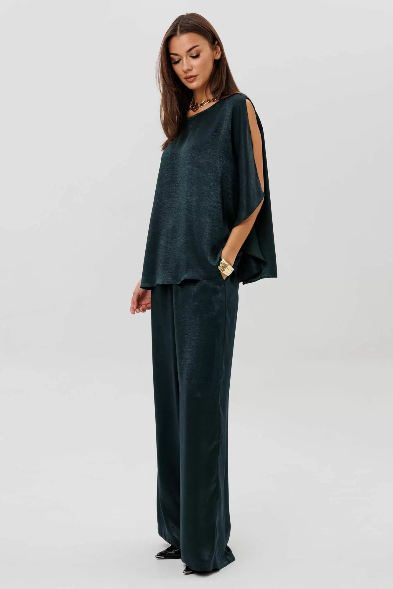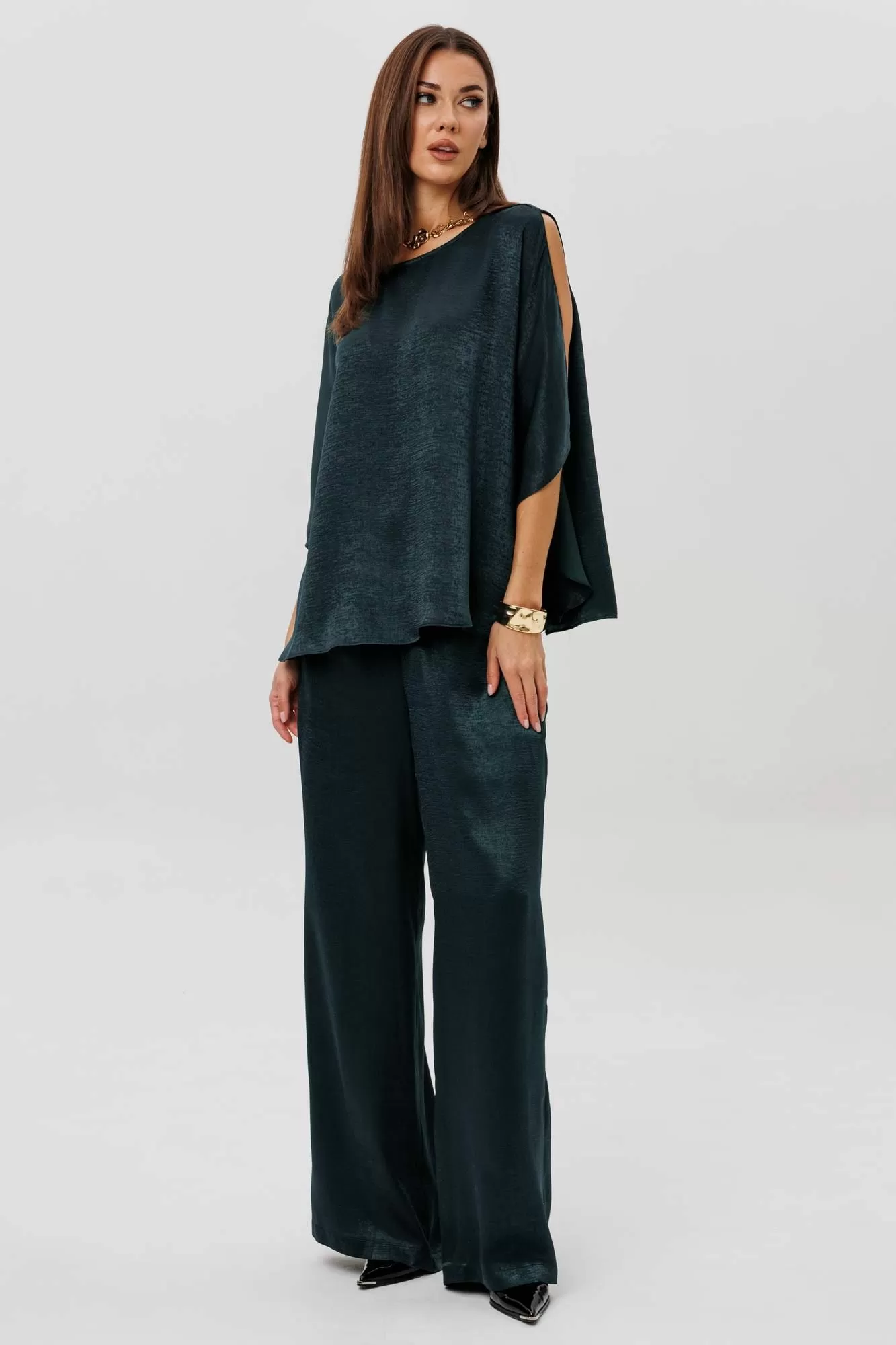 Роскошный брючный комплект из высококачественного атласа — это готовый образ для особых случаев и стильных выходов. Свободная блуза beautifully драпируется, мягко играет на свету и позволяет носить её как в расслабленном варианте, так и подчёркивая талию поясом. Широкие брюки на комфортной резинке создают эффект удлинённых ног и дарят полную свободу движений. Современная элегантность, которая всегда смотрится дорого и effortlessly chic.