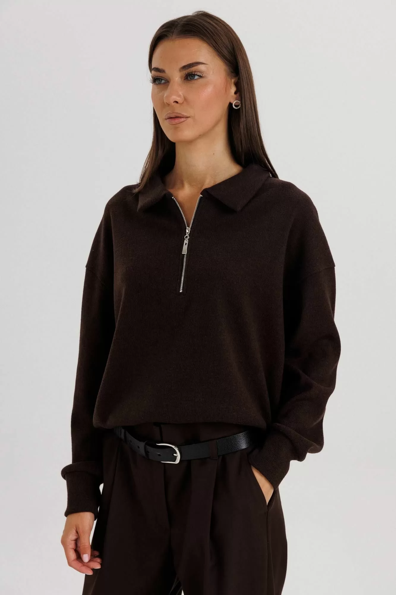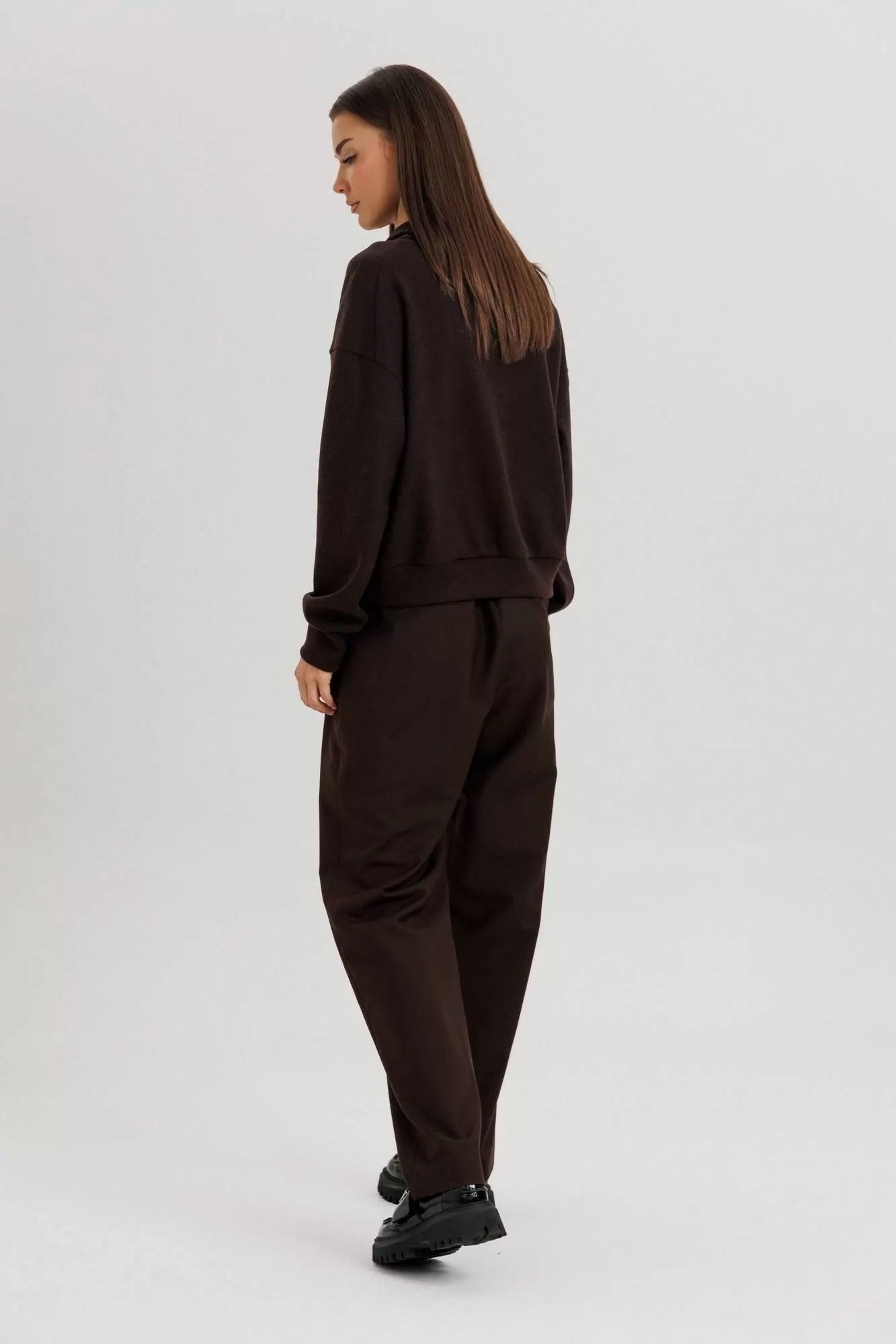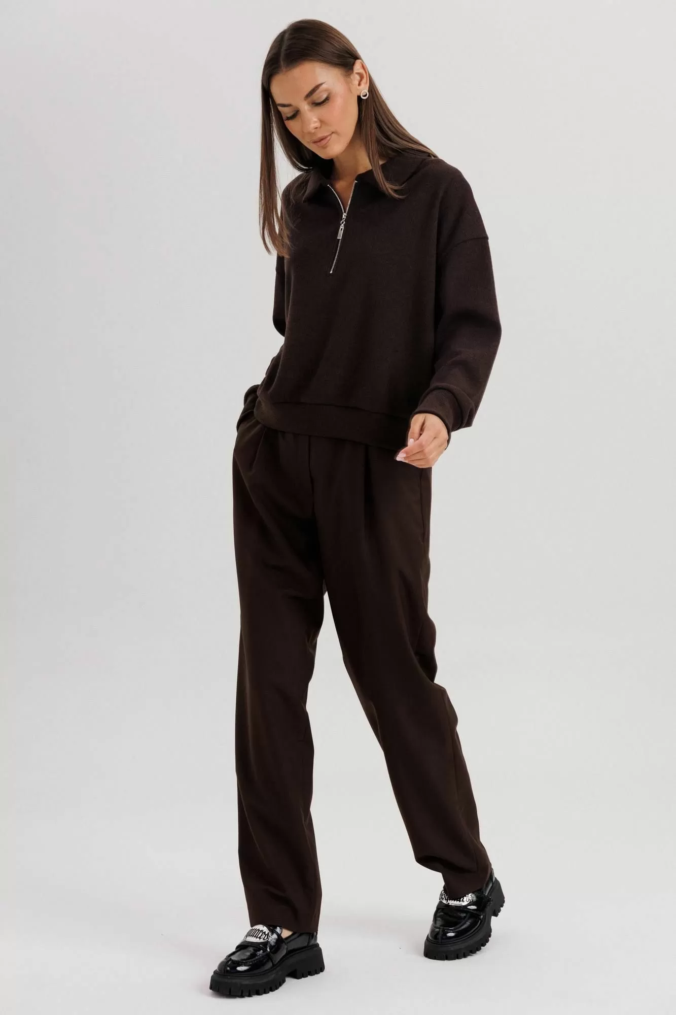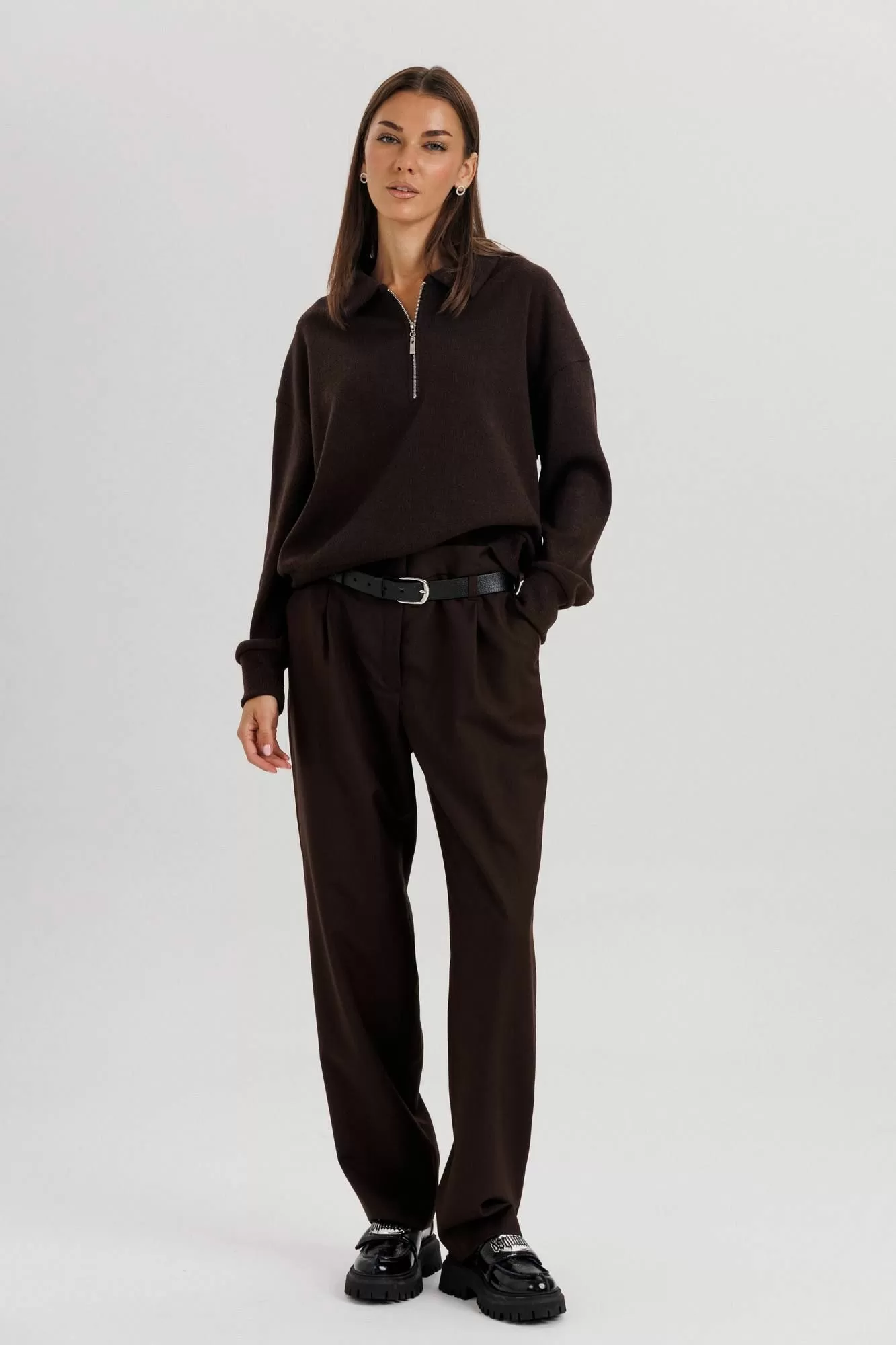 Джемпер из трикотажа. Это одна из базовых вещей осенне-зимнего сезона. Он тёплый, удобный и невероятно комфортный. К тому же, настолько универсален, что его можно стилизовать абсолютно разными способами. Свободный покрой с заниженной линией плеча, рукав рубашечного покроя на отрезной манжете, воротник классический, по центру полочки частичная застёжка-молния. По низу джемпера - отрезной пояс. Брюки классические, прямые, на отрезном поясе со шлевками, эластичном в области спинки. Передние половинки брюк с талиевыми вытачками и наклонными боковыми карманами.