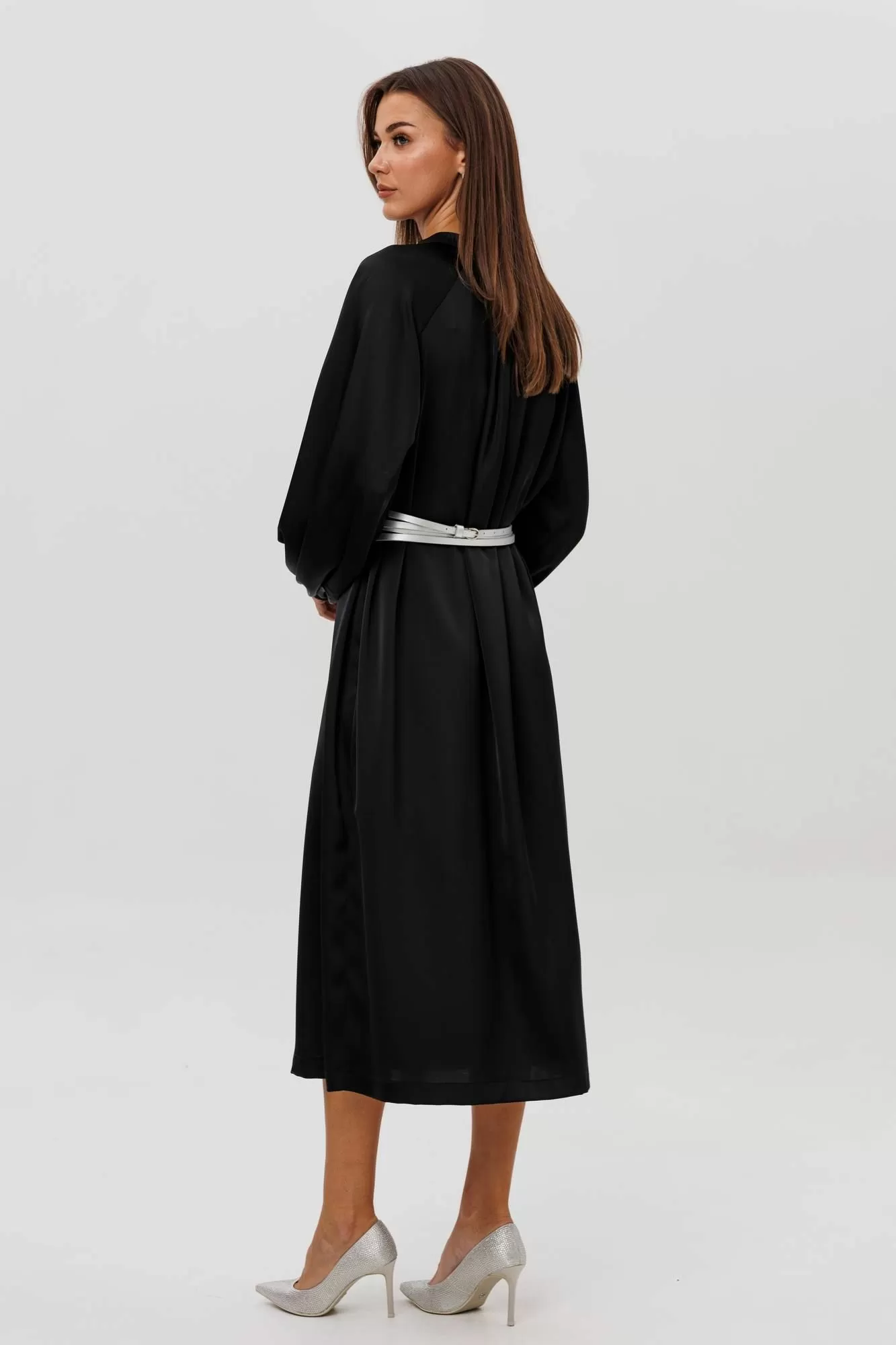 Платье из гладкого атласного полотна свободного рубашечного покроя. Модель выполнена с мягкой сборкой по горловине, застёжкой на пуговицы и объёмными рукавами на манжете. Акцентом выступают эффектные серебристые пояса, подчёркивающие талию и добавляющие образу современный, элегантный штрих. Ideal для деловых встреч, ужинов и особых выходов.