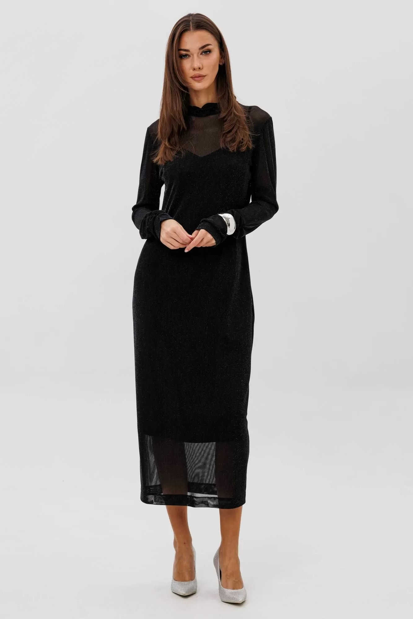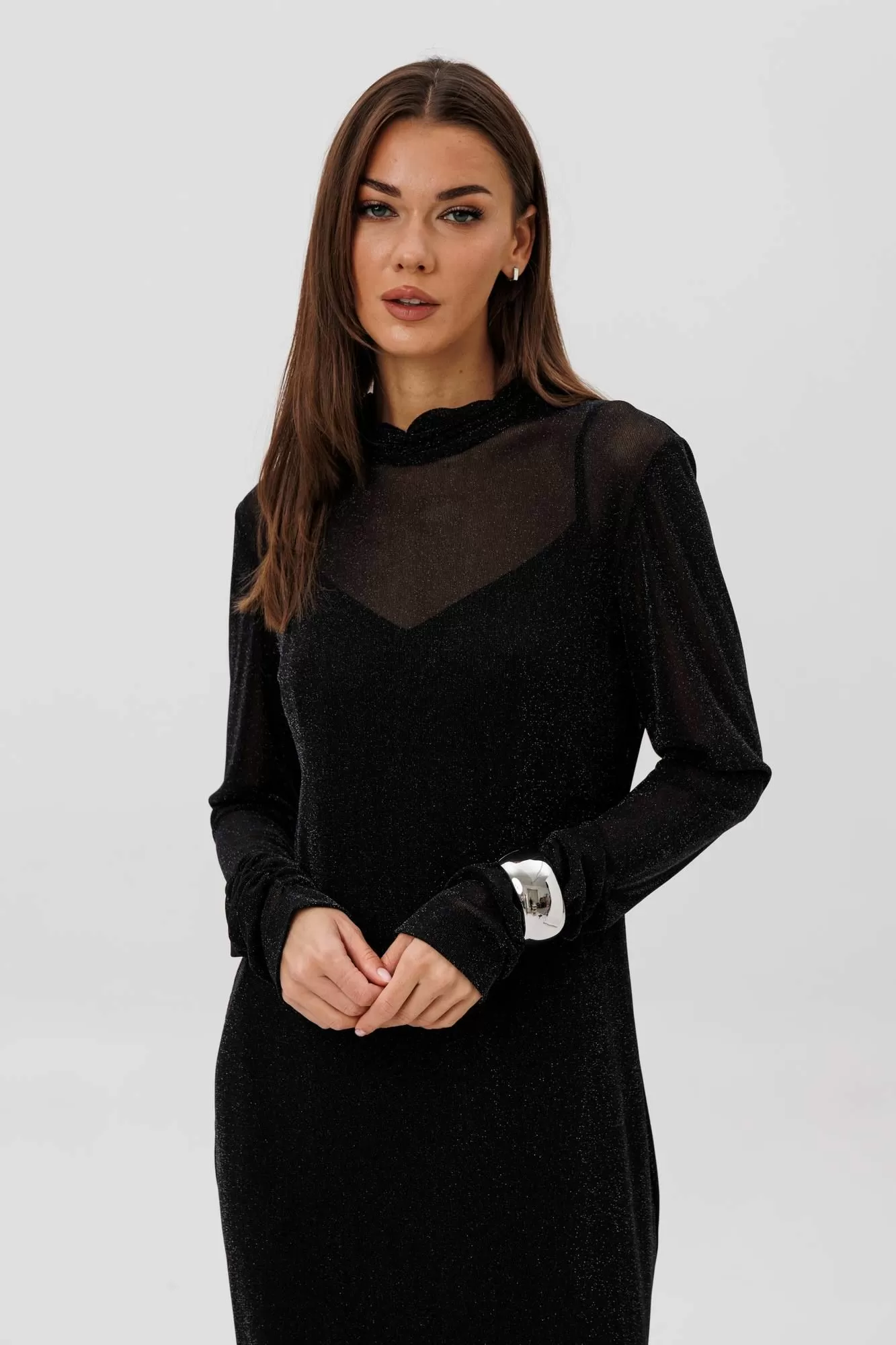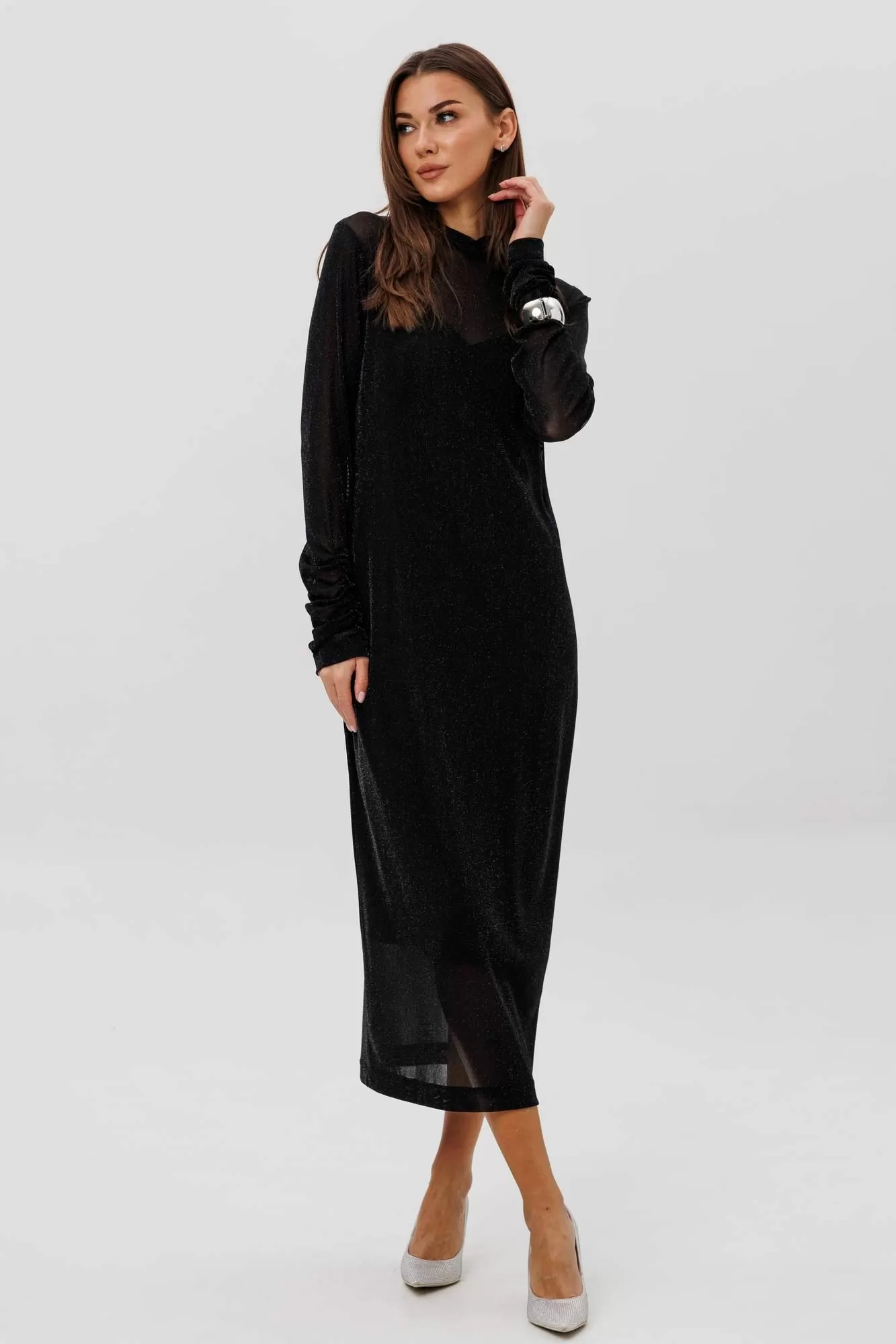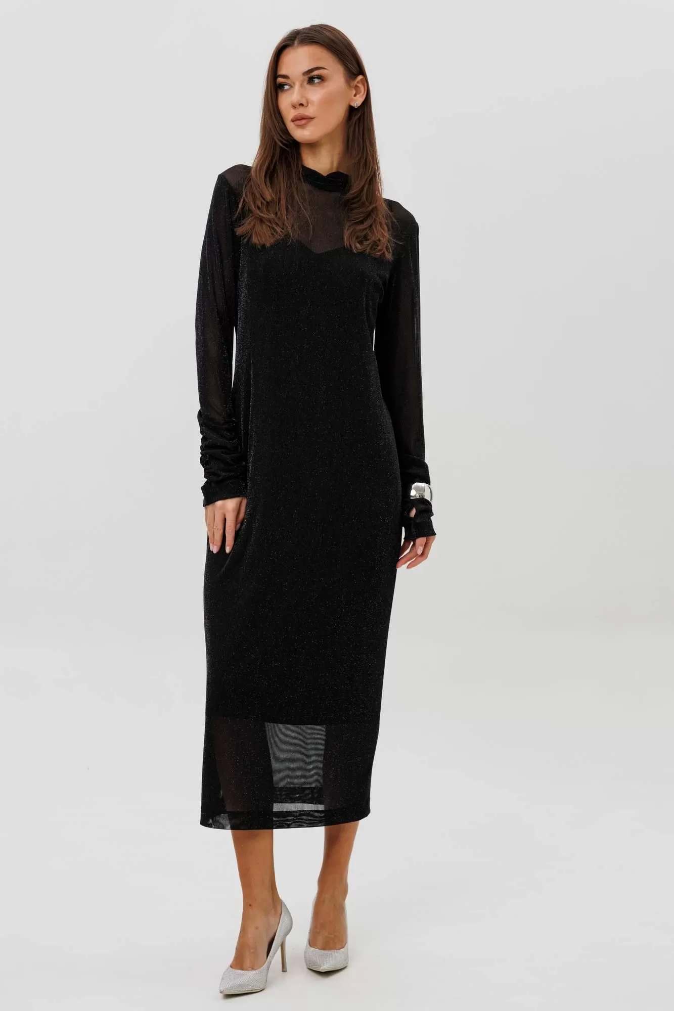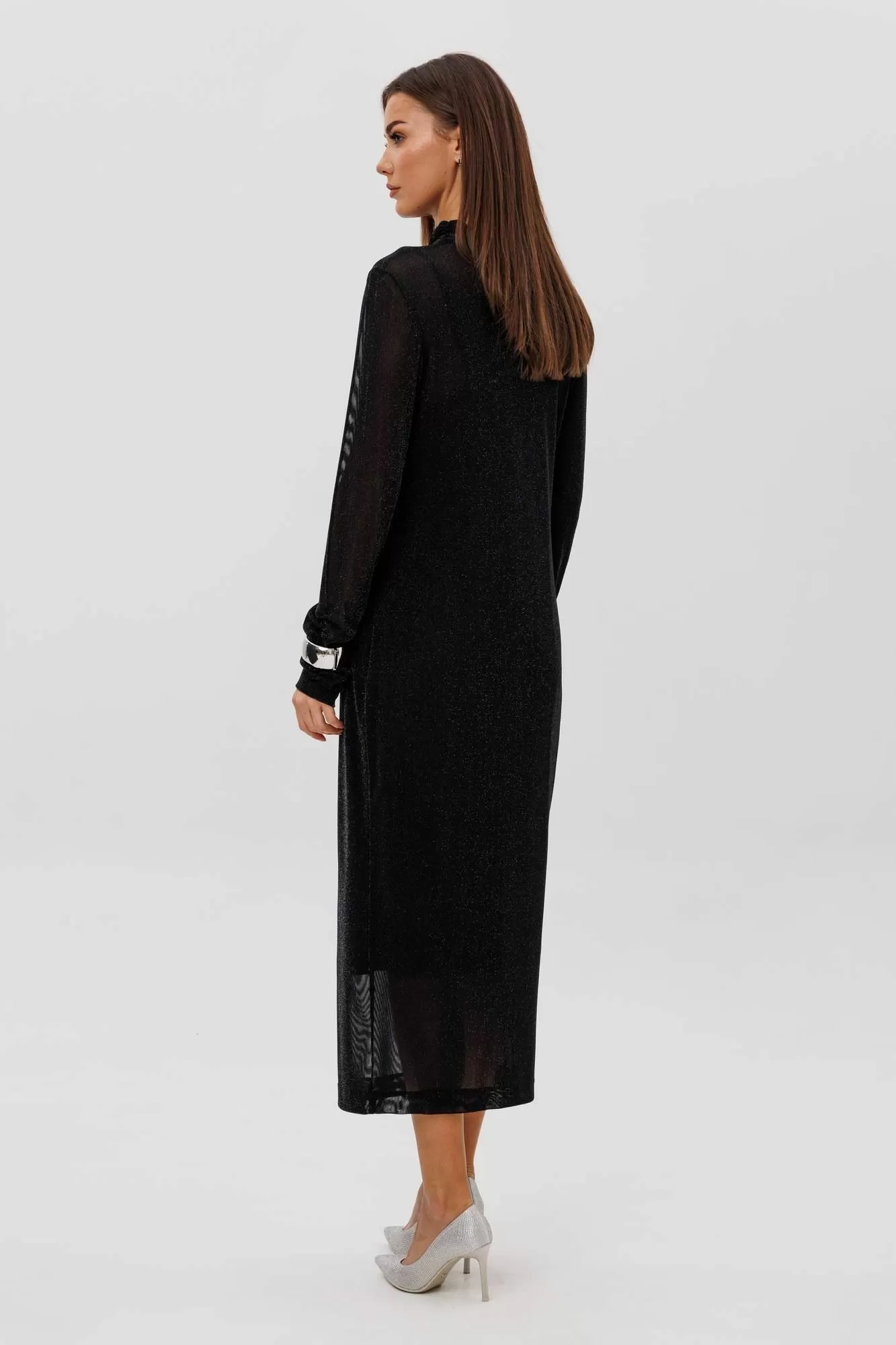 Женственное платье втачного покроя выполнено из мерцающей сетки, красиво играющей при движении. Драпированные рукава и стоячий воротник добавляют утончённости, а подкладка-чехол обеспечивает комфорт и идеальную посадку. Образ одновременно выдержанный, современный и эффектный.
