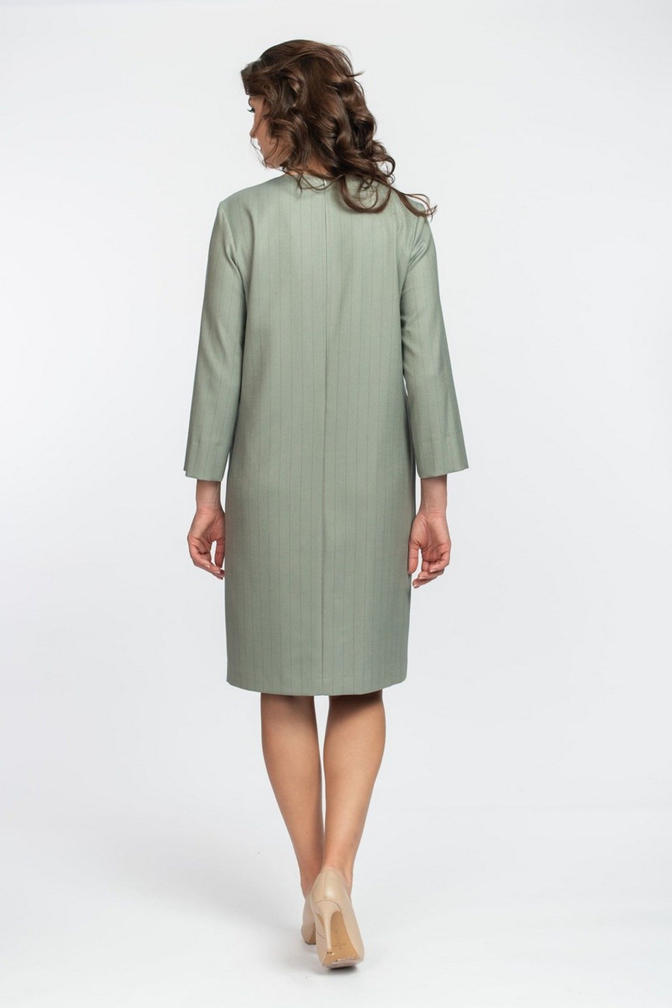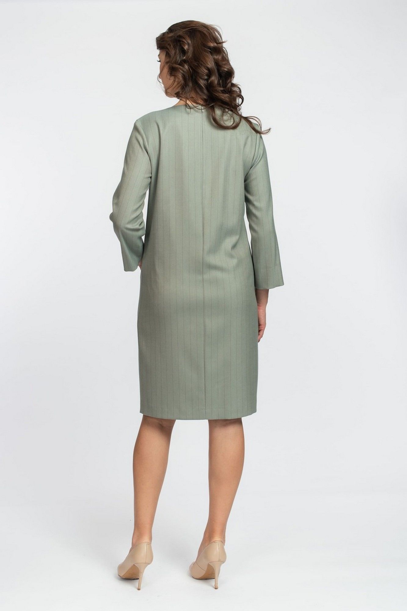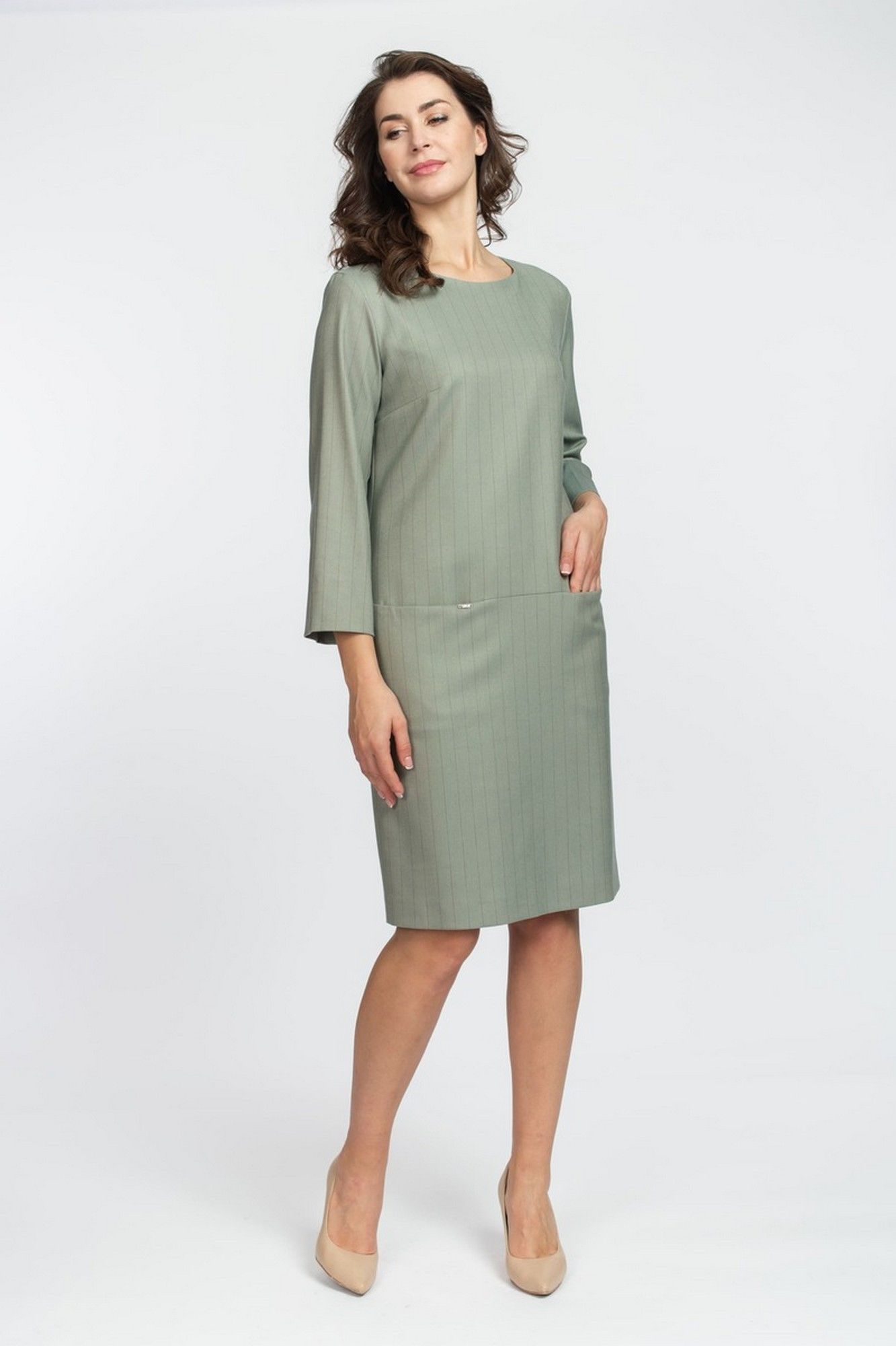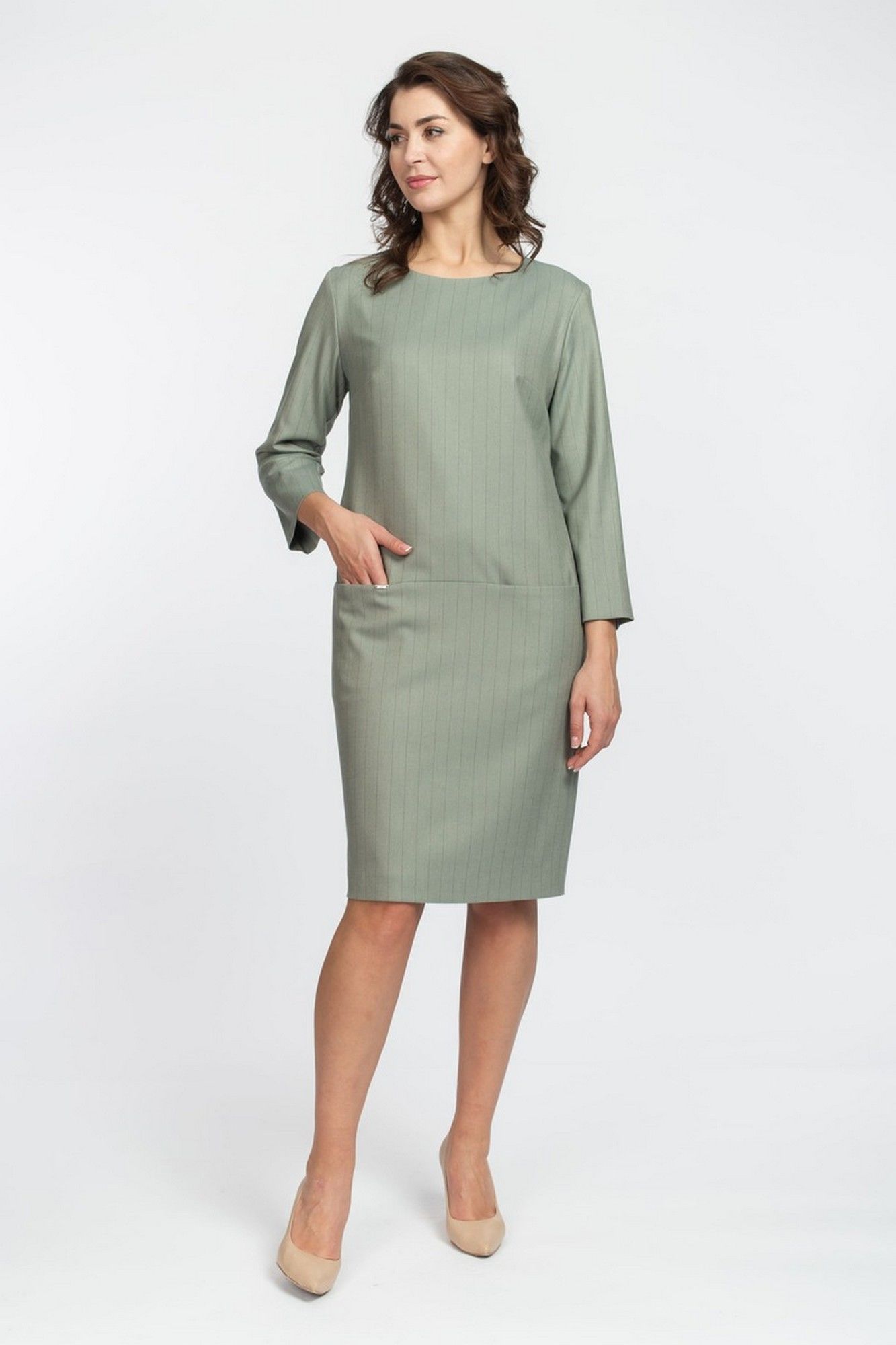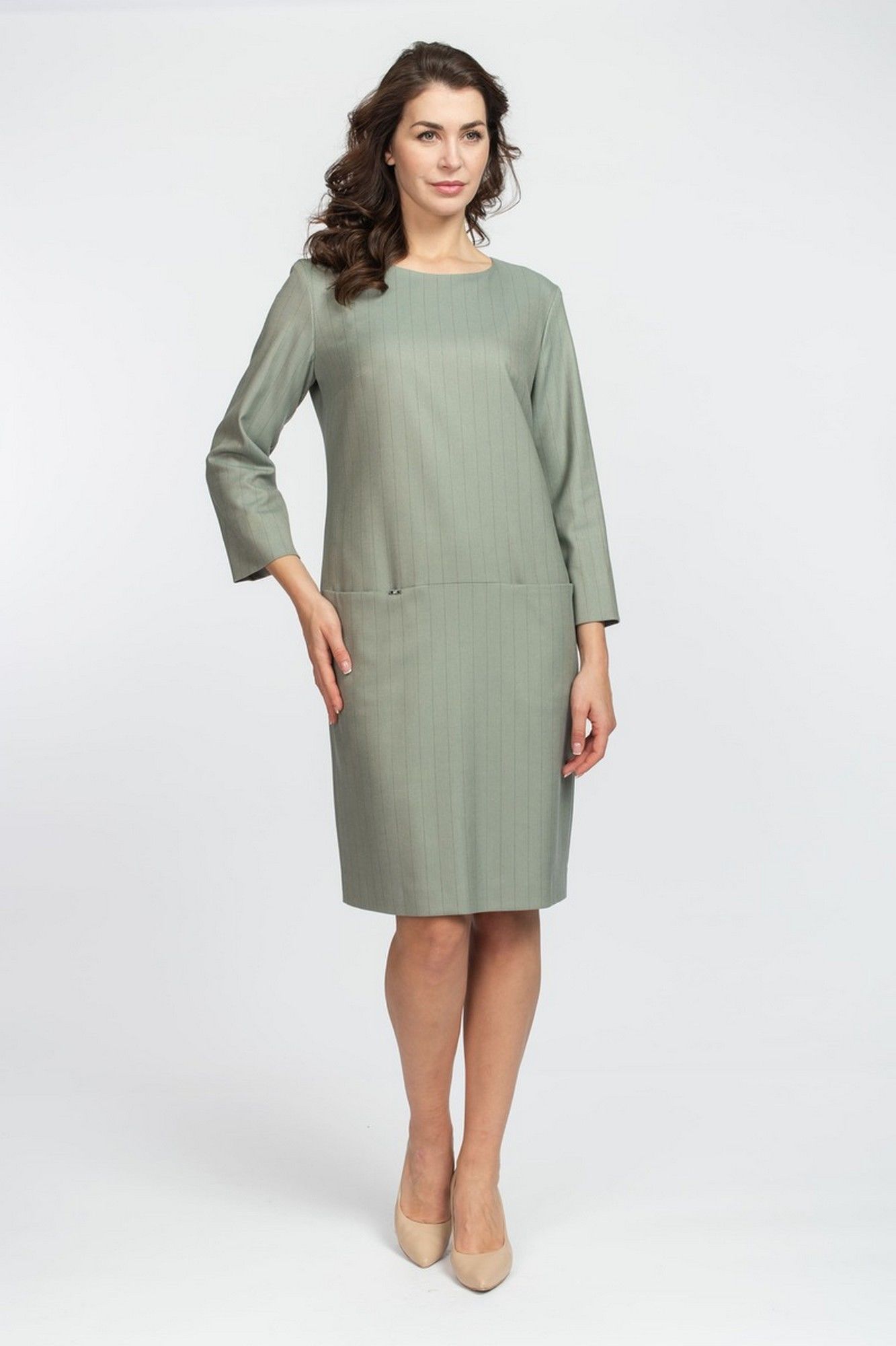 Базовое платье полуприлегающего силуэта с округлым вырезом горловины, с потайными карманами в подрезе спереди, спинка с центральным швом и застежкой сверху на потайную молнию, длина рукава 3/4. Выполнено из вискозного полотна на подкладке. Длина изделия: 100 см. длина рукава: 52см.