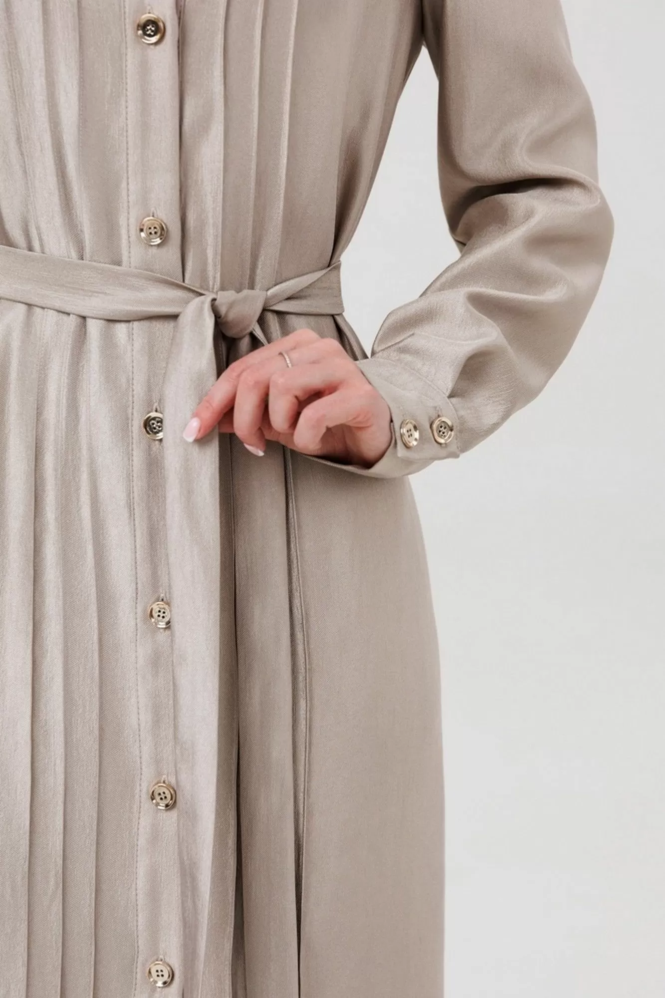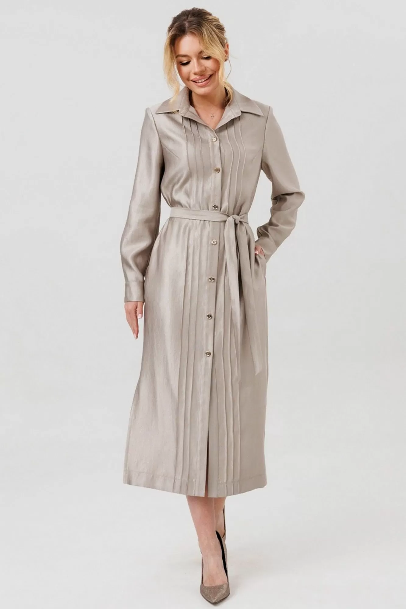 на петли и пуговицы. По полочке-декоративные вертикальные защипы. Рукав втачной, на манжете. В боковых швах платья-функциональные карманы. По низу платья- разрезы. В комплект входит пояс из основной ткани.