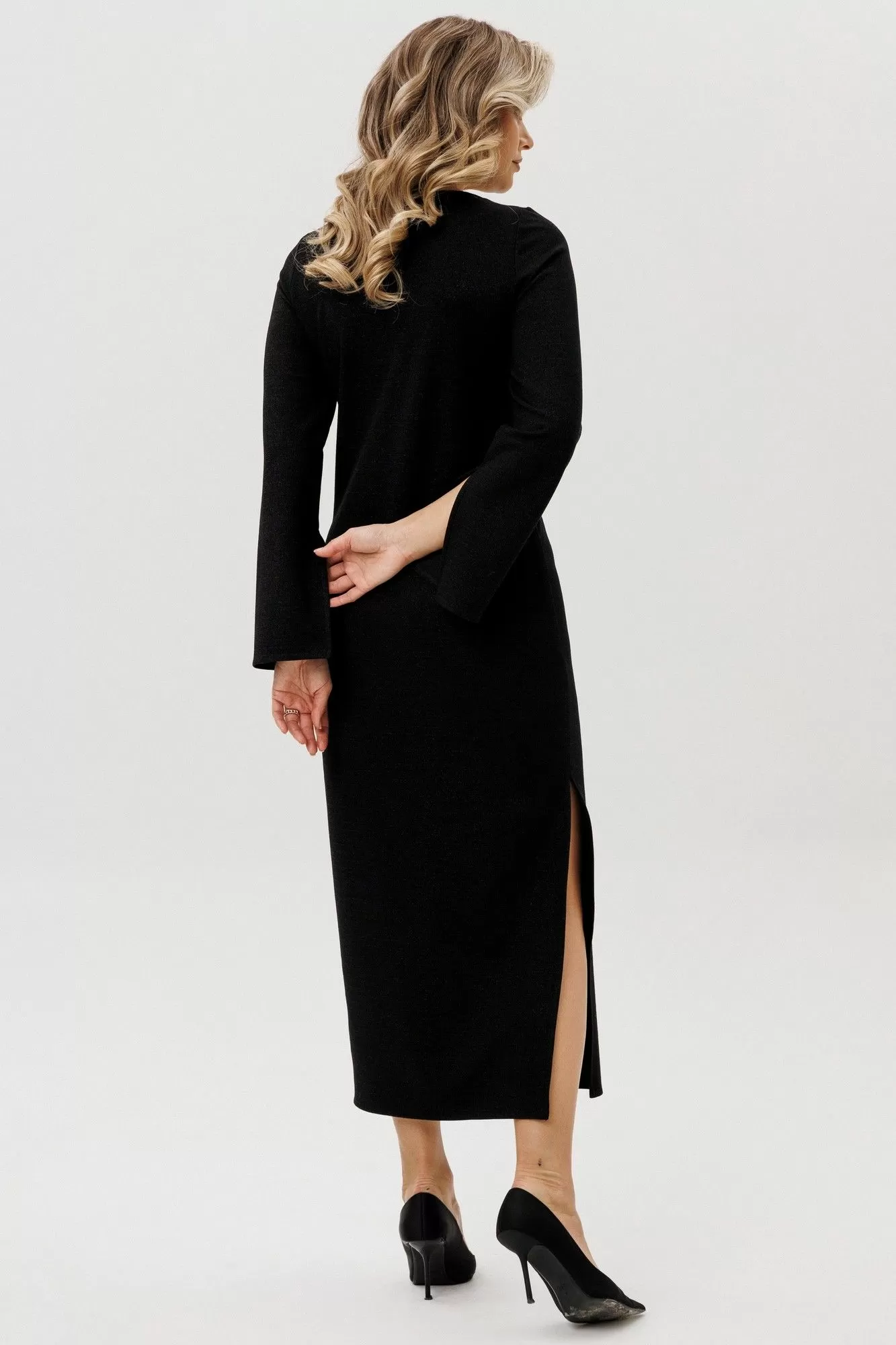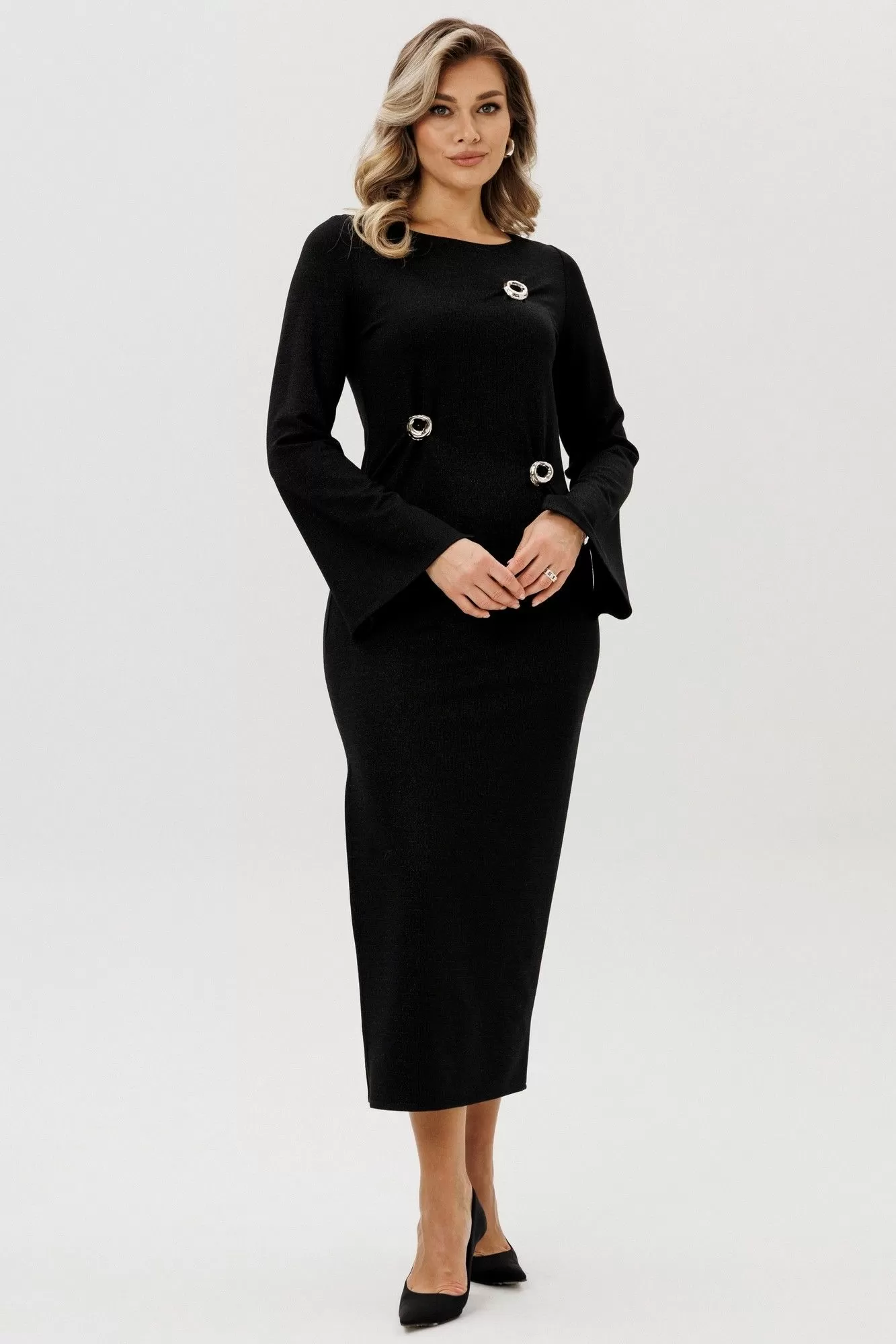 Платье из трикотажного полотна с добавлением люрексовой нити. Рукав втачной, расширенный книзу.