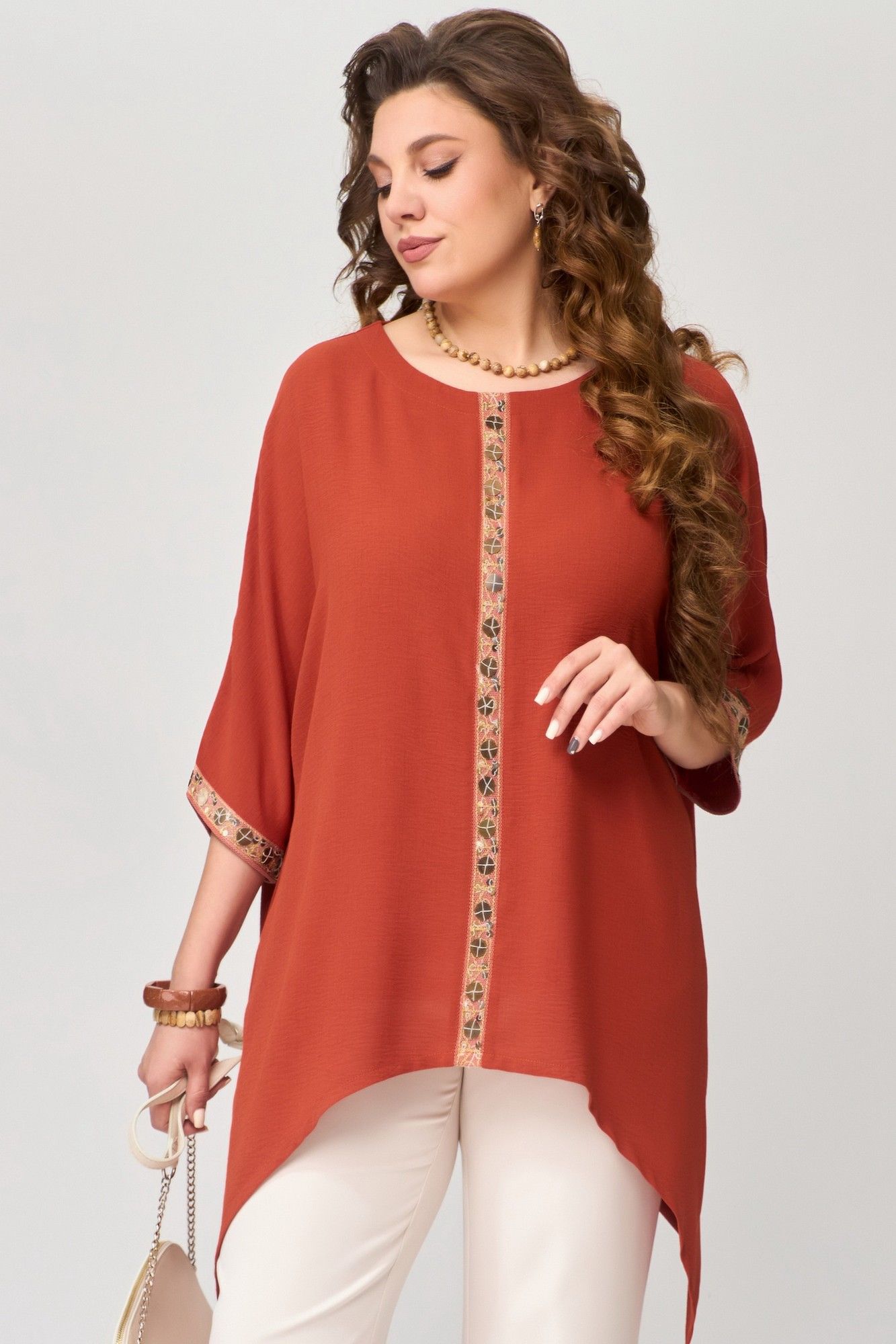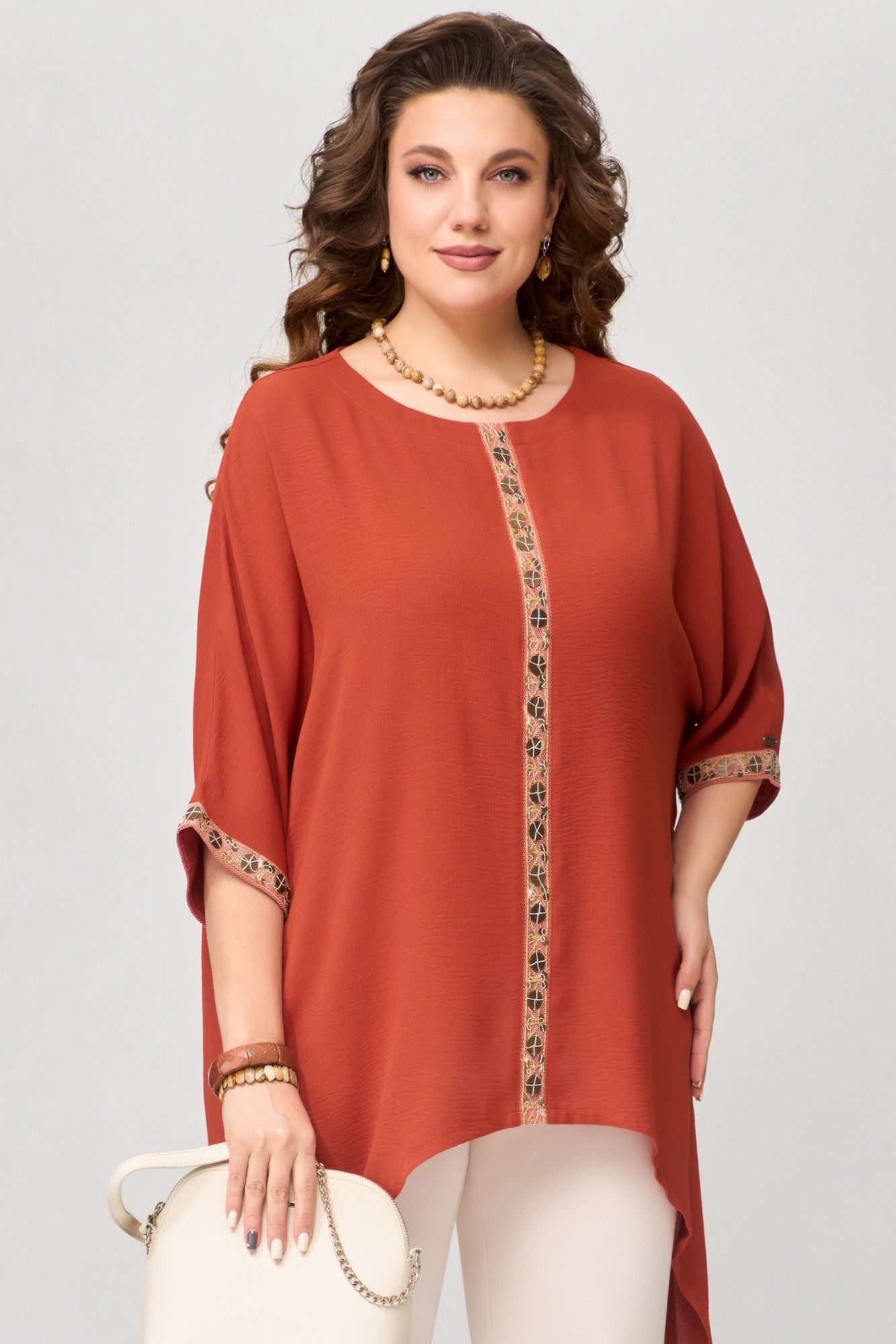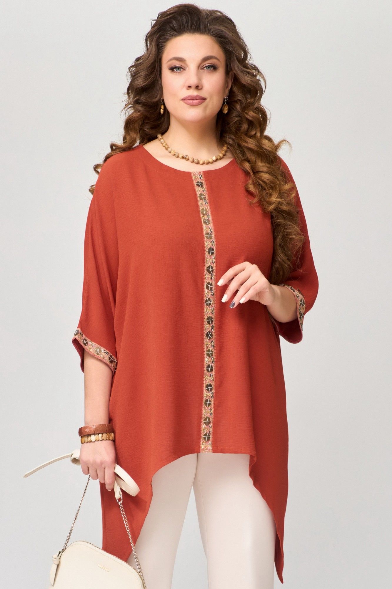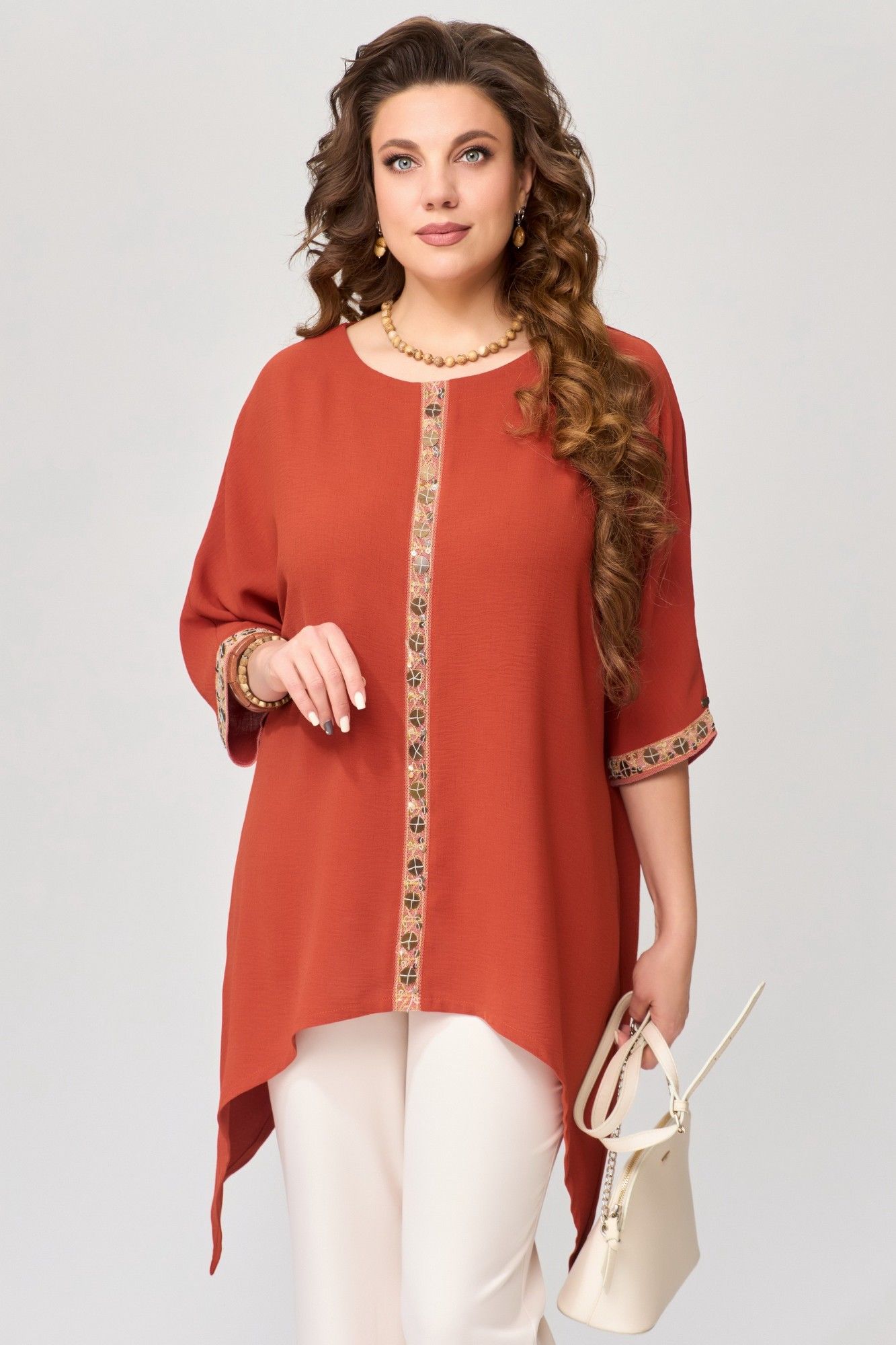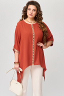 Туника "Удеса" оверсайз выполнена из текстильной ткани без подкладки, ткань легкая, стрейч и очень практичная в носке. Рукав цельнокроеный, горловина обработана обтачкой, обтачка закреплена отделочной строчкой. Низ изделия обработан швом в подгибку, по центру полочки нашита тесьма (монетки на сетке), низ рукава тоже обработан декоративной тесьмой.