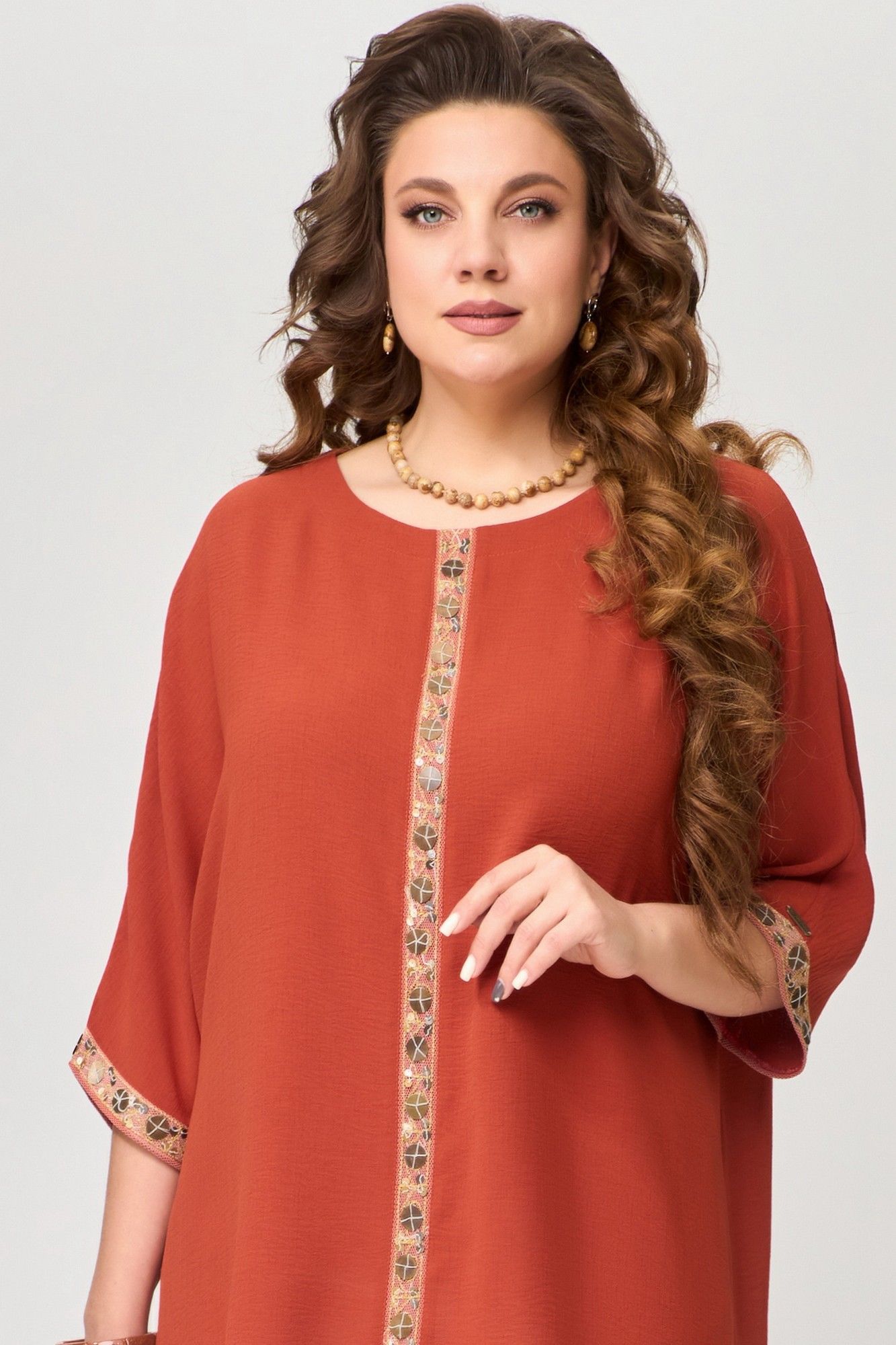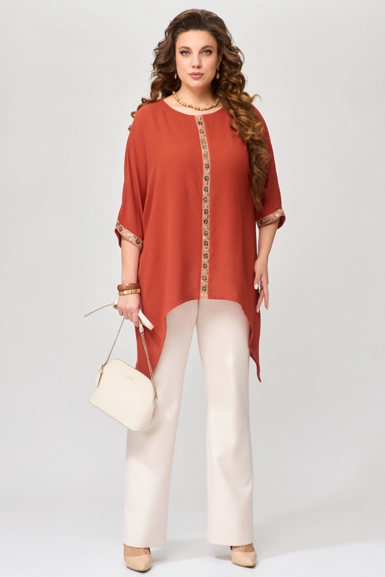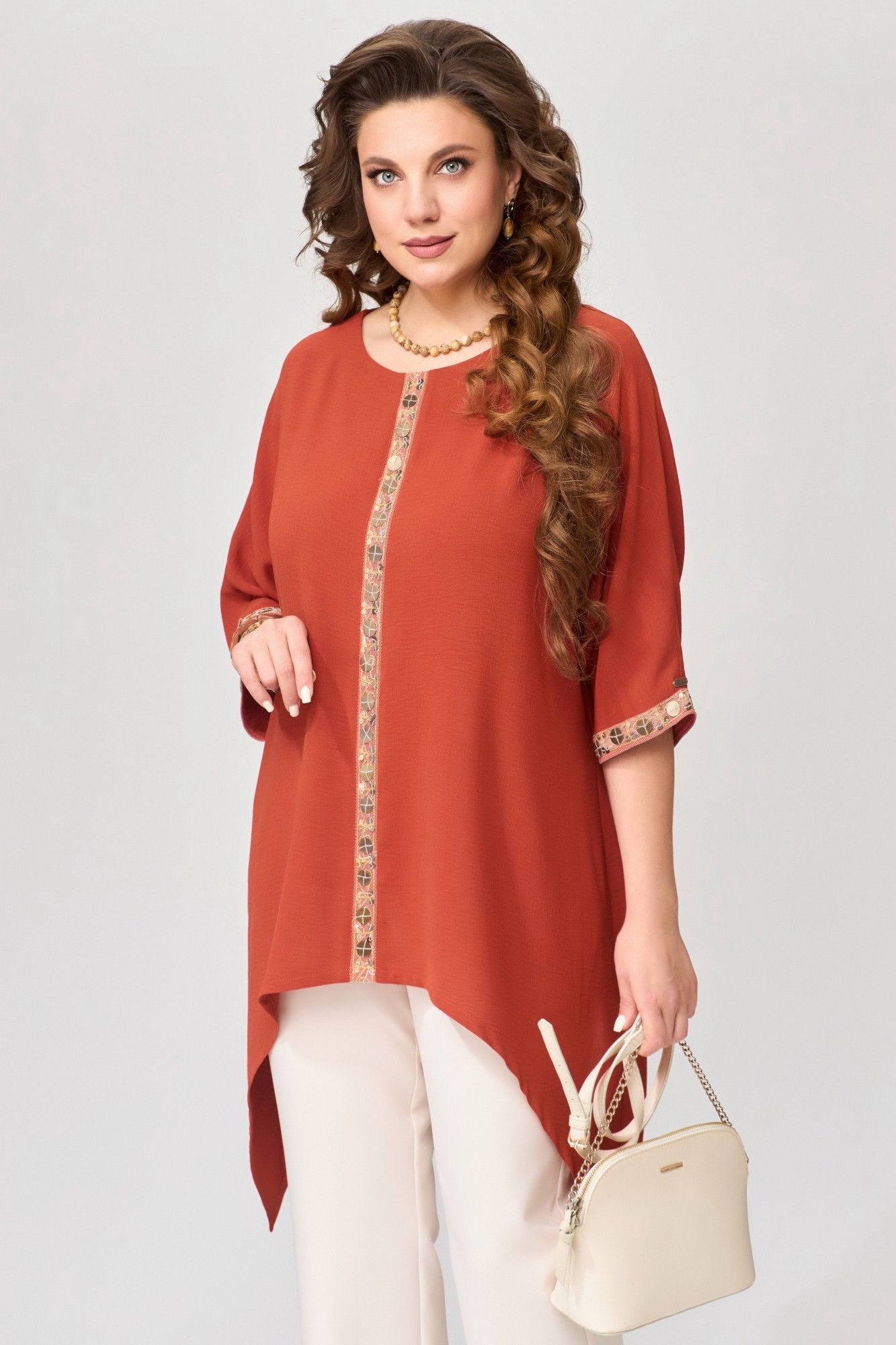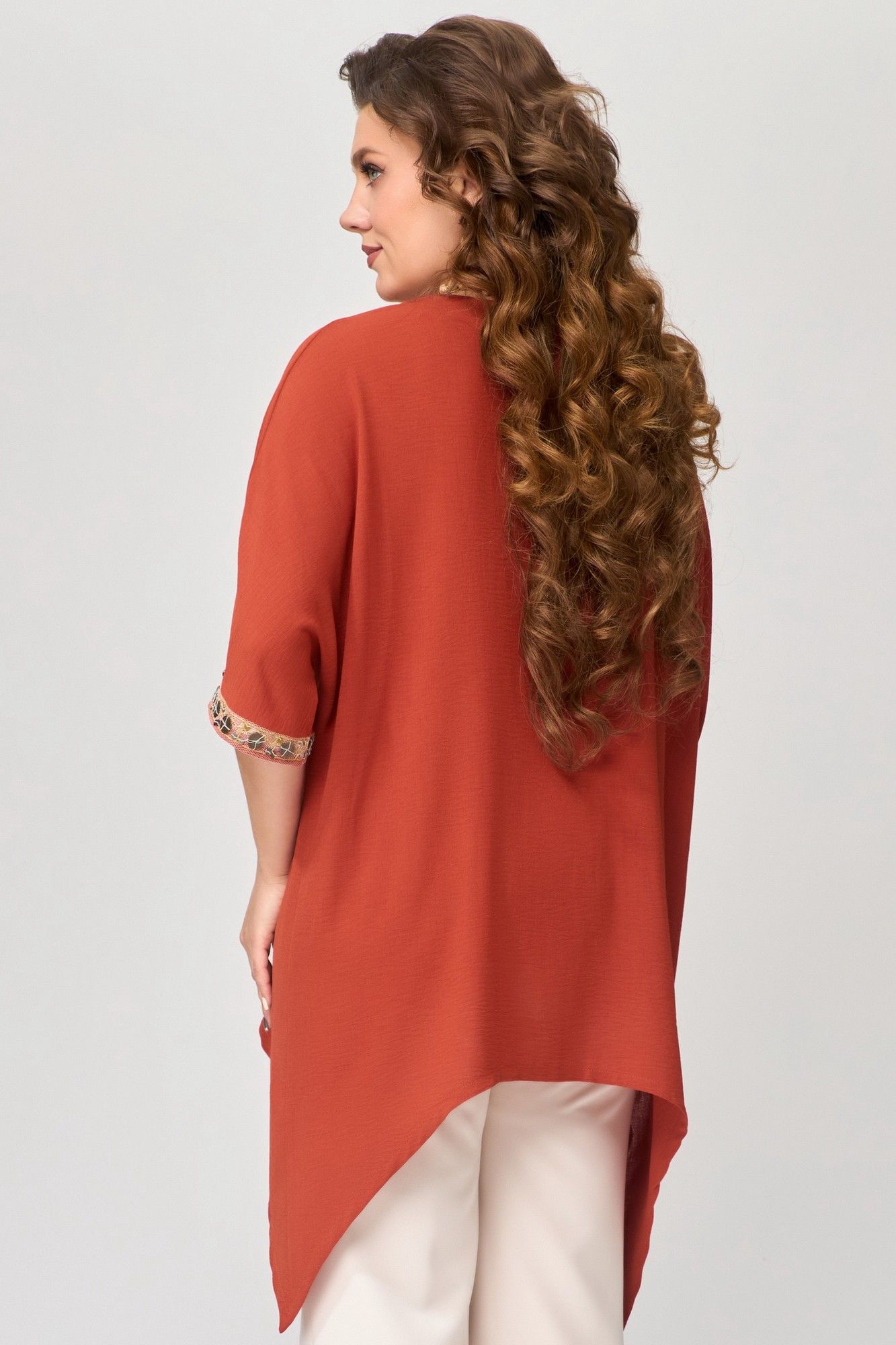 Туника "Удеса" оверсайз выполнена из текстильной ткани без подкладки, ткань легкая, стрейч и очень практичная в носке. Рукав цельнокроеный, горловина обработана обтачкой, обтачка закреплена отделочной строчкой. Низ изделия обработан швом в подгибку, по центру полочки нашита тесьма (монетки на сетке), низ рукава тоже обработан декоративной тесьмой.