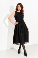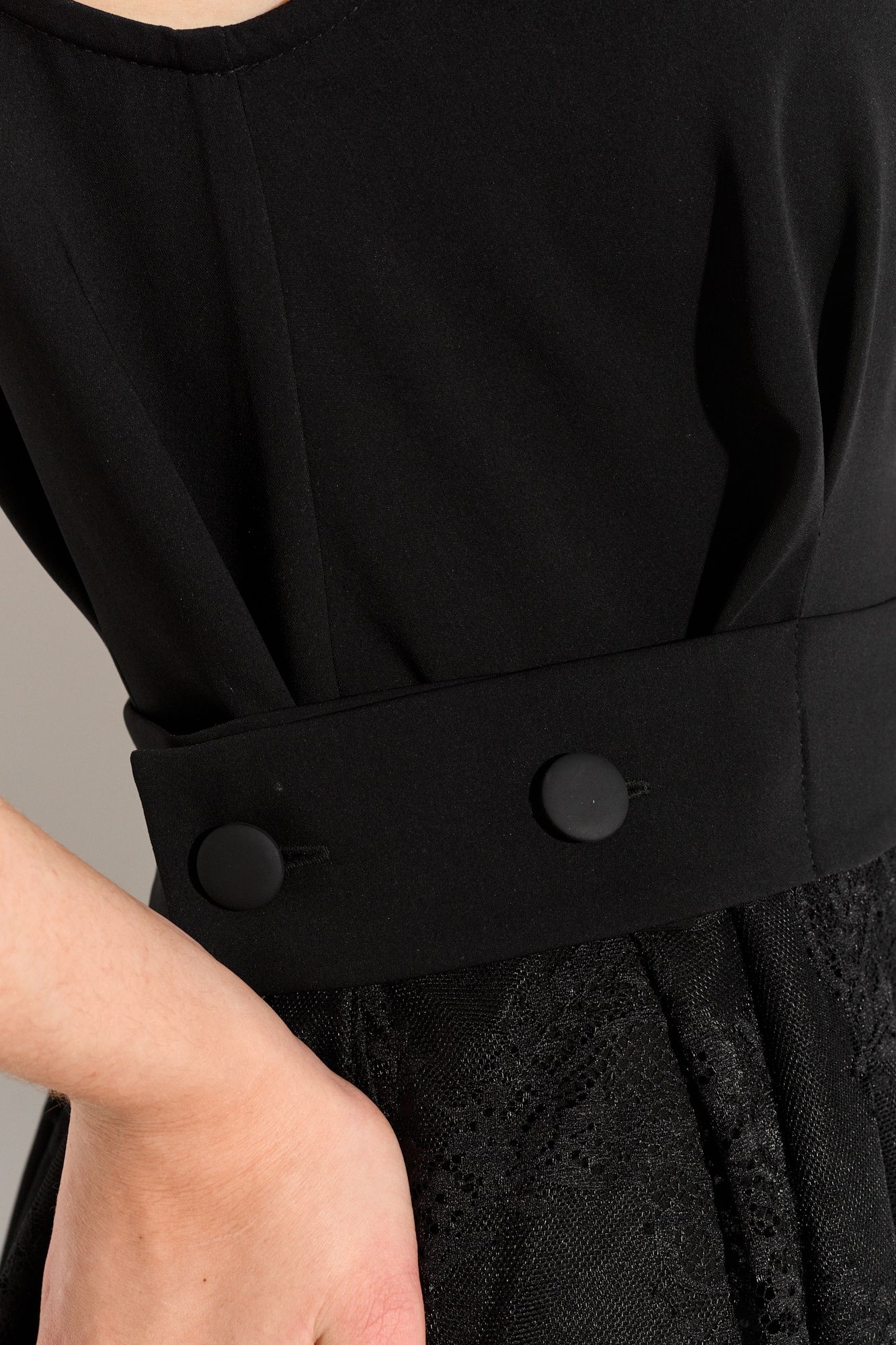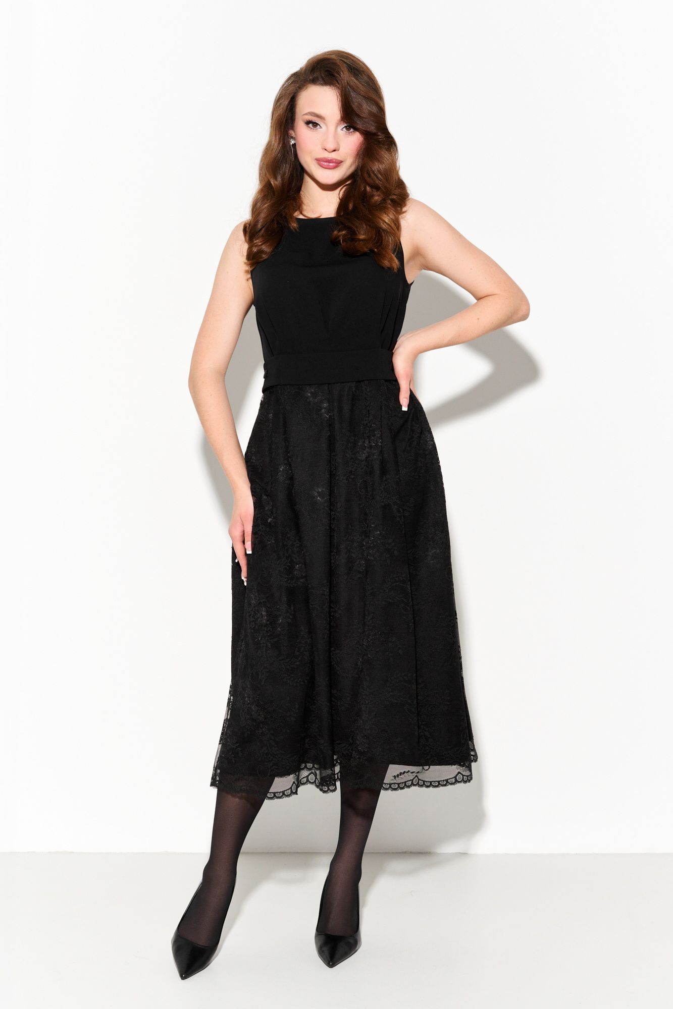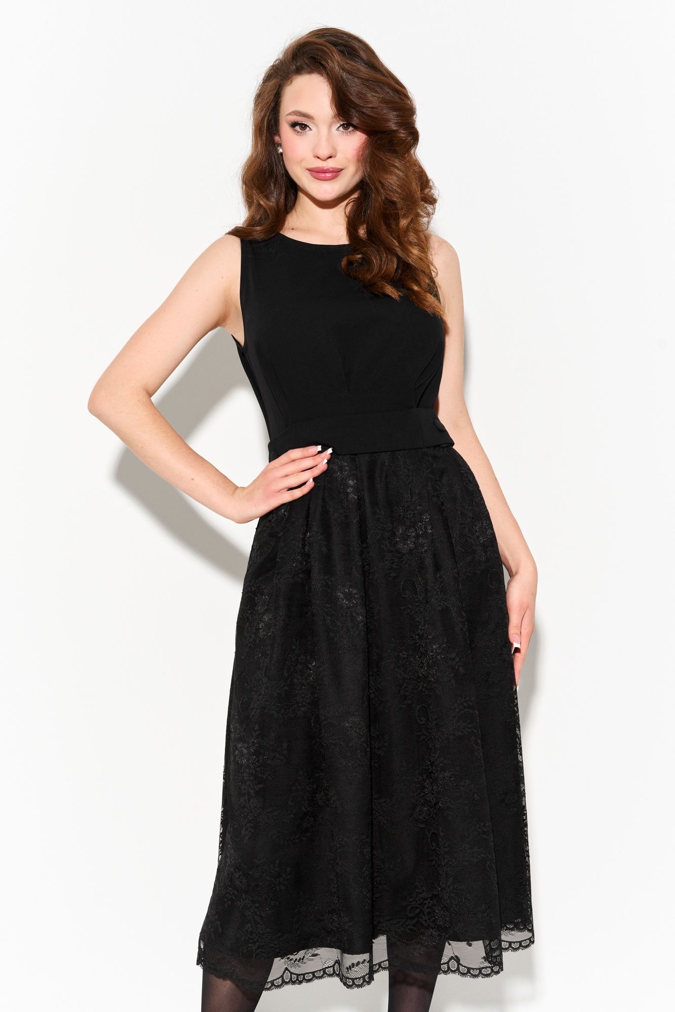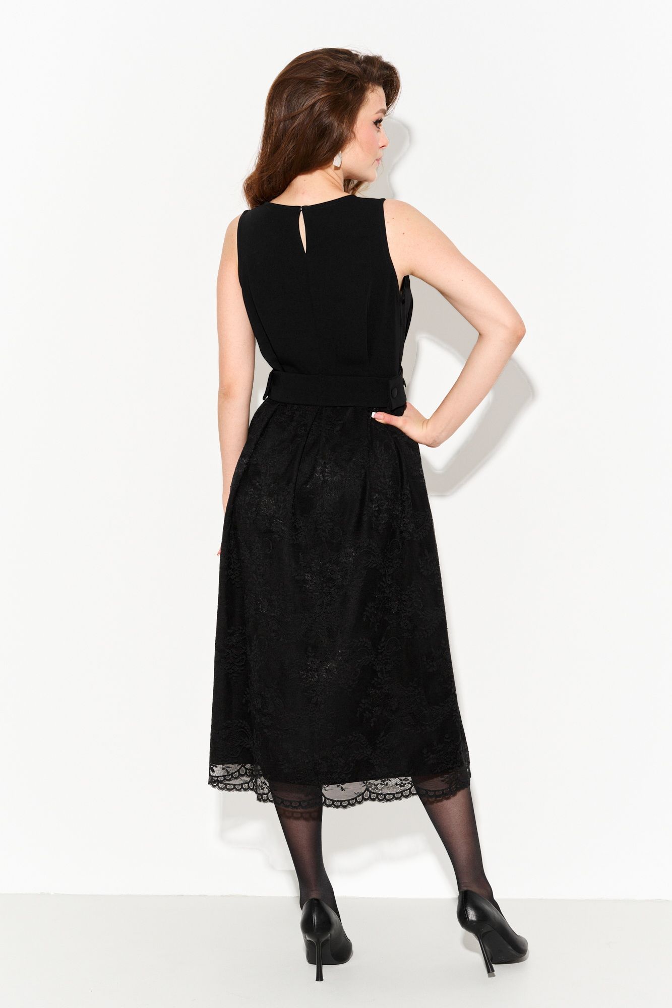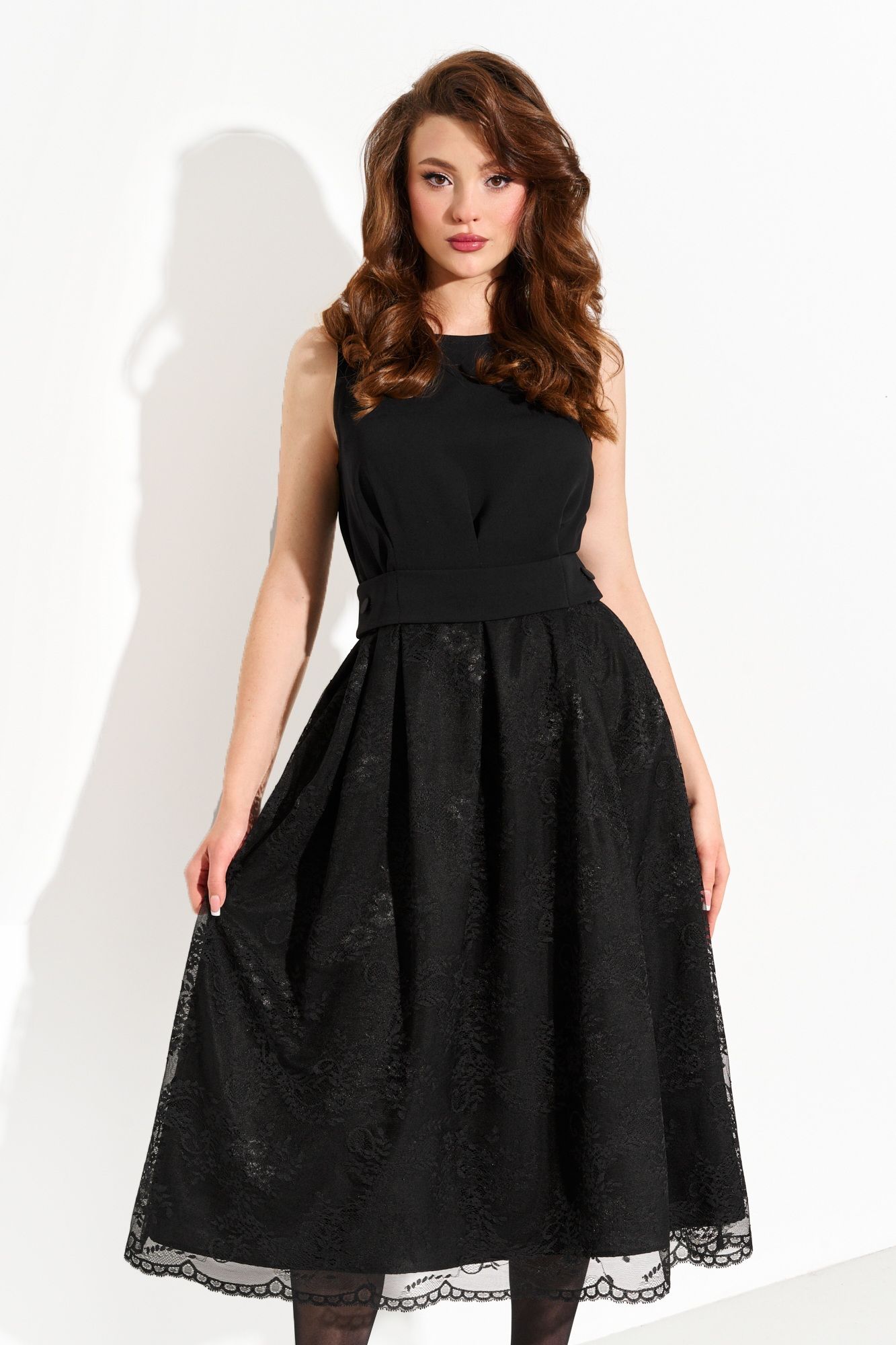Женское нарядное платье А- силуэта. Верхняя часть изделия выполнена из плательной ткани, нижняя часть - из французского кружева на подкладке из крепа. На линии талии, спинке и по переду платья находятся складки с настрочным (не съемным) функциональным поясом, который застегивается на петли и пуговицы, регулируя линию талии. По спинке застежка на петлю и пуговицу. Платье полностью соответсвует заявленному размеру. Уход: - при стирке в стиральной машине выбрать бережный либо деликатный режим; - температура воды не выше 30 градусов.