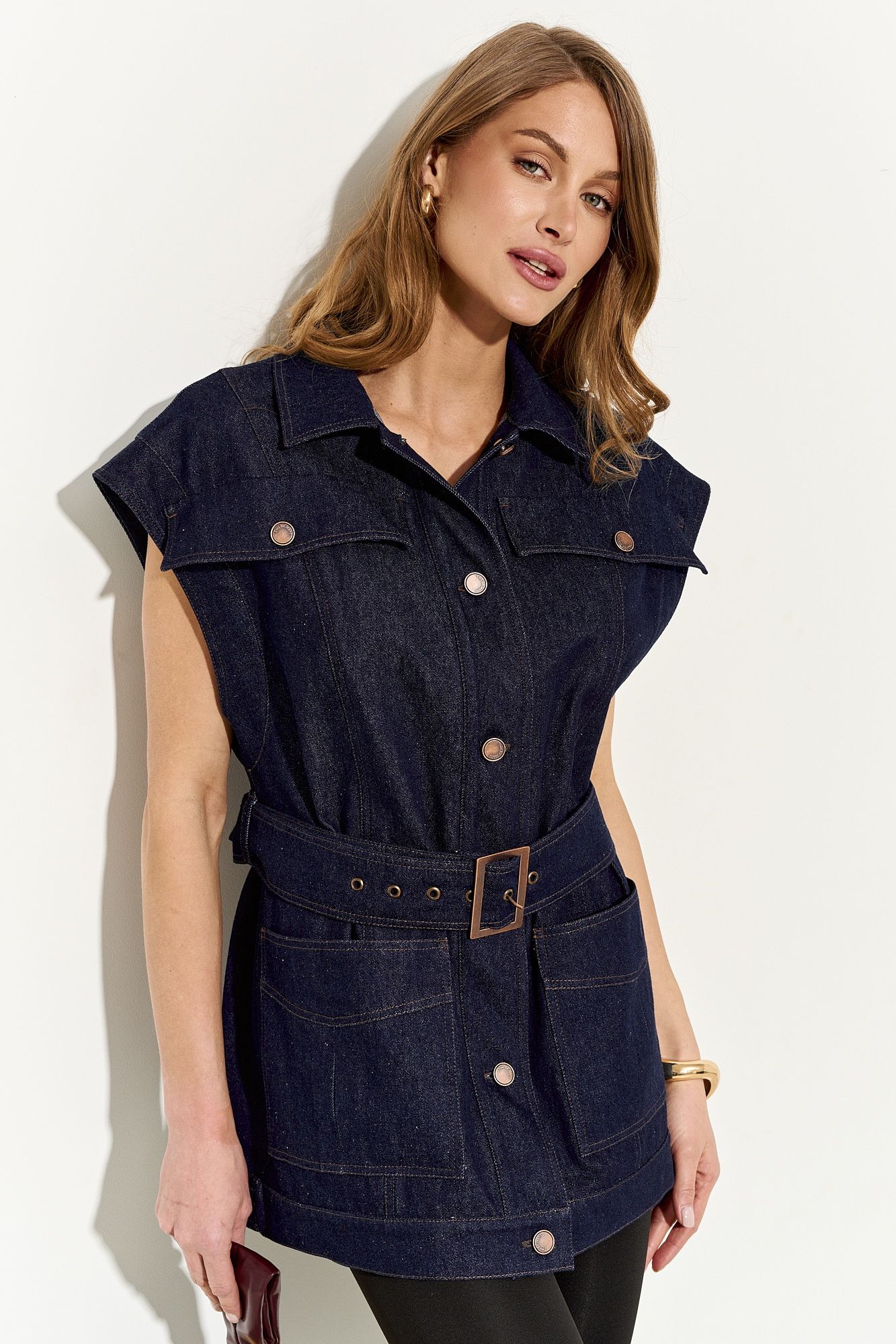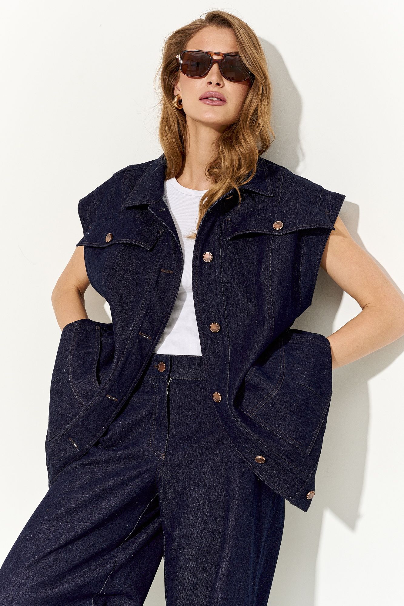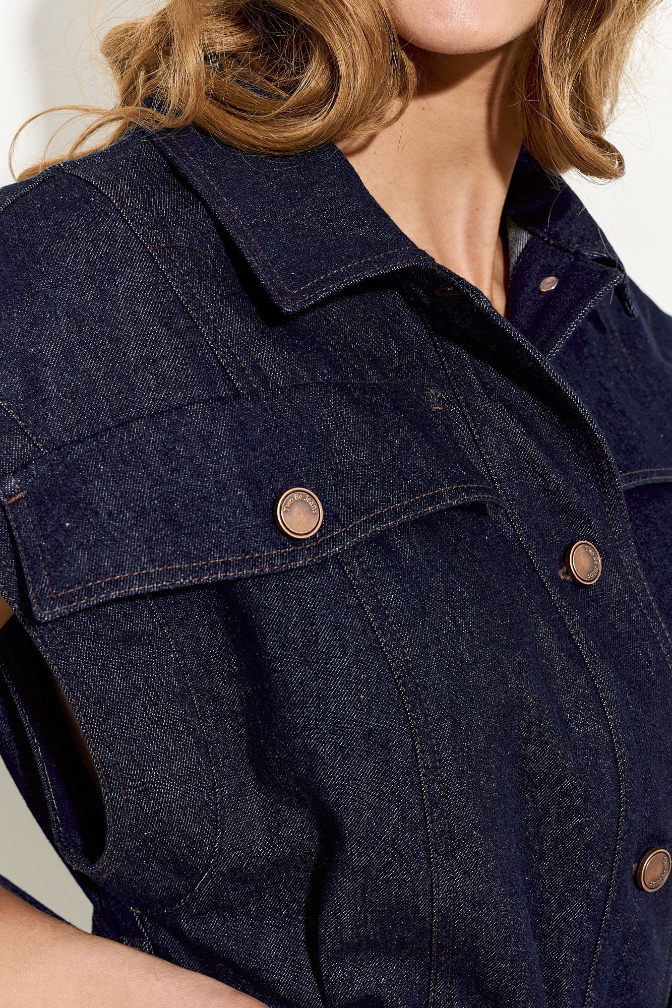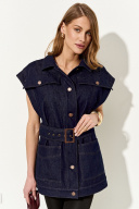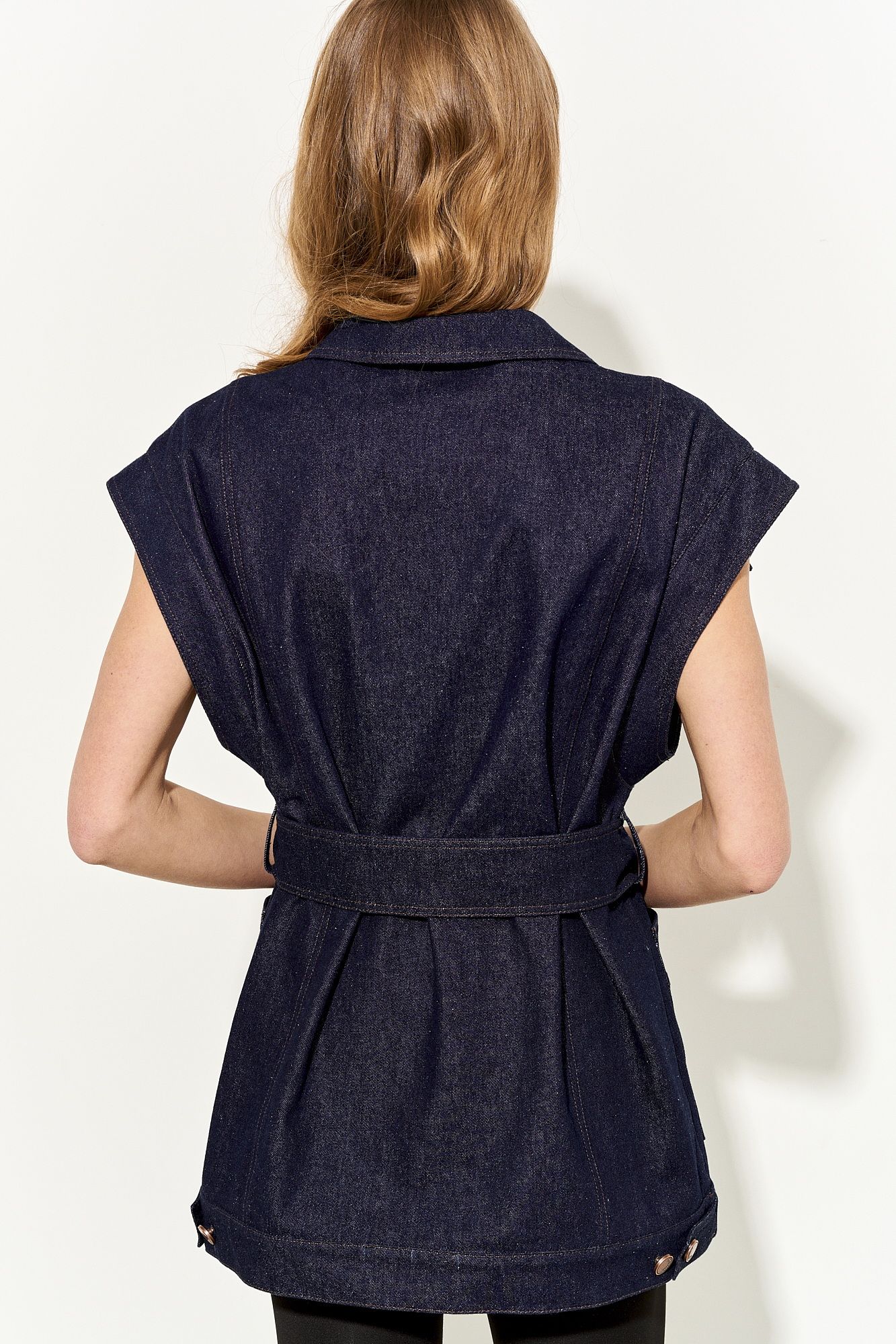 Стильный женский жилет свободного кроя выполнен из натурального хлопкового джинса без подкладки; по переду клапаны-обманки и прорезные функциональные карманы; воротник рубашечный; линия плеча немного спущена; застежка на петли и пуговицы. По спинке хлястики, которыми можно регулировать объем жилета. В комплекте сьемный пояс из основной ткани. Жилет полностью соответсвует заявленному размеру. Пожалуйста, пользуйтесь таблицей замеров готового изделия, чтобы подобрать идеальный размер. Уход за изделиями: - при стирке в стиральной машине выбрать бережный либо деликатный режим, - температура воды не выше 30 градусов; - рекомендована химчистка.
