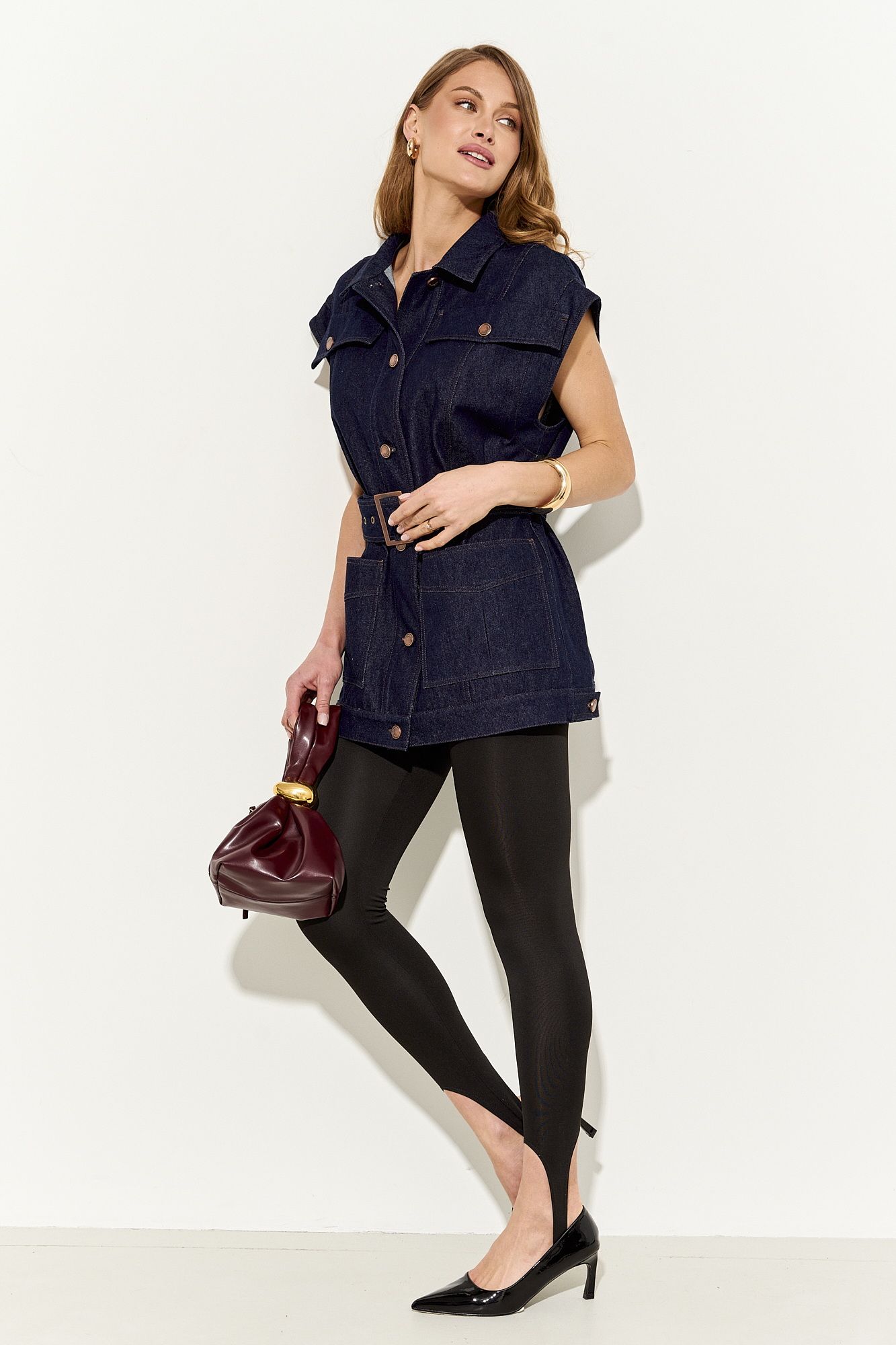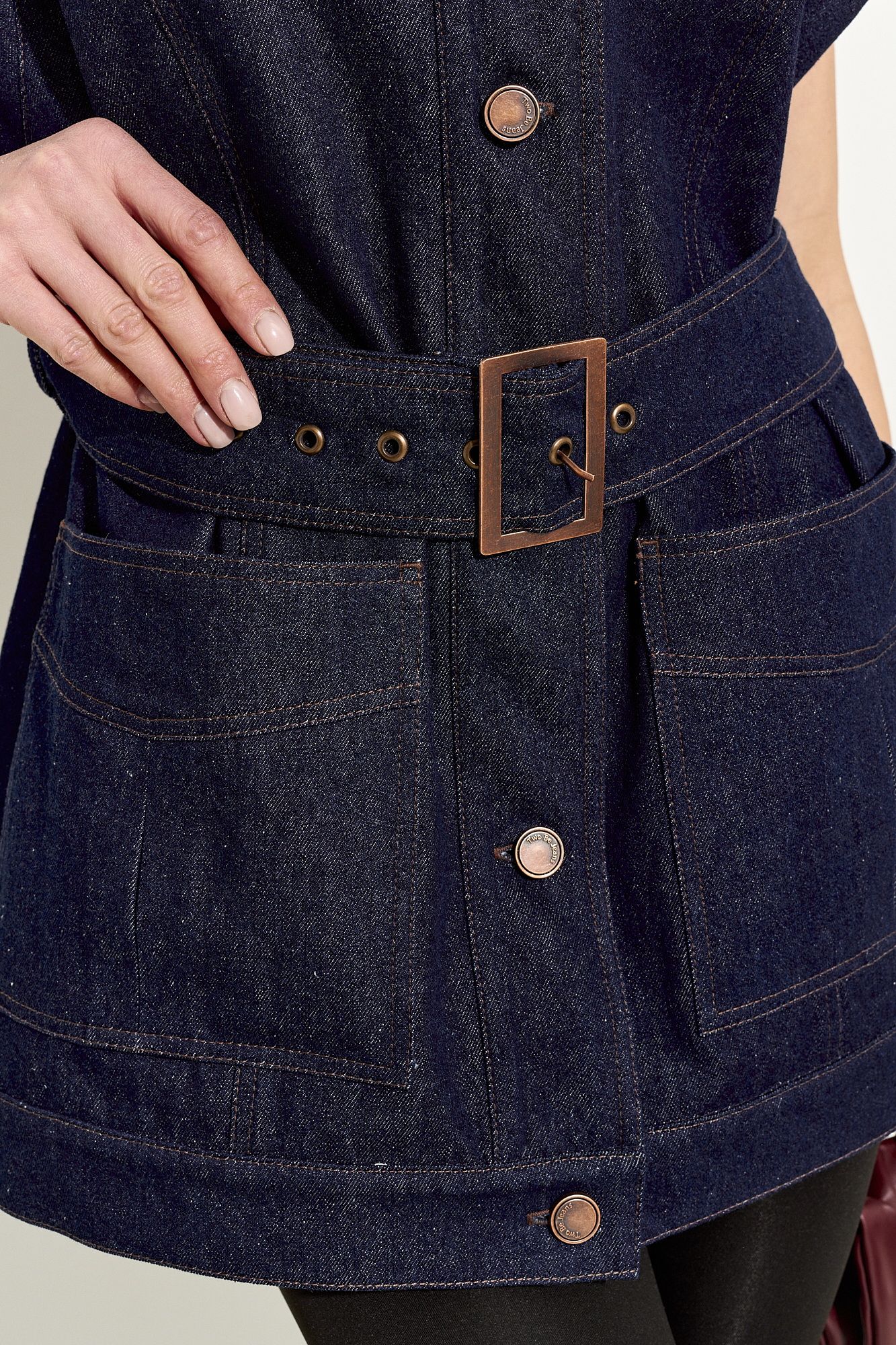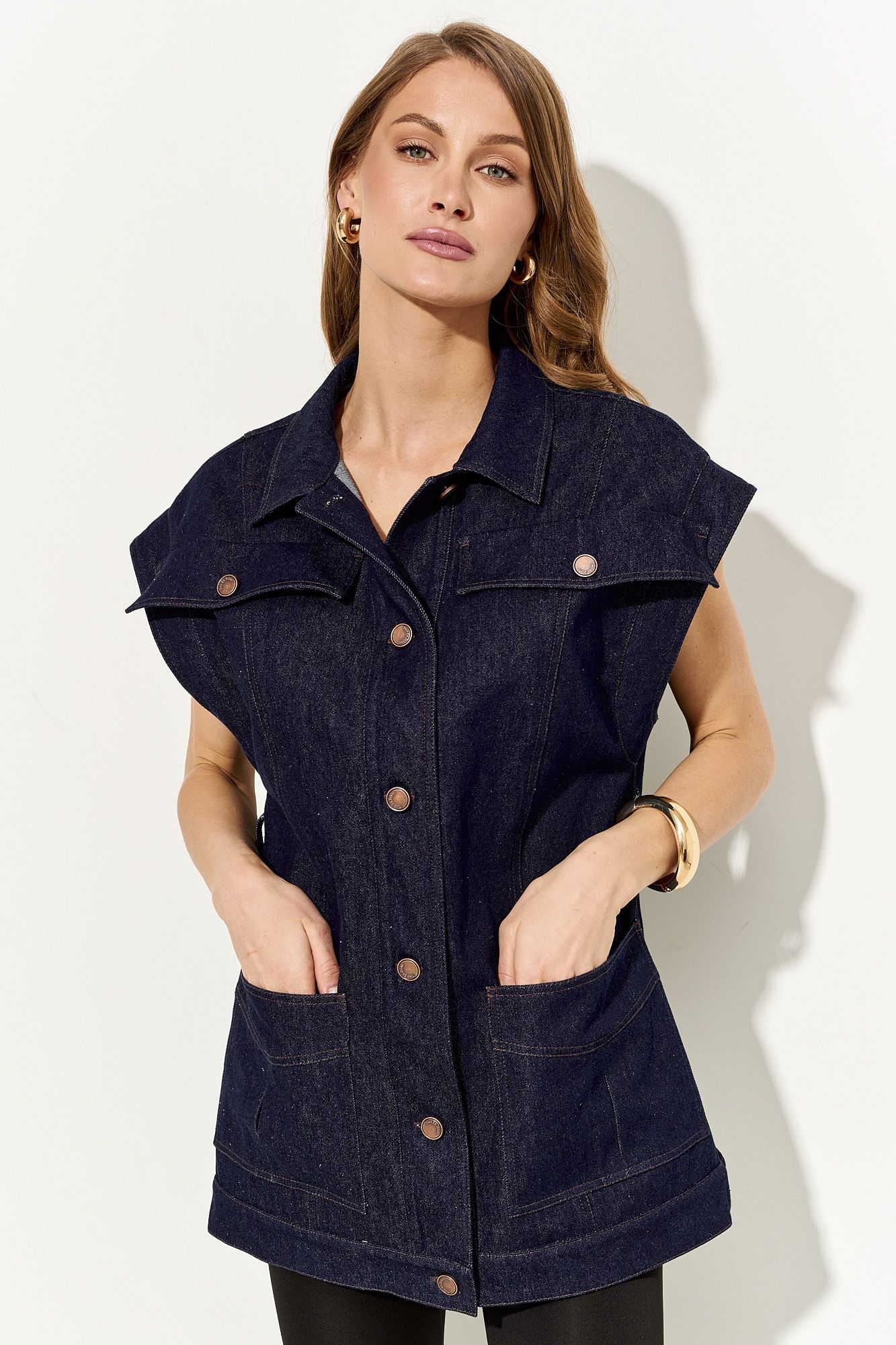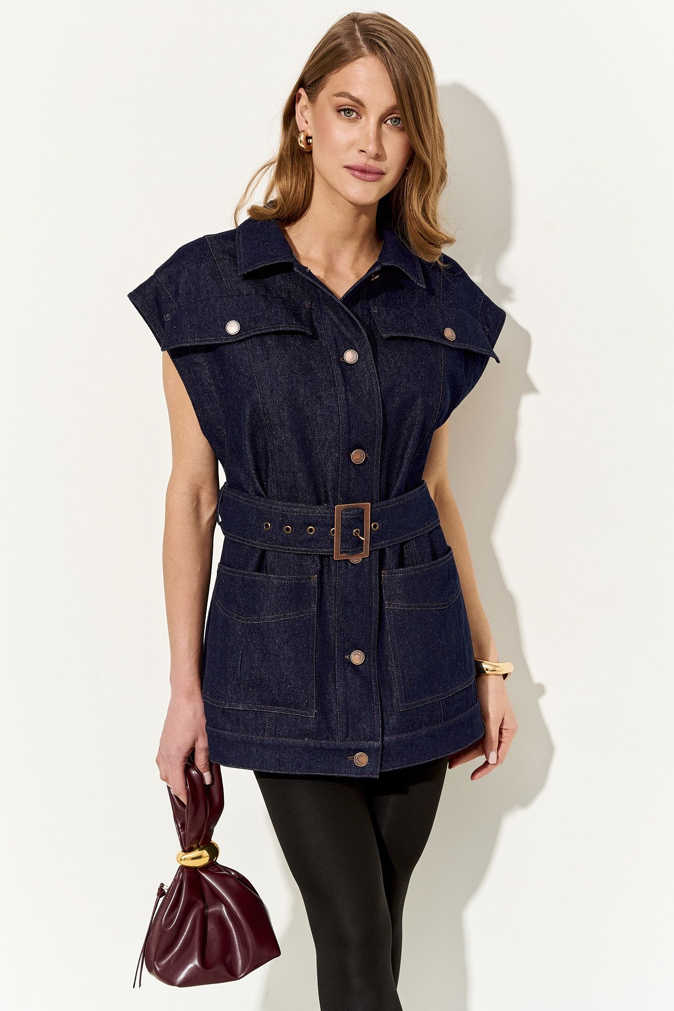 Стильный женский жилет свободного кроя выполнен из натурального хлопкового джинса без подкладки; по переду клапаны-обманки и прорезные функциональные карманы; воротник рубашечный; линия плеча немного спущена; застежка на петли и пуговицы. По спинке хлястики, которыми можно регулировать объем жилета. В комплекте сьемный пояс из основной ткани. Жилет полностью соответсвует заявленному размеру. Пожалуйста, пользуйтесь таблицей замеров готового изделия, чтобы подобрать идеальный размер. Уход за изделиями: - при стирке в стиральной машине выбрать бережный либо деликатный режим, - температура воды не выше 30 градусов; - рекомендована химчистка.