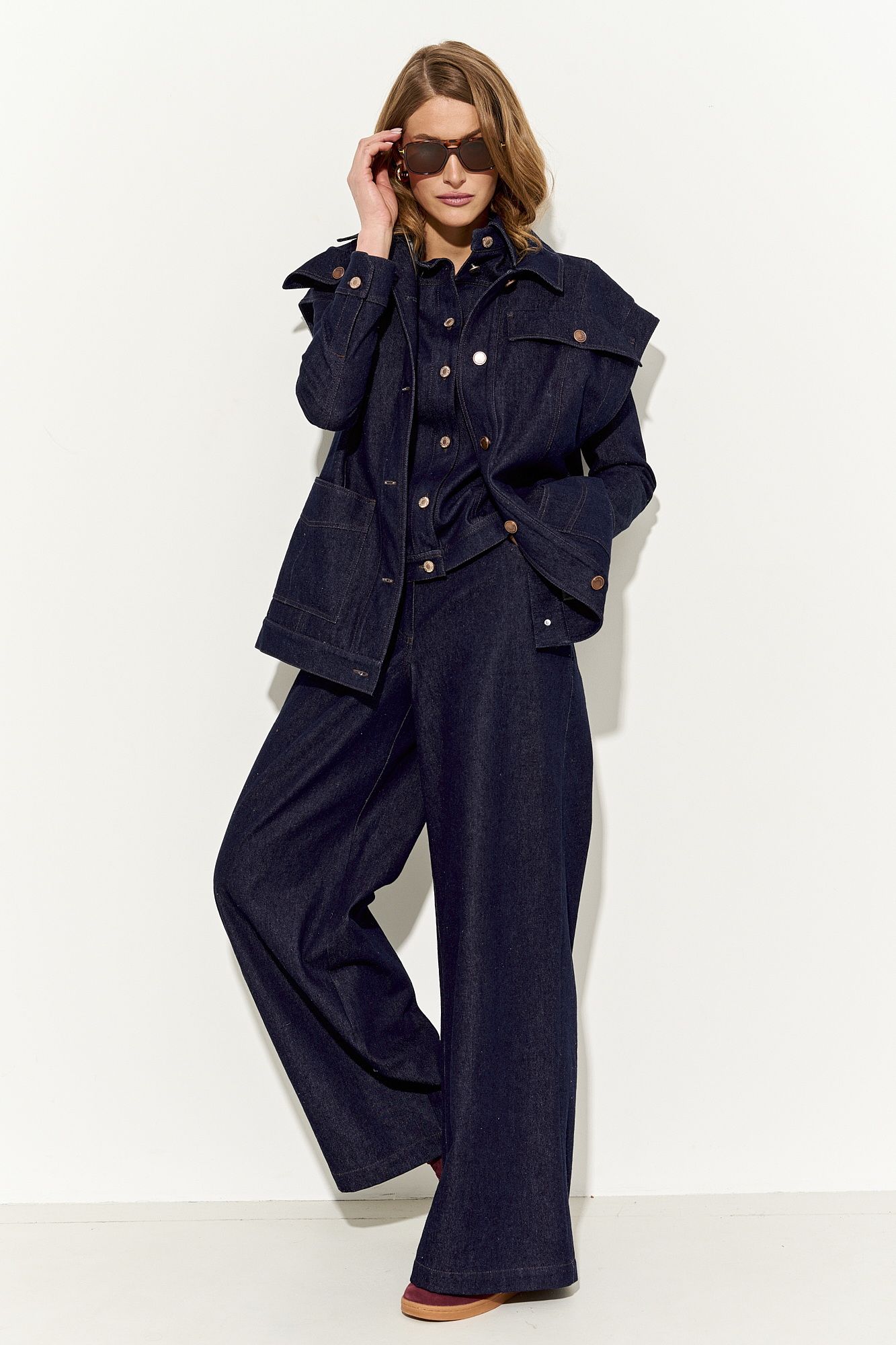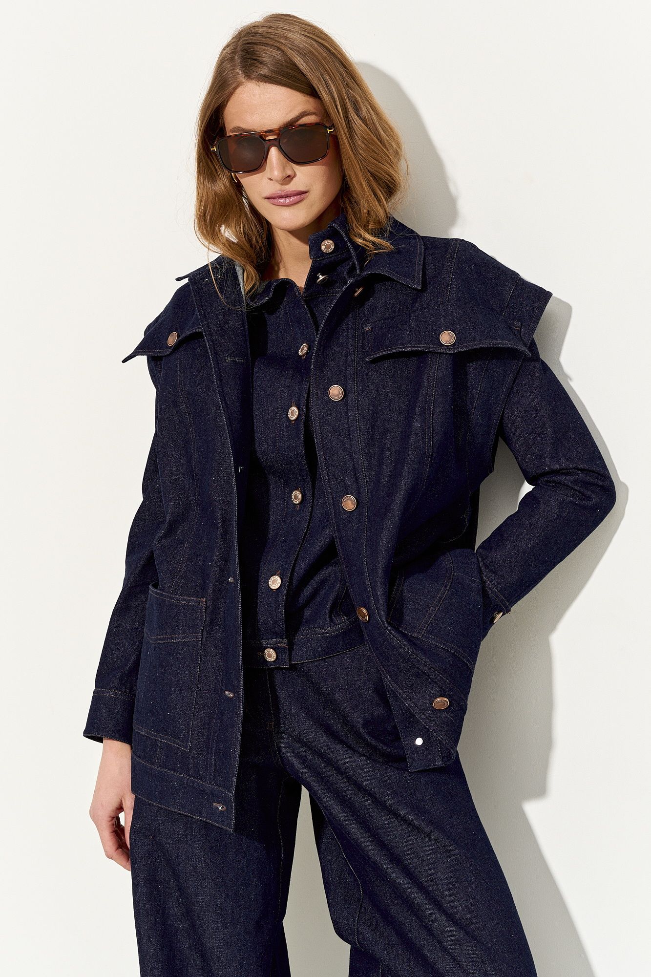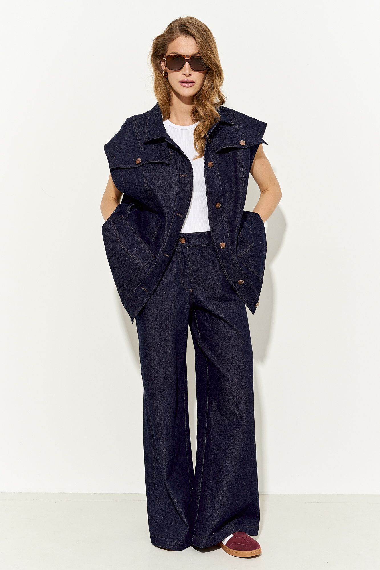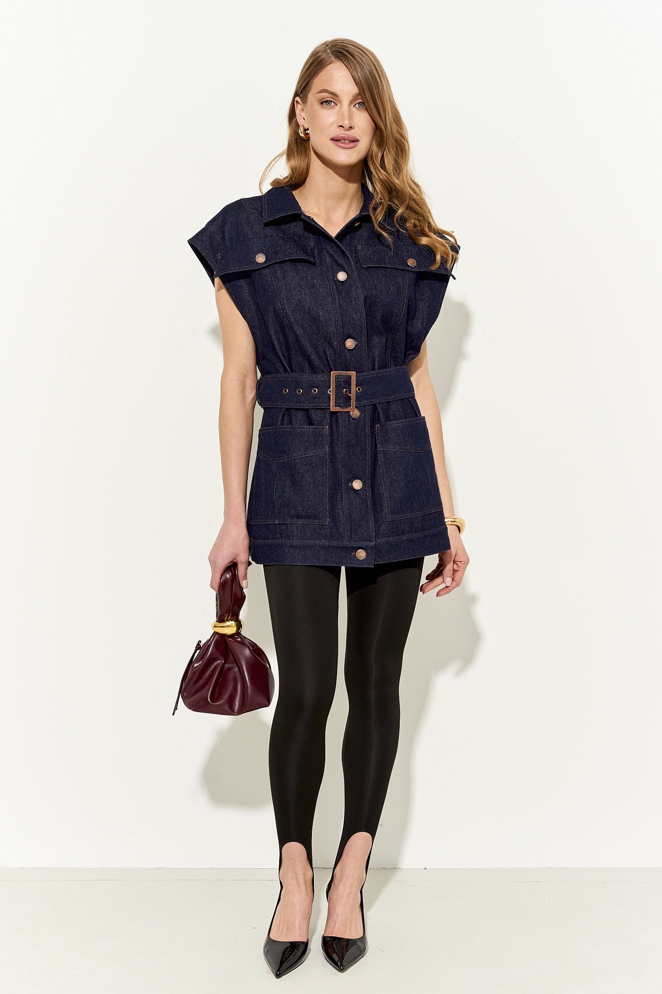 Стильный женский жилет свободного кроя выполнен из натурального хлопкового джинса без подкладки; по переду клапаны-обманки и прорезные функциональные карманы; воротник рубашечный; линия плеча немного спущена; застежка на петли и пуговицы. По спинке хлястики, которыми можно регулировать объем жилета. В комплекте сьемный пояс из основной ткани. Жилет полностью соответсвует заявленному размеру. Пожалуйста, пользуйтесь таблицей замеров готового изделия, чтобы подобрать идеальный размер. Уход за изделиями: - при стирке в стиральной машине выбрать бережный либо деликатный режим, - температура воды не выше 30 градусов; - рекомендована химчистка.