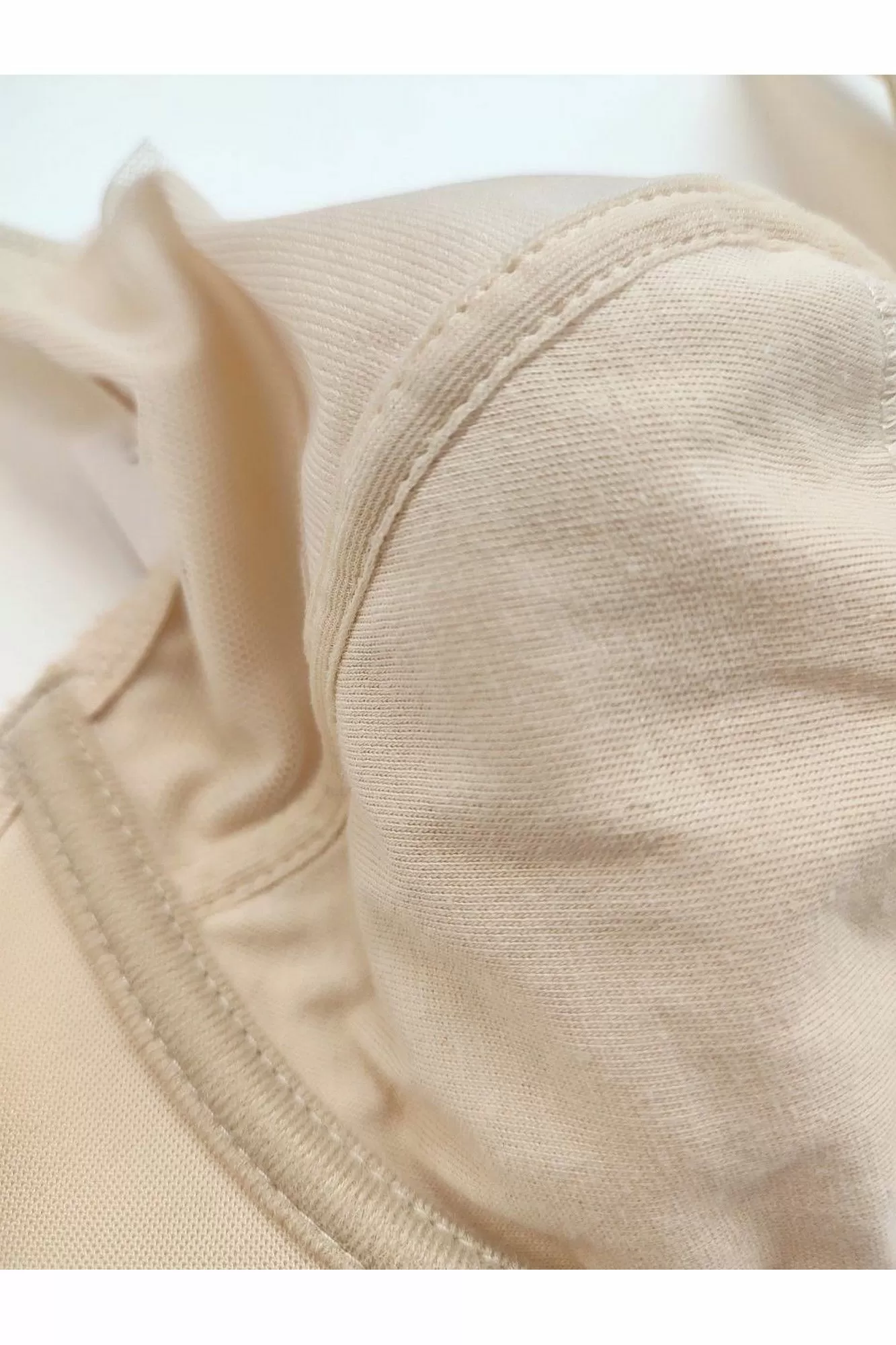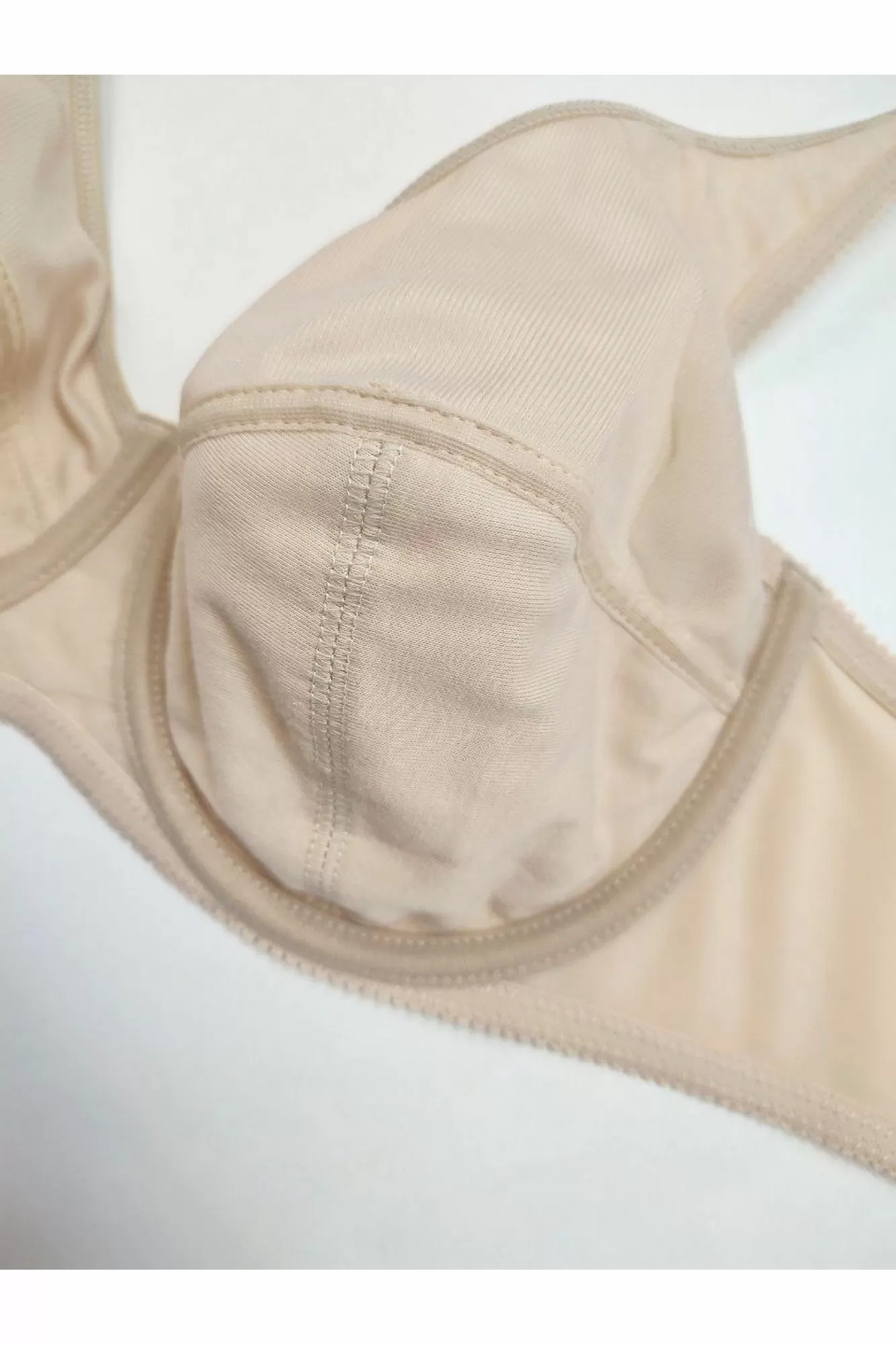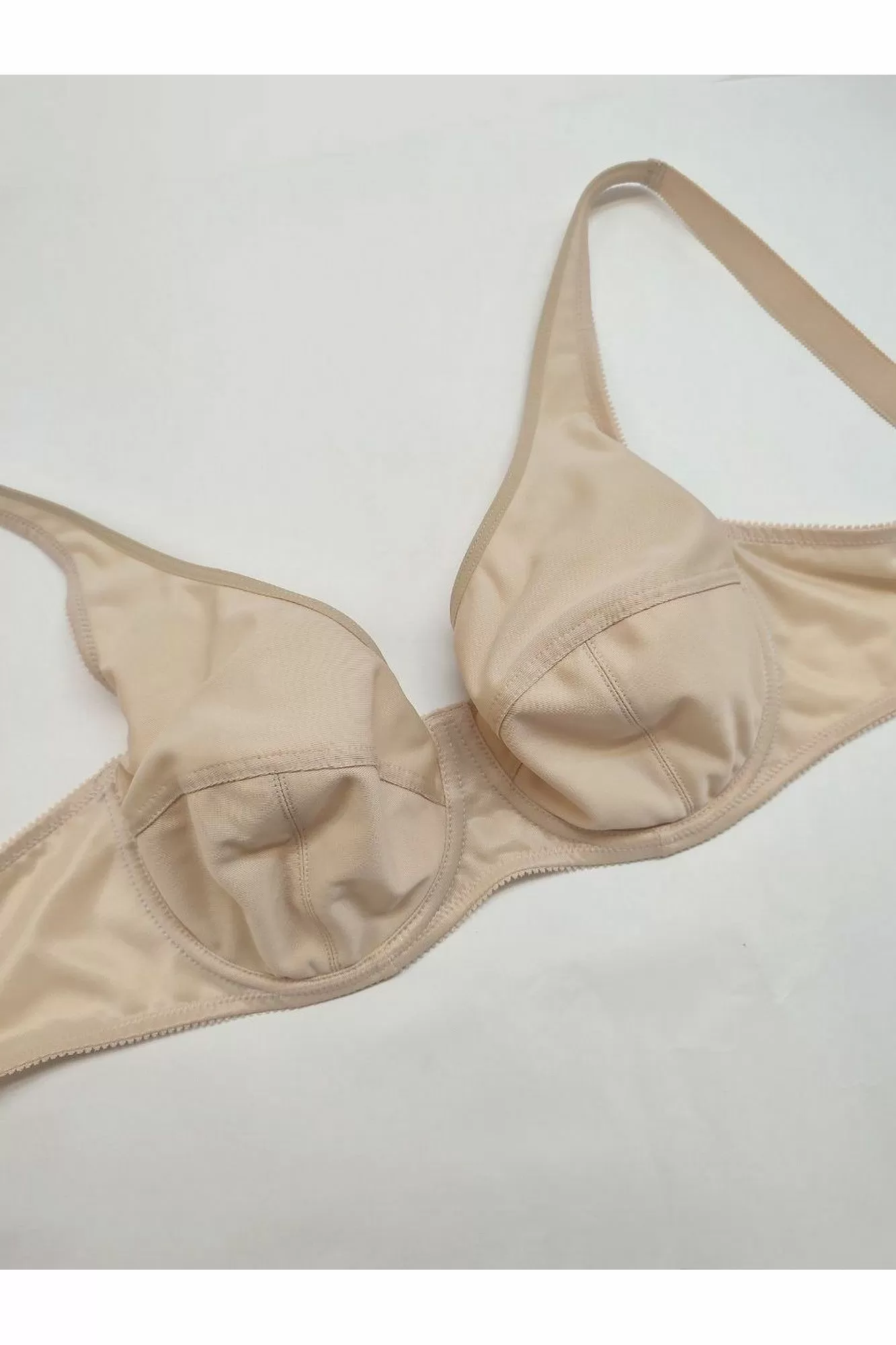 Бюстгальтер гладкий с мягкой чашкой на каркасах, больших размеров. Изготовлен из трикотажного полотна. Чашка высокая закрытая, с дополнительными поддерживающими деталями по бокам. Бретели широкие усиленные вставками из функционального полотна. Края верха чашки обработаны окантовкой. Верхняя часть чашки однослойная, нижняя часть двухслойная с подкладкой их хлопка. Чашка с Т-образным швом приподнимает, округляет и поддерживает грудь большого размера. U-образное расположение бретелей. Бретели из эластичной ленты с регулировкой по длине. Застёжка сзади на крючки и петли, 2*3 крючка.