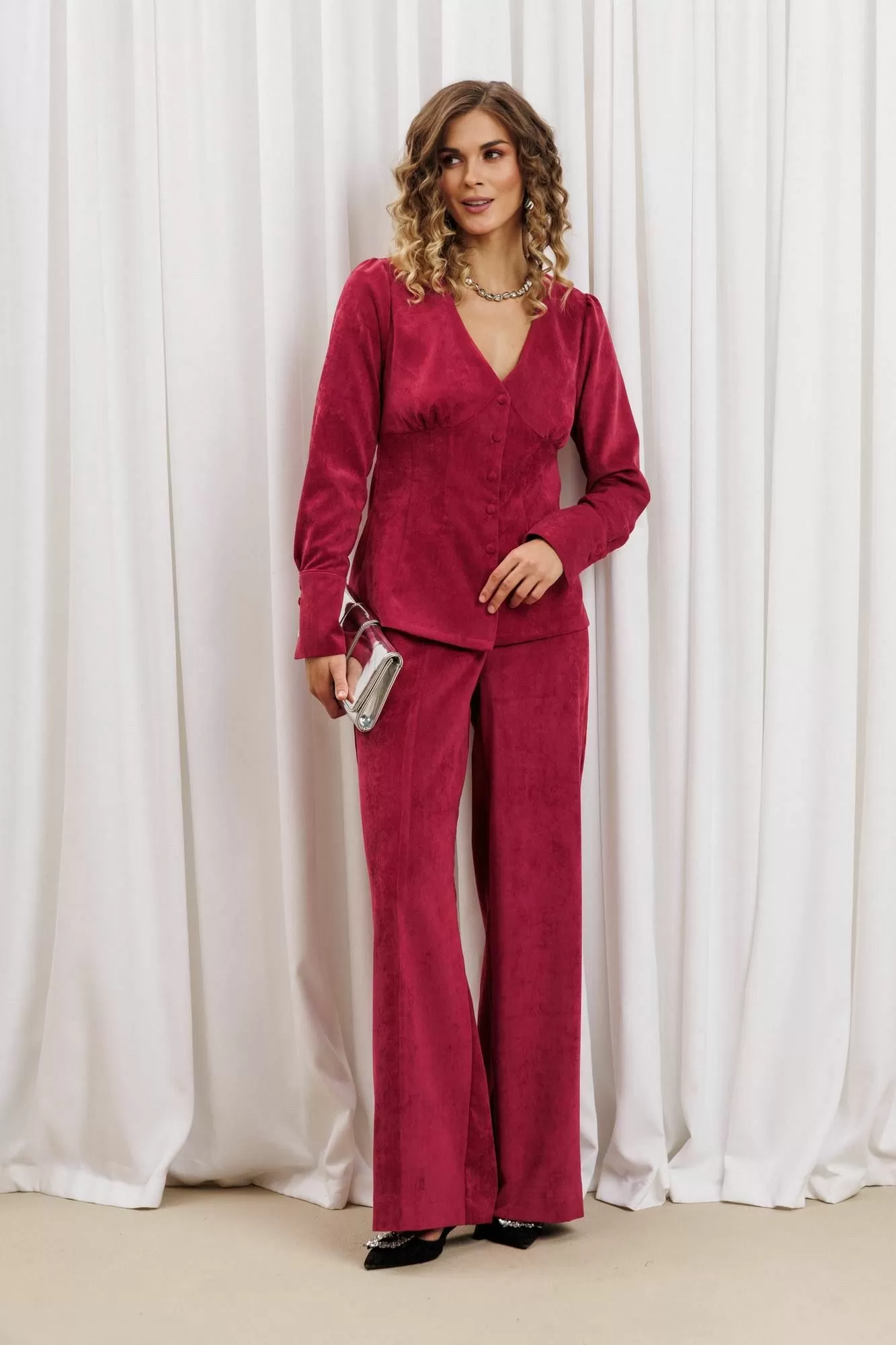 Блузка оригинальная приталенного силуэта из вельветовой ткани. Перед с подрезом под грудью, сборкой в районе груди и талиевыми вытачками. Затсежка на петли и пуговицы. Горловина V-образной формы. Спинка со средним швом и талиевыми вытачками. Рукав втачной со сборкой по окату и с манжетой по низу. Манжета высокая с двумя петлями и пуговицами. Длина блузки - 63 см, длина рукава блузки - 64 см.