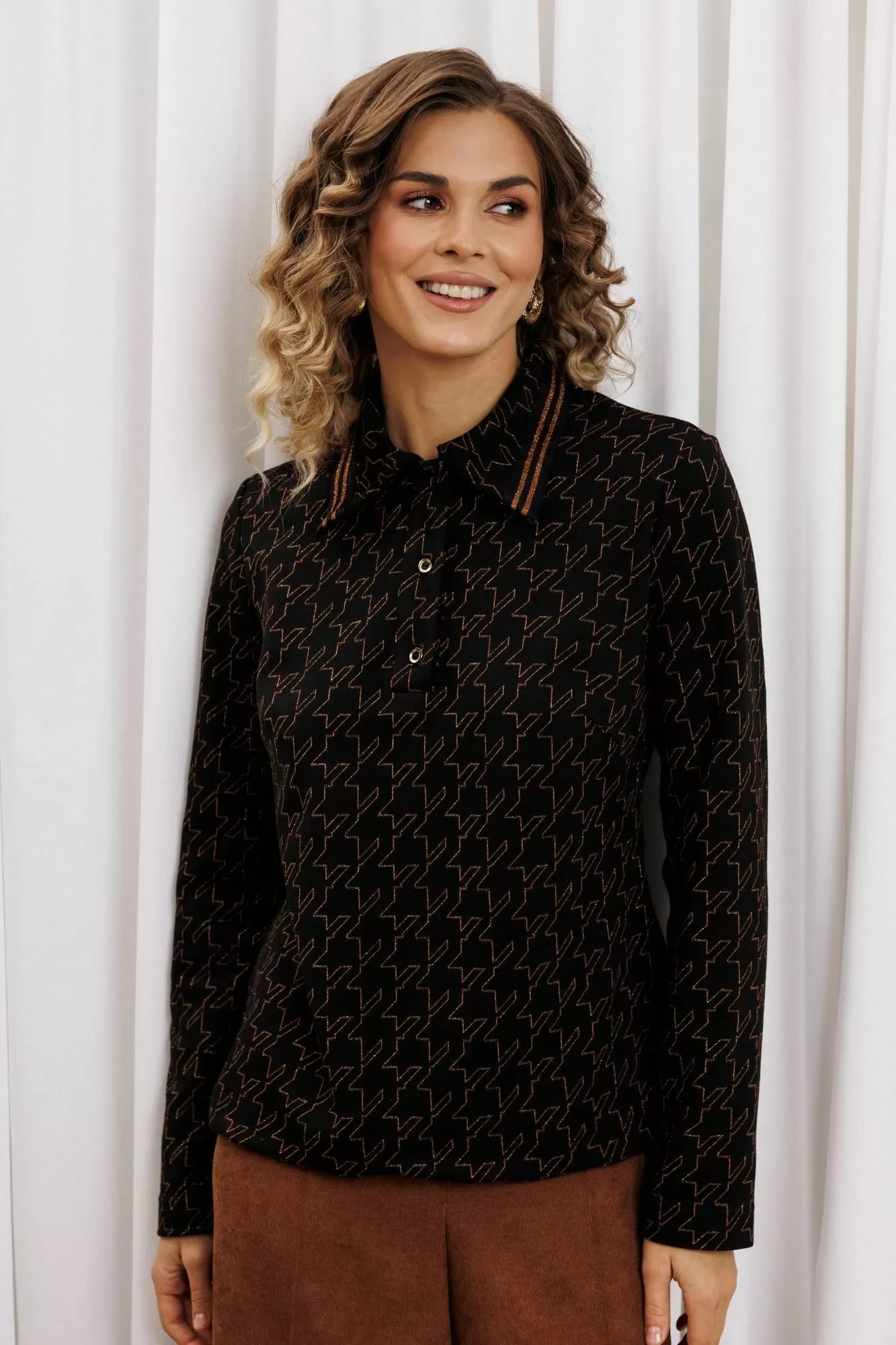 Джемпер прямого силуэта из плотного трикотажного полотна с оригинальным рисунком из люрекса. Перед с застежкой поло и нагрудными вытачками. По воротнику настрочена декоративная тесьма. Длина джемпера - 60 см, длина рукава - 61 см.