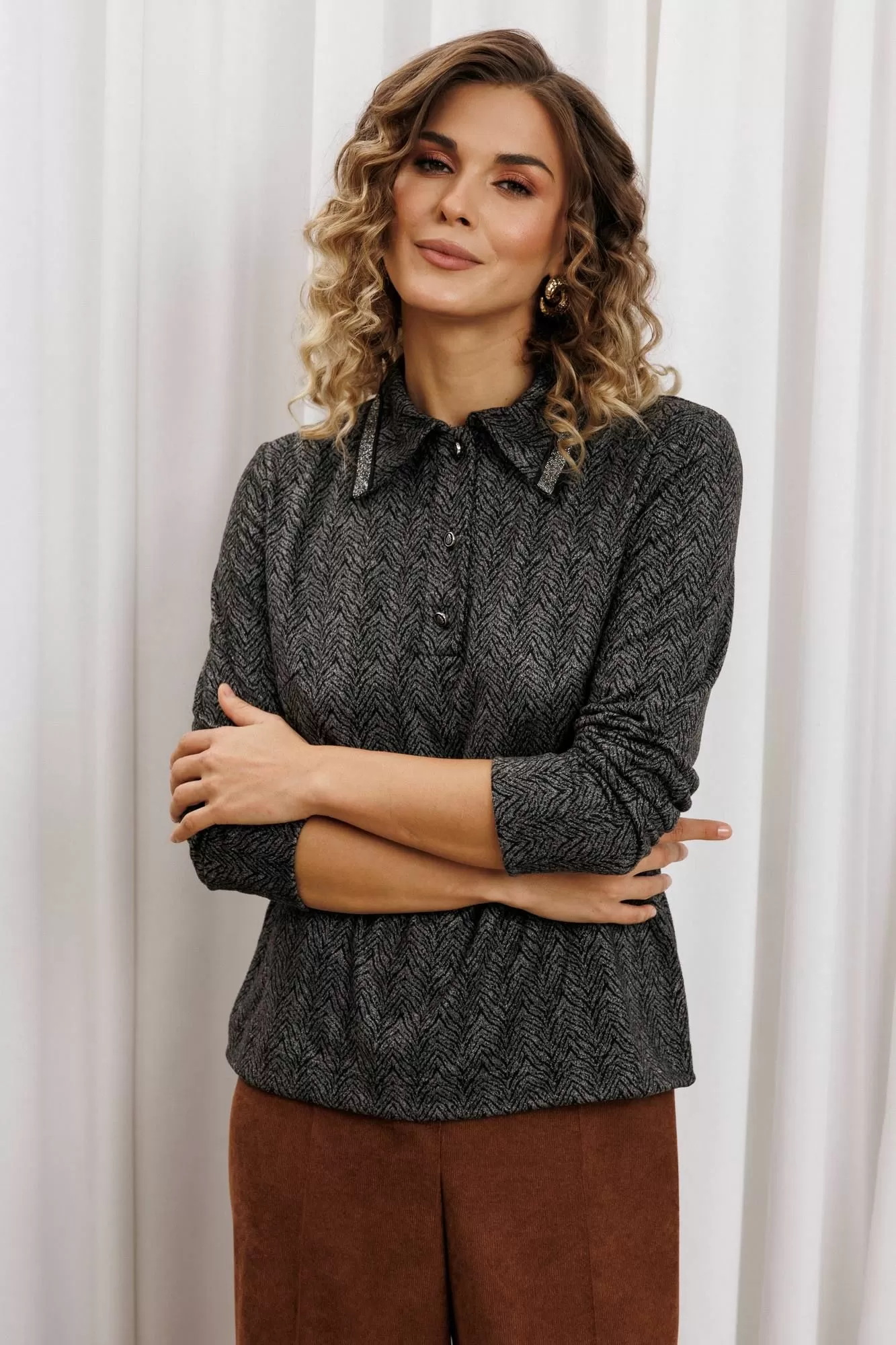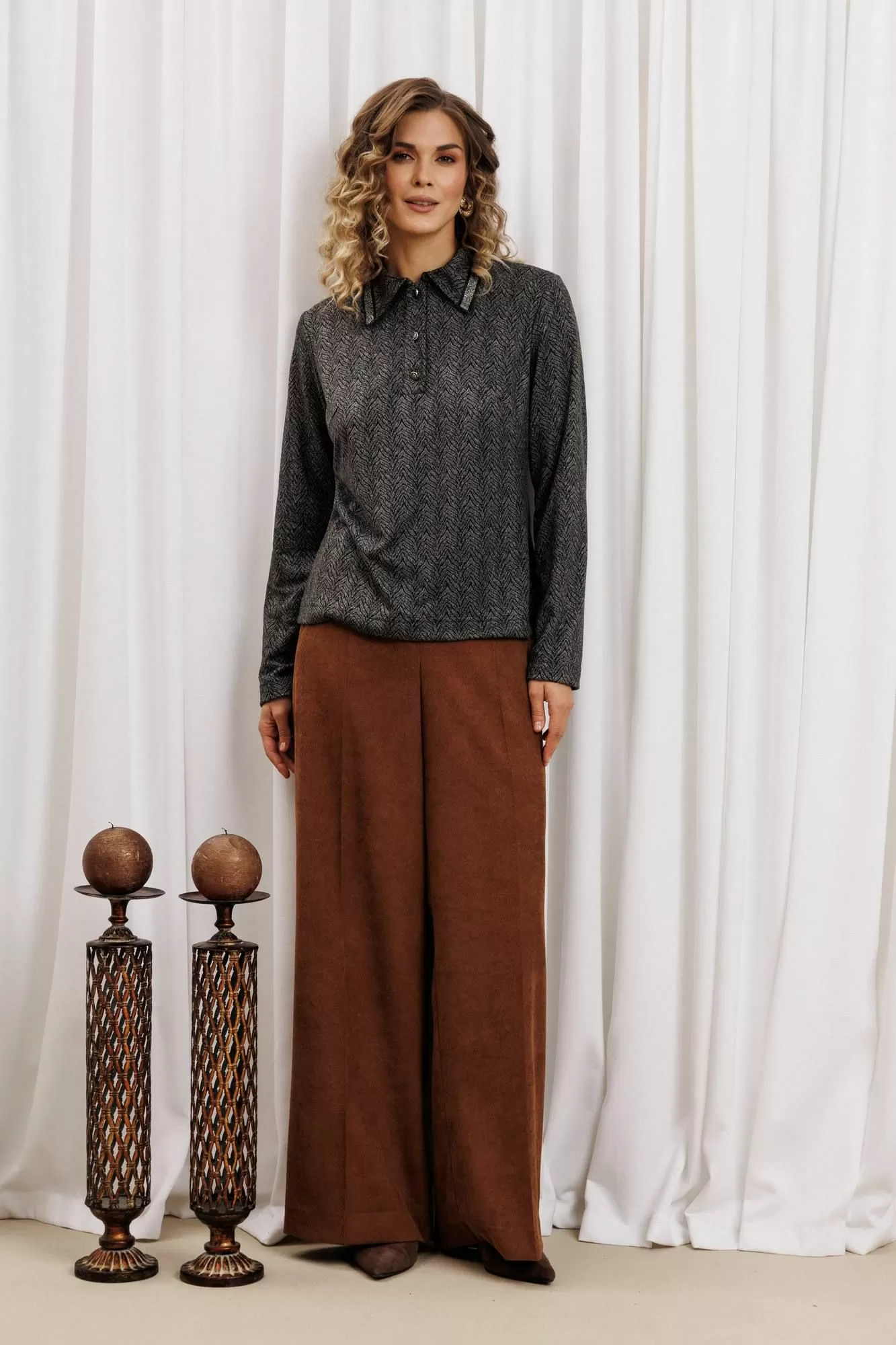 Джемпер прямого силуэта из трикотажного замшевого полотна с тигровым рисунком. Перед с застежкой поло и нагрудными вытачками. По воротнику настрочена декоративная тесьма. Длина джемпера - 60 см, длина рукава - 61 см.