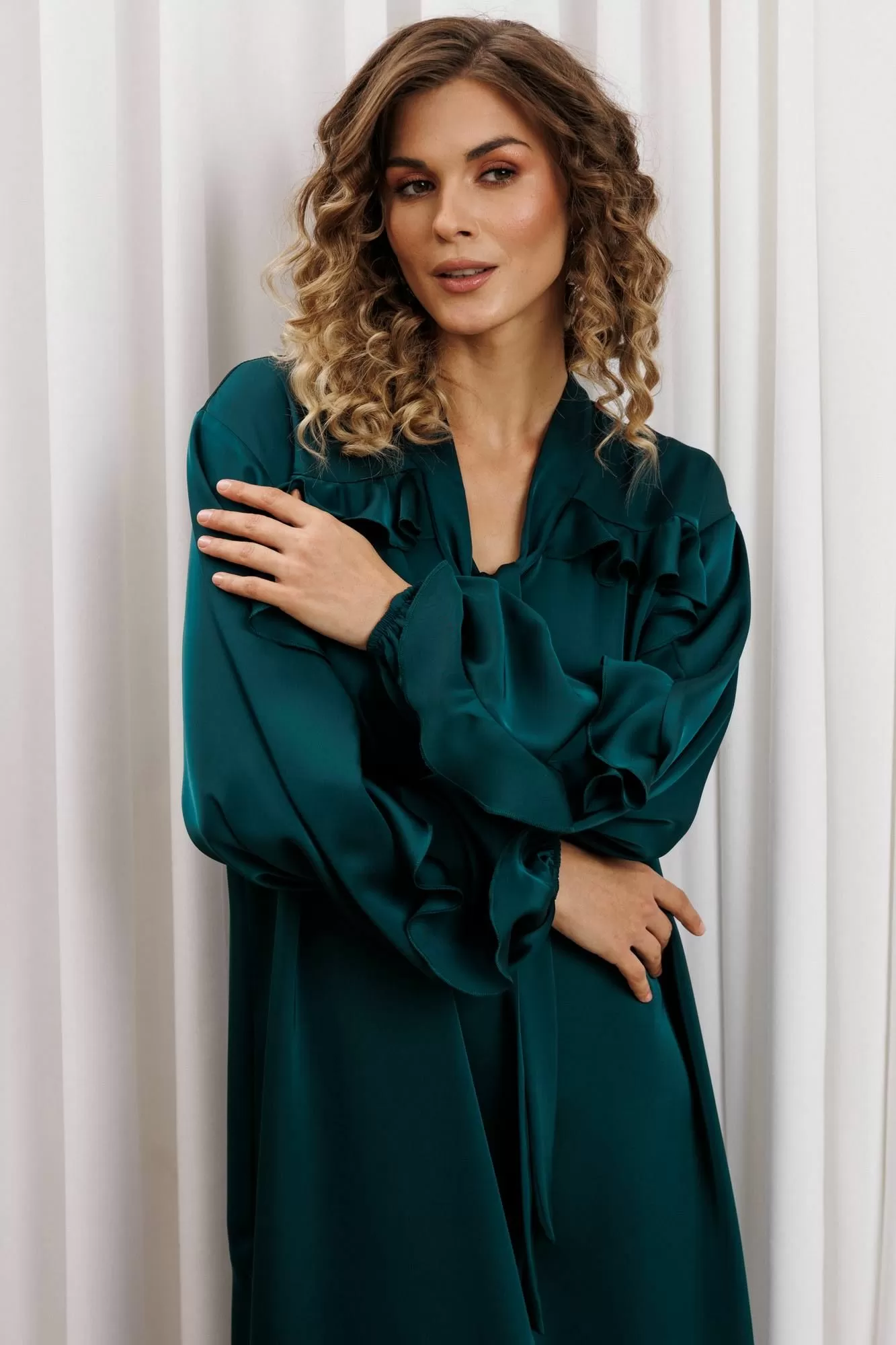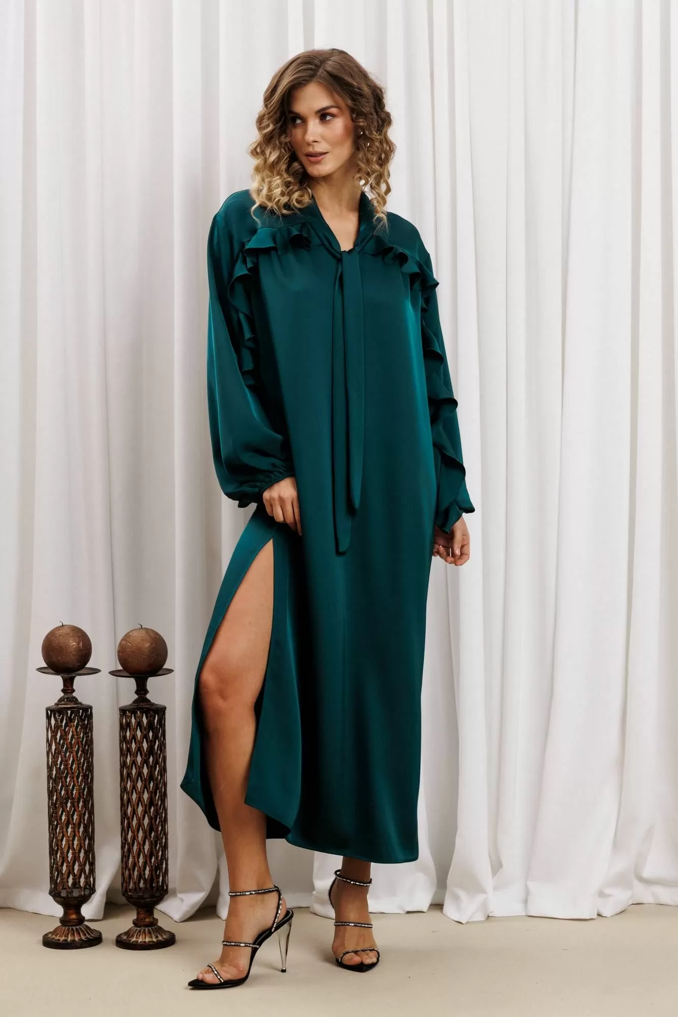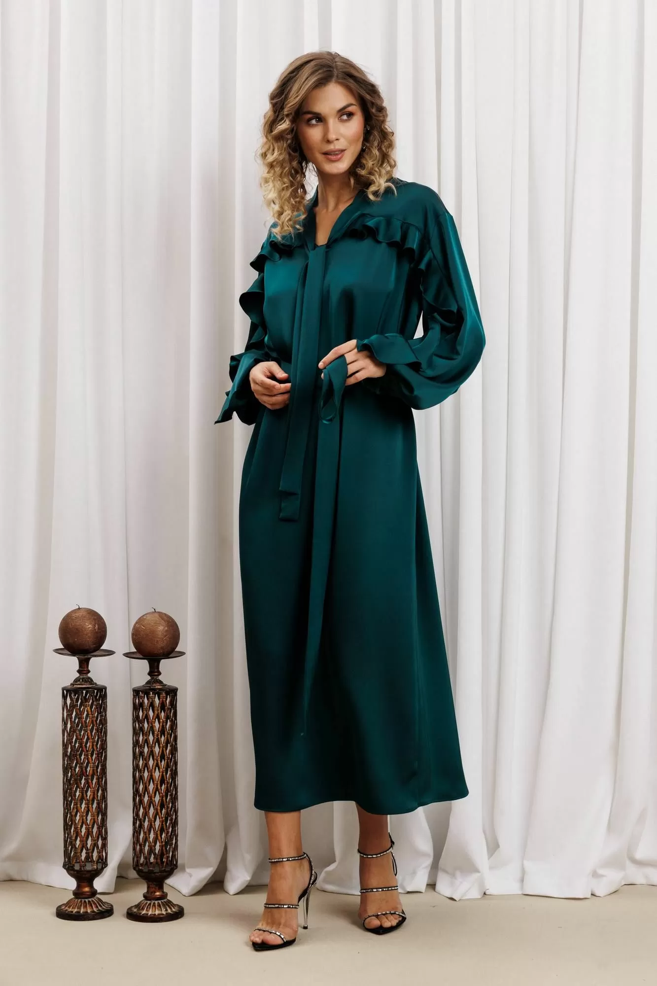 Платье свободного силуэта из струящейся атласной ткани. Перед и спинка с кокеткой и сборкой. Рукав спущенный свободный с резинкой понизу. Вдоль линии кокетки и рукава вставлена рюша. Горловина V-образной формы с воротником стойкой переходящей в бант. В боковом шве разрез. К платью прилагается пояс из основной ткани. Длина платья - 127 см, длина рукава - 60 см.
