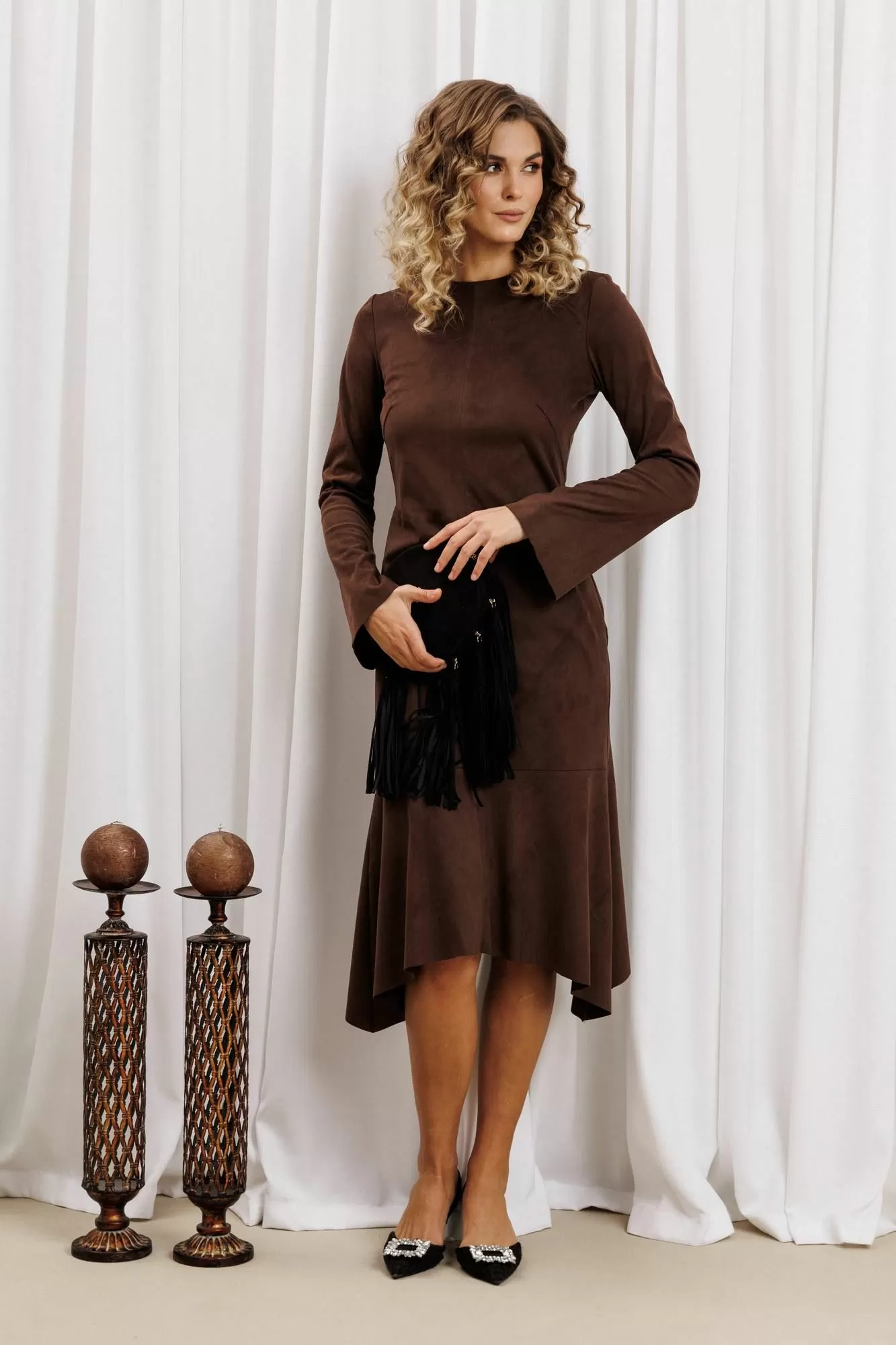 Платье приталенного силуэта отрезное по линии талии из мягкой замшевой ткани. Перед со средним швом и нагрудной вытачкой. Спинка с талиевыми вытачками, средним швом и потайной молнией. Рукав втачной слегка расширенный книзу. По низу изделия ассиметричный волан. Средний шов и шов вдоль талии отстрочен отделочной нитью. Длина платья по среднему шву сзади 103 см, по самым длинным концам - 115 см, длина рукава 62 см.