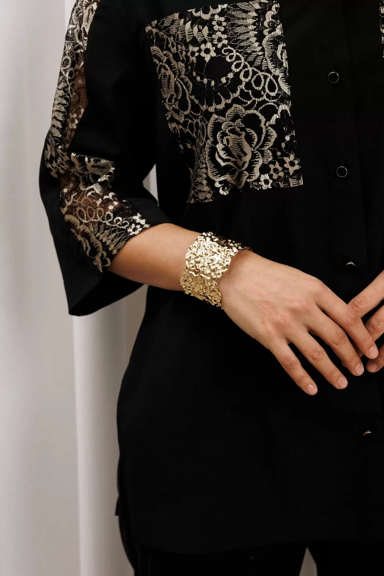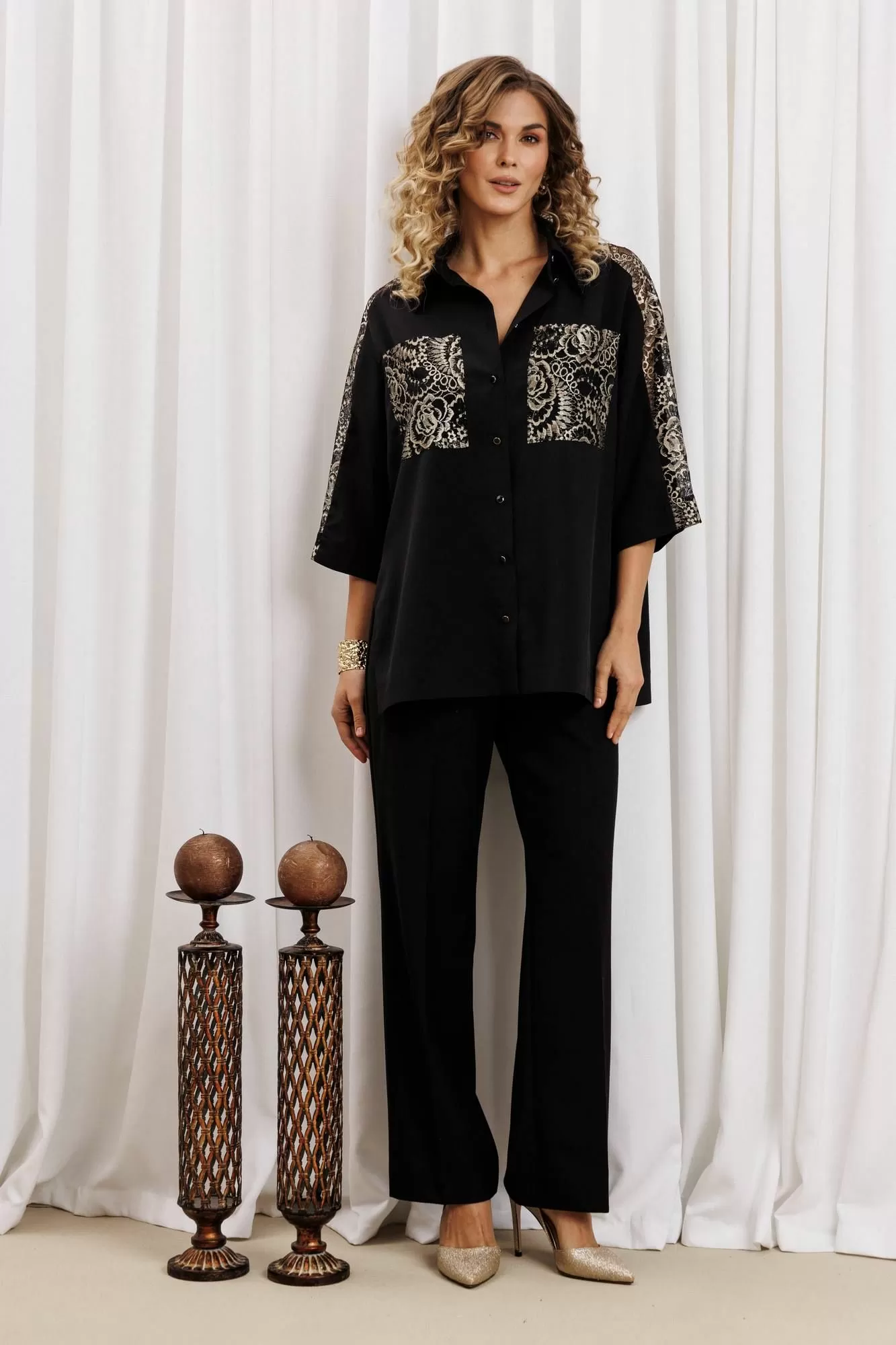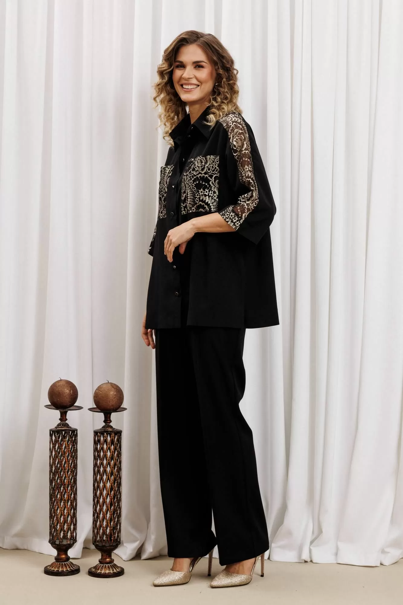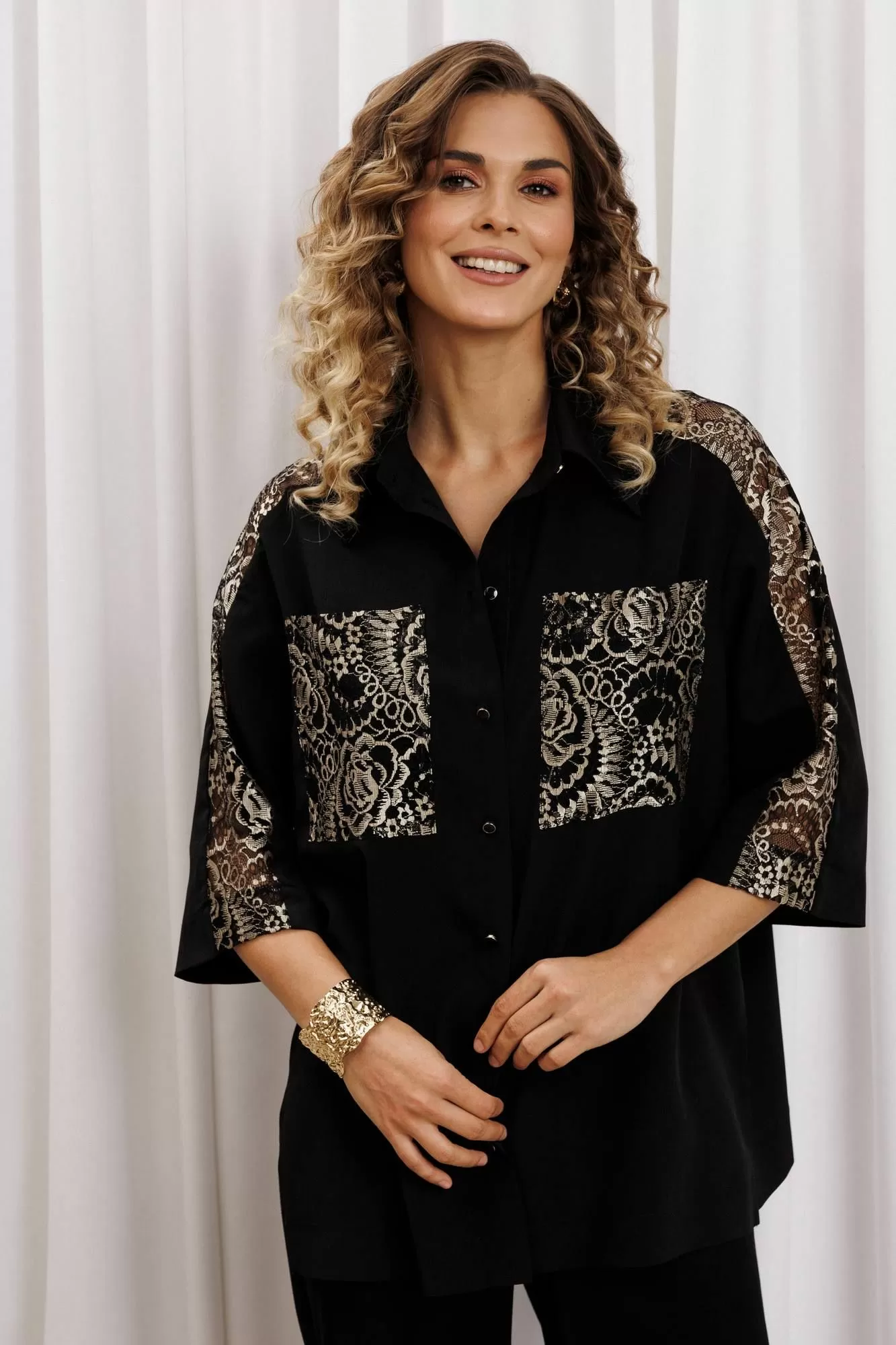 Рубашка свободного силуэта из из блузочного крепа. Застежка центральная на петли и пуговицы, воротник на стойке. В боковых швах разрезы. Рукав втачной рубашечного кроя. Карманы спереди и вставка вдоль плеча и рукава выполнеы из кружева. Длина рубашки- 71 см. длина рукава рубашки - 35 см.