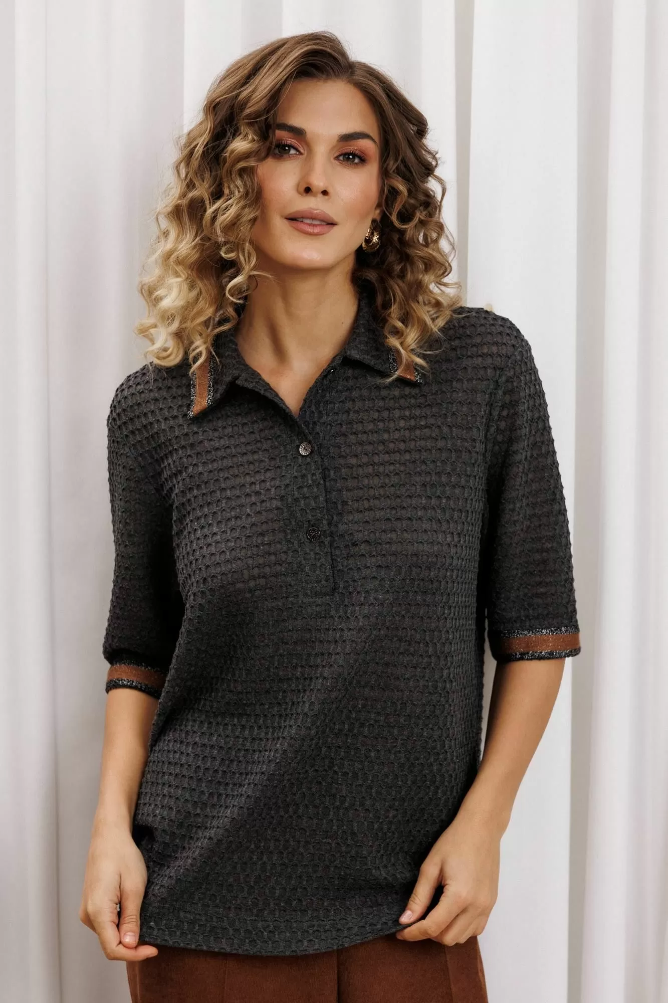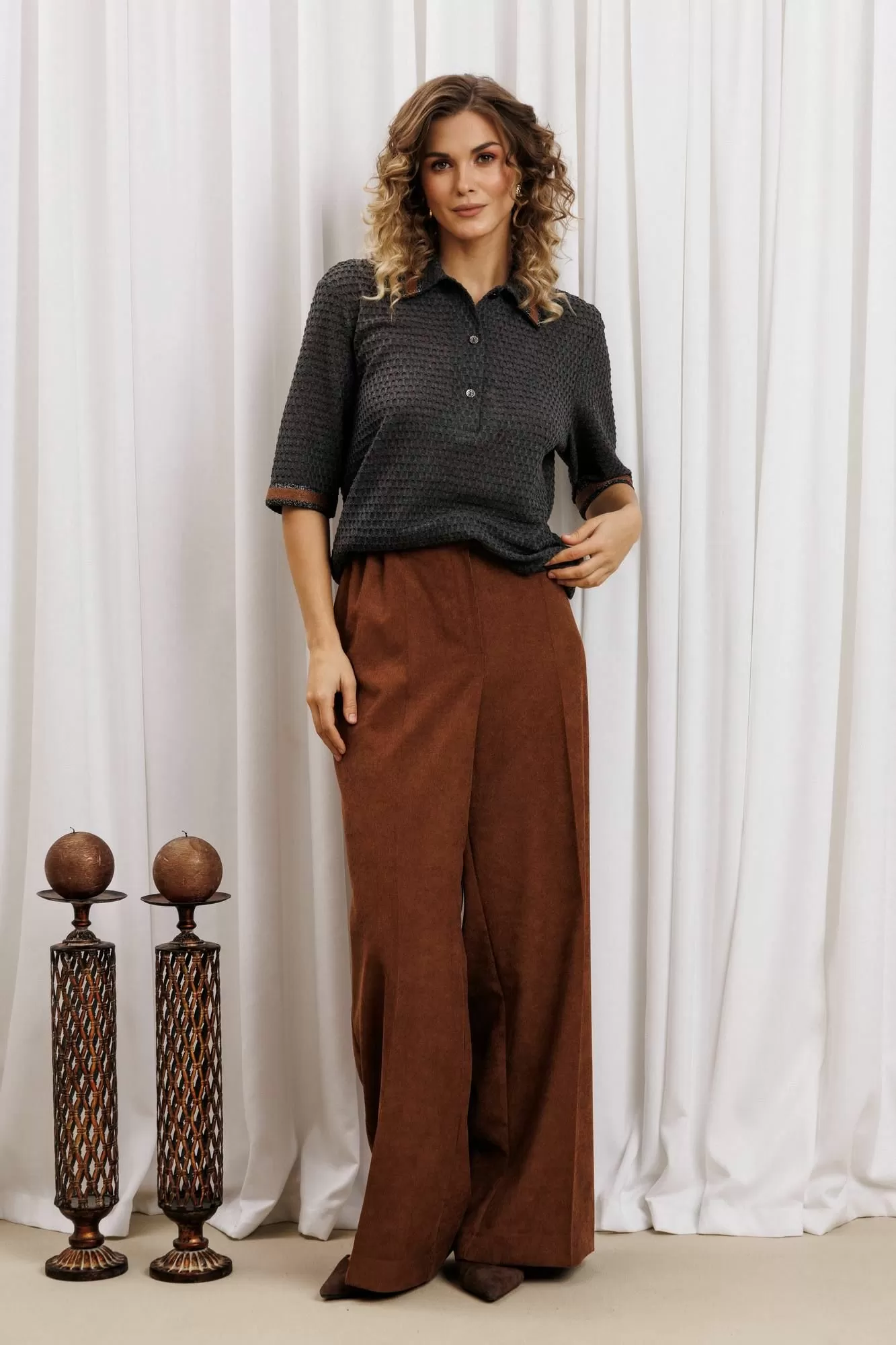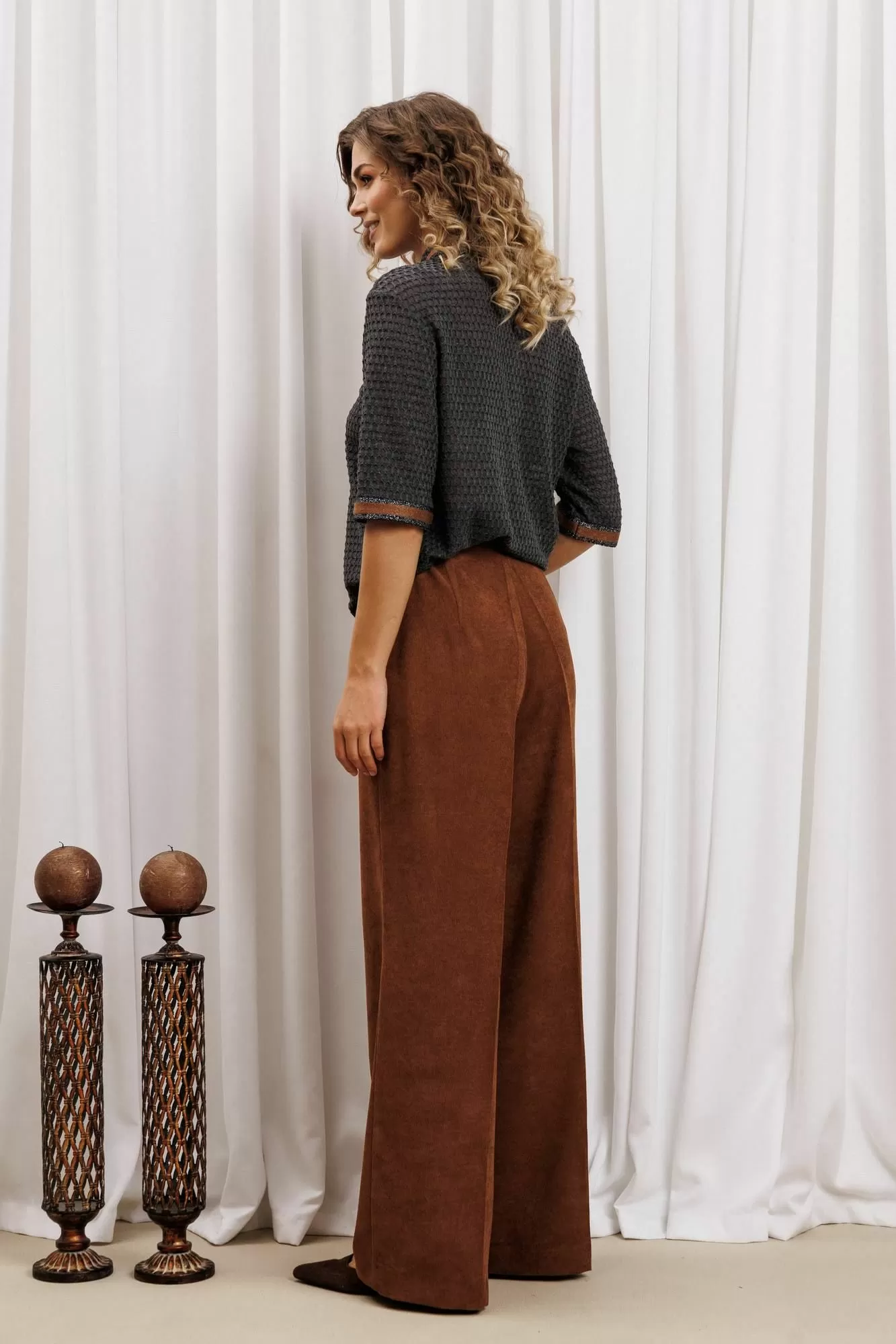Костюм состоит из джемпера и брюк. Джемпер прямого силуэта из трикотажного ажурного полотна. Перед с застежкой поло и нагрудными вытачками. По воротнику и низу рукава настрочена декоративная тесьма. Длина джемпера - 69 см, длина рукава - 32 см. Брюки палаццо с притачным поясом из мягкой вельветовой ткани. Спереди застежка гульфик на молнии и петлей и пуговицей по поясу. По задней частям брюк вытачки. Пояс с резинкой в боковых частях. Брюки с заутюженными стрелками. Длина брюк с учетом пояса - 109 см.