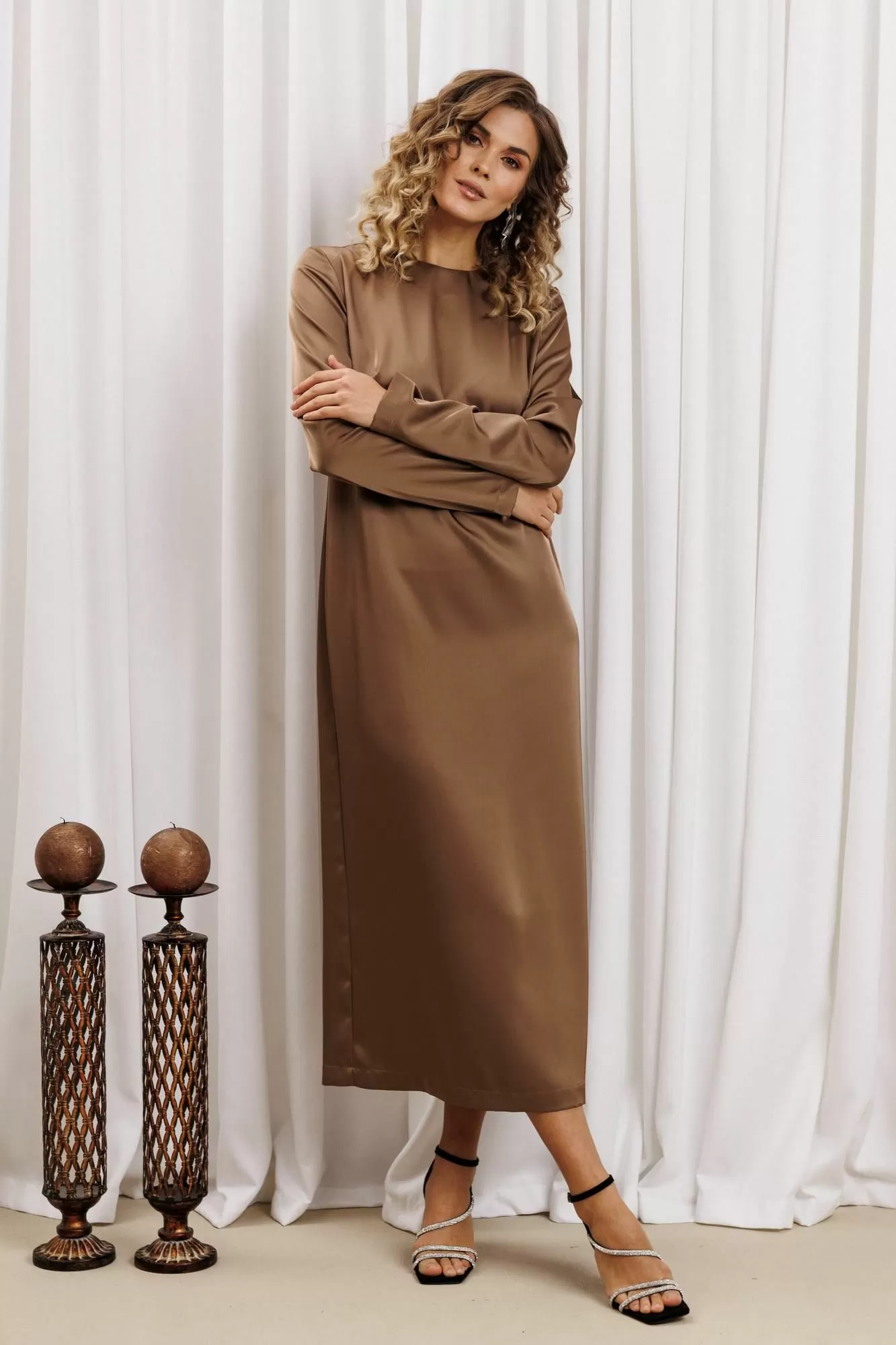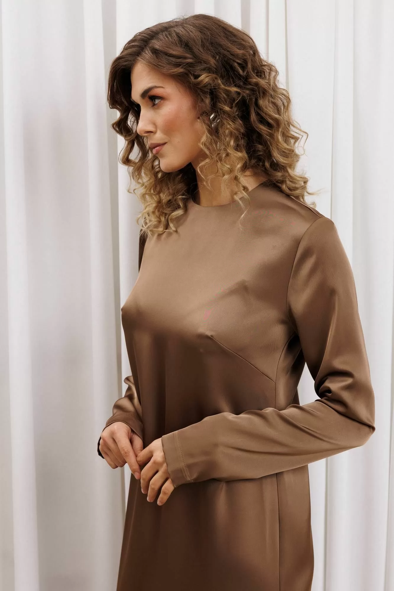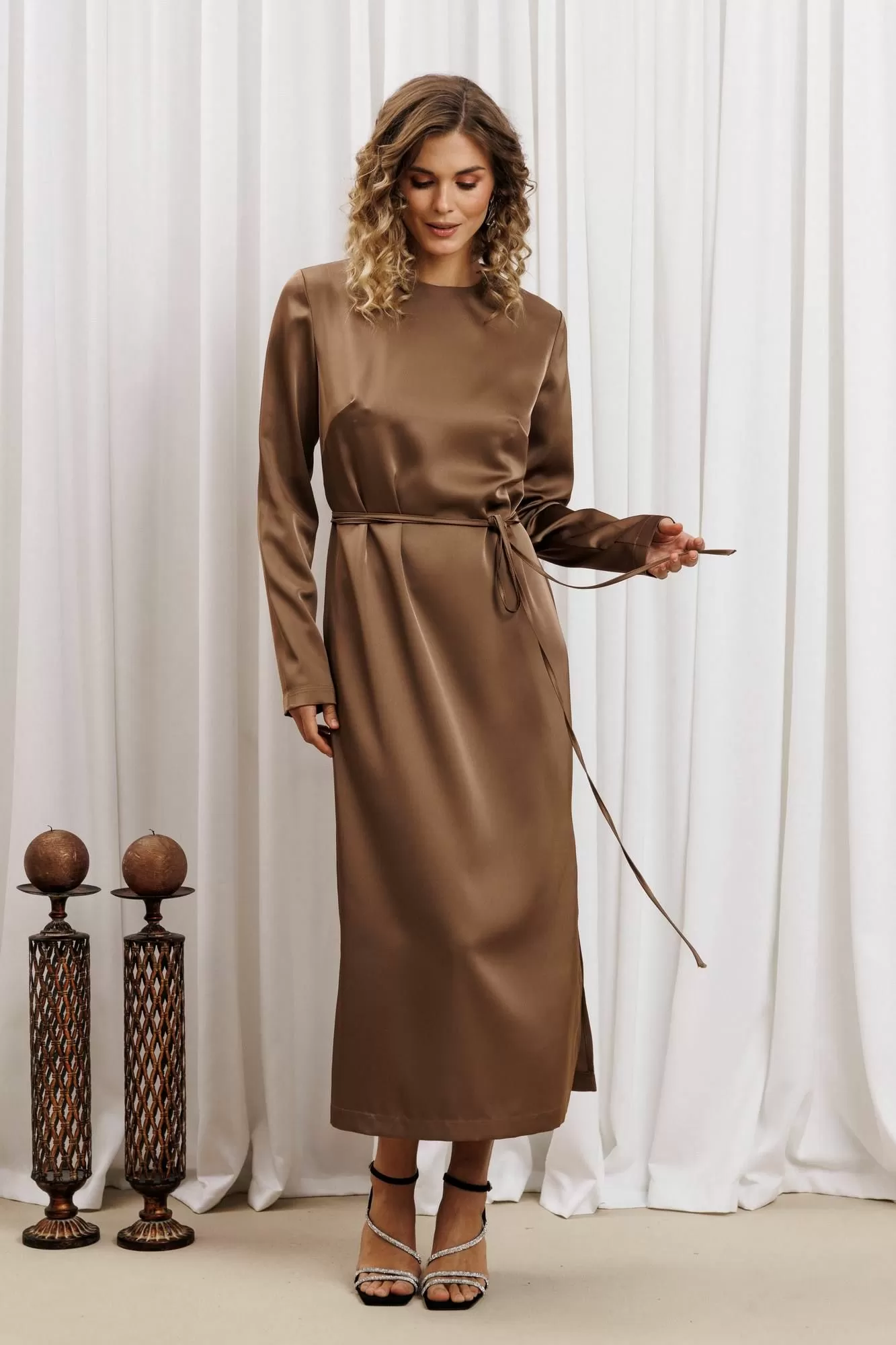 Платье прямого силуэта выполнено из атласной ткани. Перед с нагрудной вытачкой. Спинка с застежкой "капелькой" на петлю и пуговицу сверху. В боковом шве разрез. Рукав втачной одношовный. К платью прилагается пояс из основной ткани. Длина платья 125 см, длина рукава - 61 см.