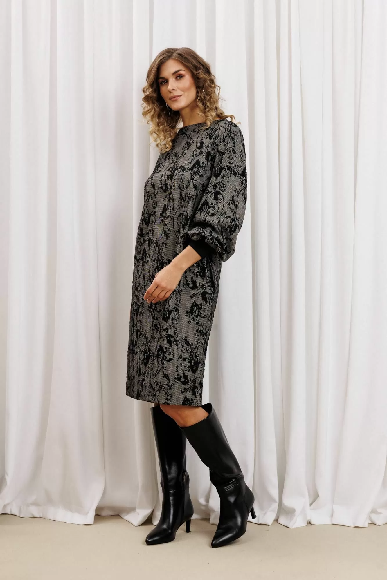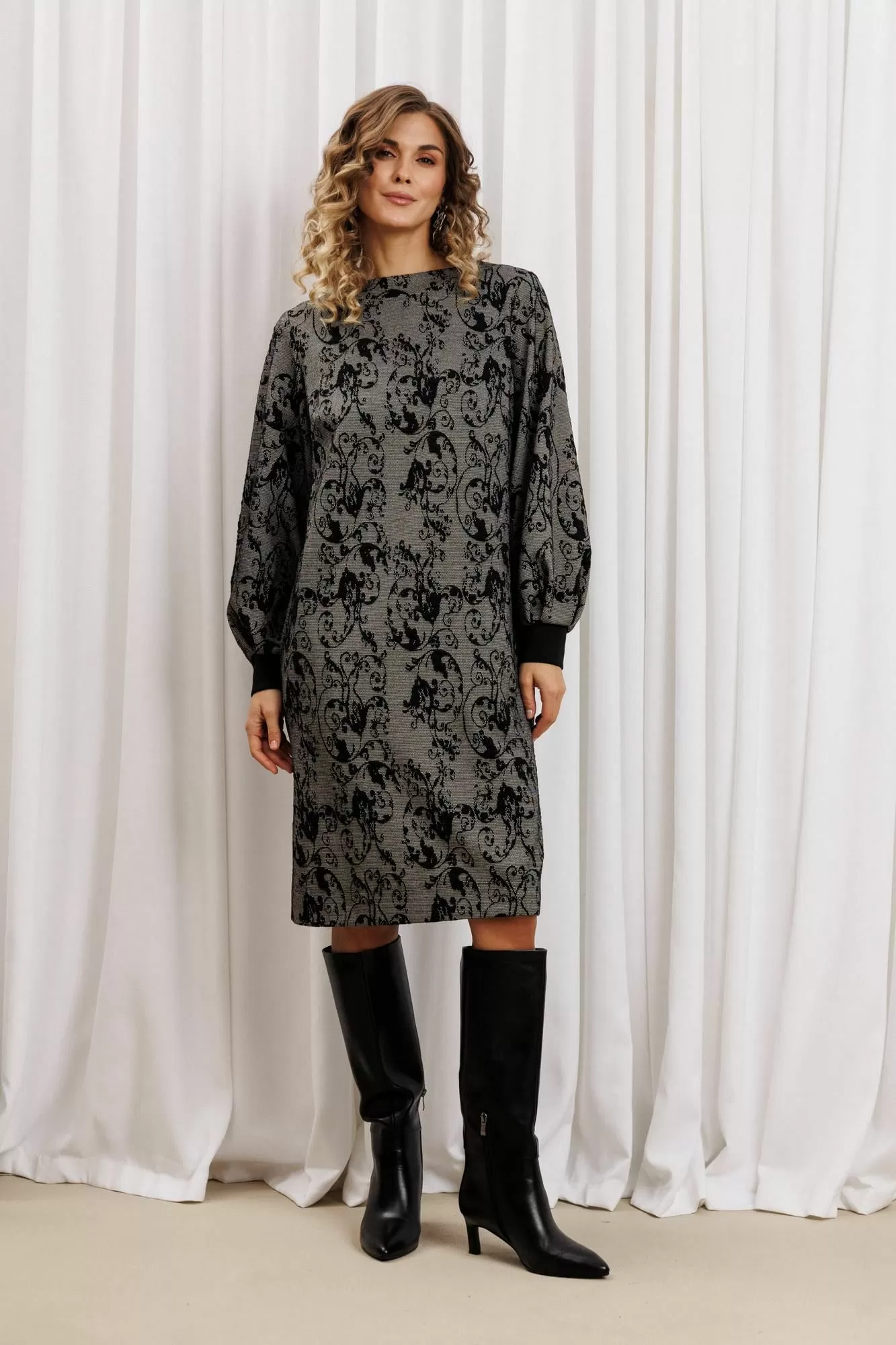 Платье прямого силуэта из плотного трикотажного полотна с рисунком и с люрексом. Перед с нагрудными вытачками. Спинка со средним швом. Горловина лодочкой обработана планкой. Рукав одношовный втачной по низу со складками собранными на манжету-довяз. Длина платья-100см, длина рукава-60см.