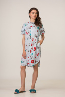 Платье-рубашка прямого силуэта из штапельной ткани. По переду нагрудные вытачки, карманы в боковом шве. Рукав короткий в виде «фонарика» с воланом по низу. Платье с воротником –стойка. Застежка-планка по переду на петли и пуговицы. Низ платья округлый по переду и спинке. Длина изделия по спинке/ Длина изделия по переду/ Длина рукава, см 42-44 р-р 46-50 р-р 52-56 р-р 58-62 р-р 100/96/30 101/98/30 103/100/30 105/102/30