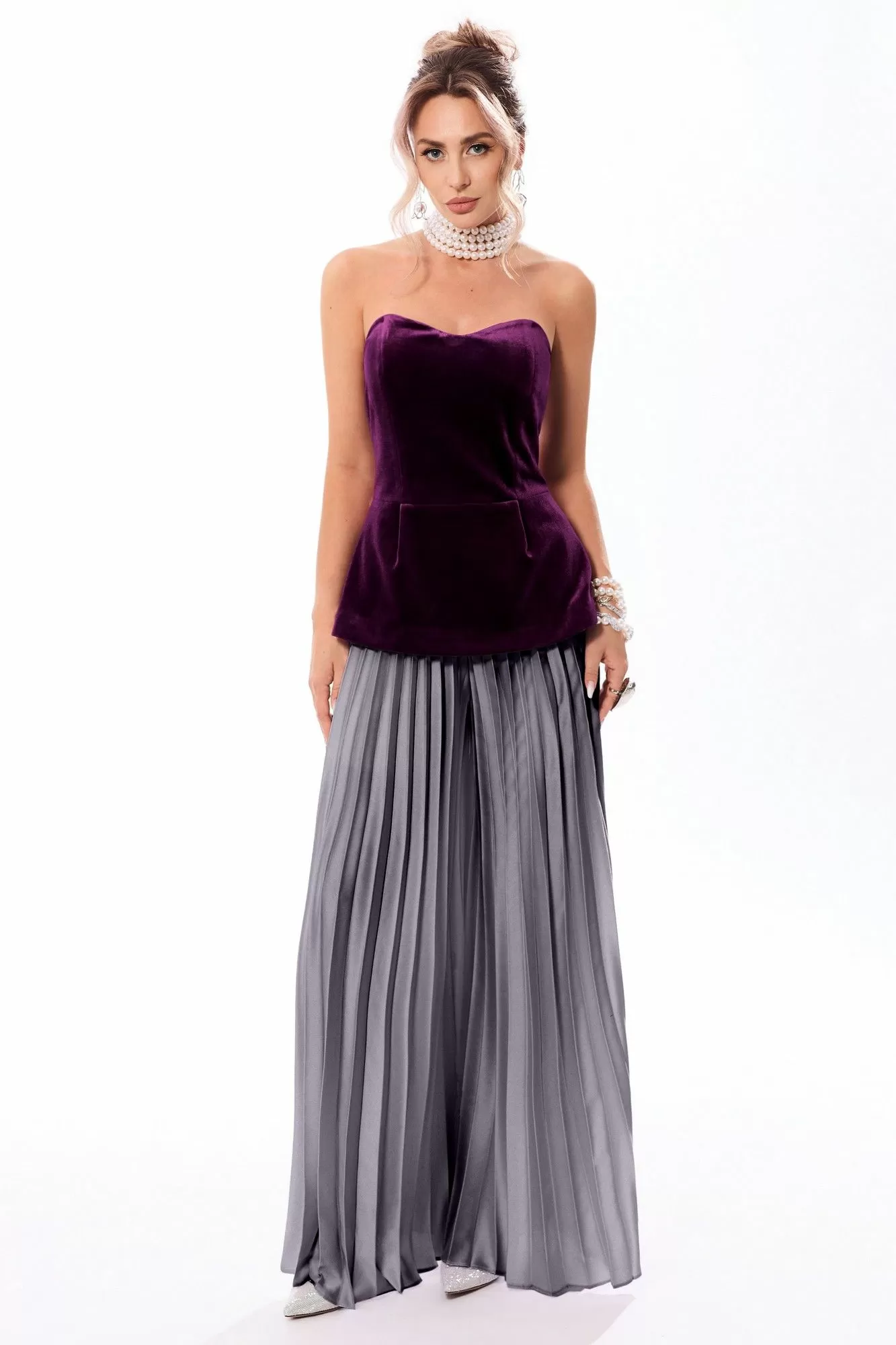 Брюки- гофре расширенного силуэта, с отрезным поясом, без застежки, верх брюк присборен на резинку. Брюки без боковых швов.