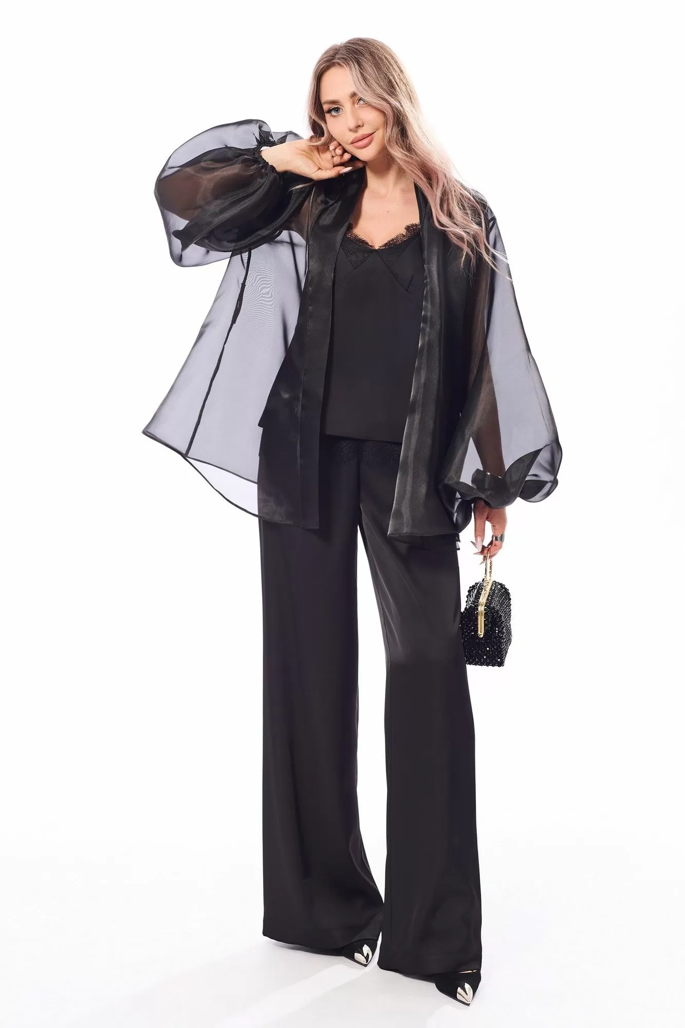 Блуза без застежки, с отрезной планкой горловины. Плечо спущенное. Рукав длинный, с отрезной манжетой. По шву притачивания манжеты рукав присборен. Блуза со съемным поясом.