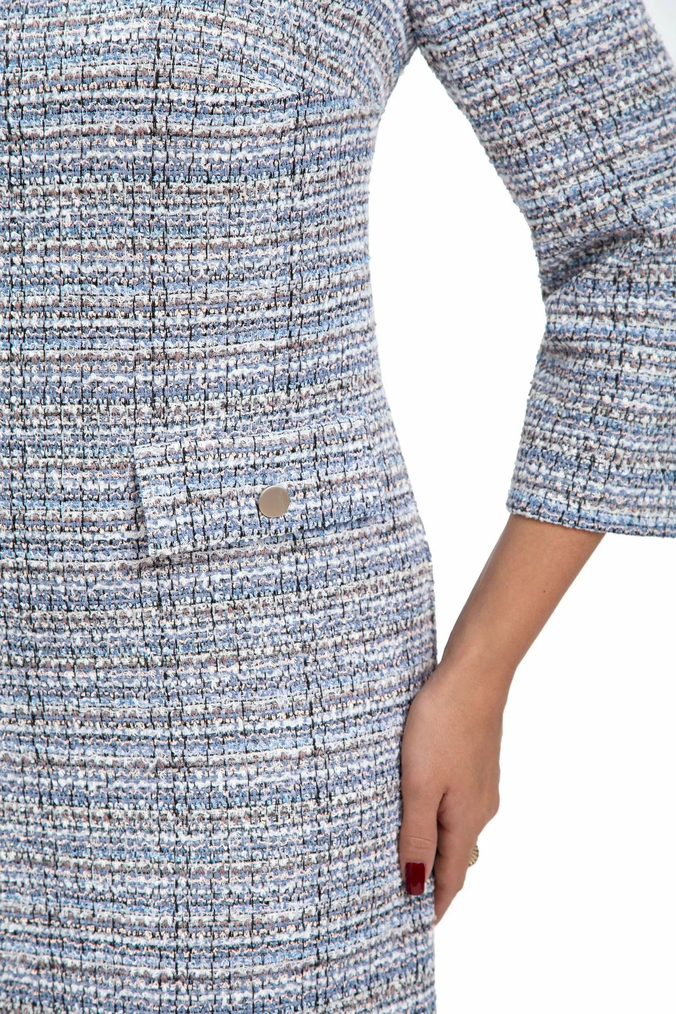Платье с застежкой на потайную молнию в среднем шве спинки, без воротника, с круглым вырезом горловины, и доплнительной застежкой на петли и пуговицы по левому плечевому шву. По переду с нагрудными вытачками. На уровне линии бедер расположены отделочные клапаны, зафиксированные к Платье на подкладке
