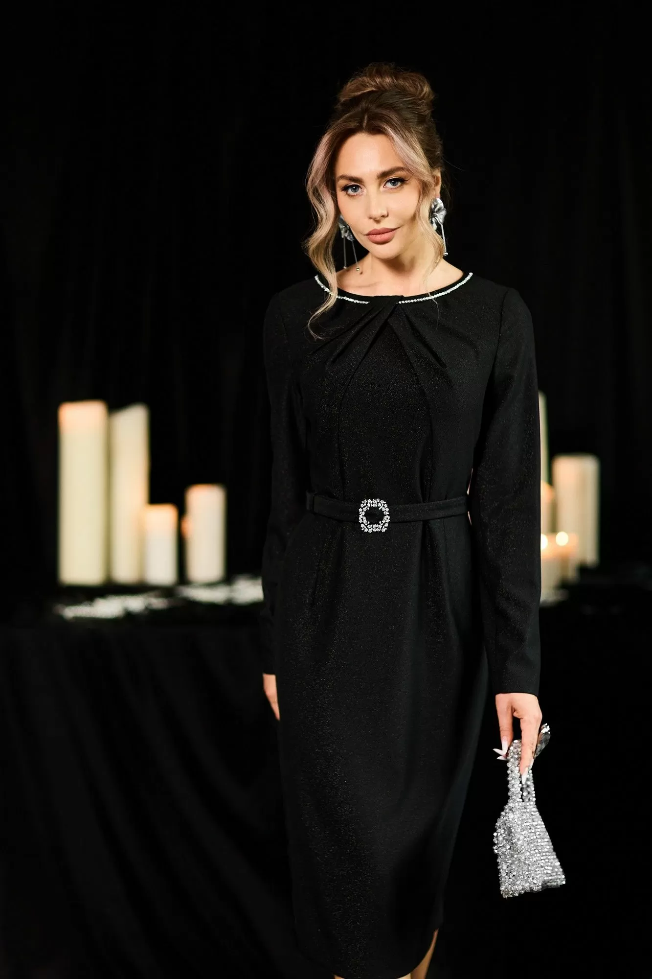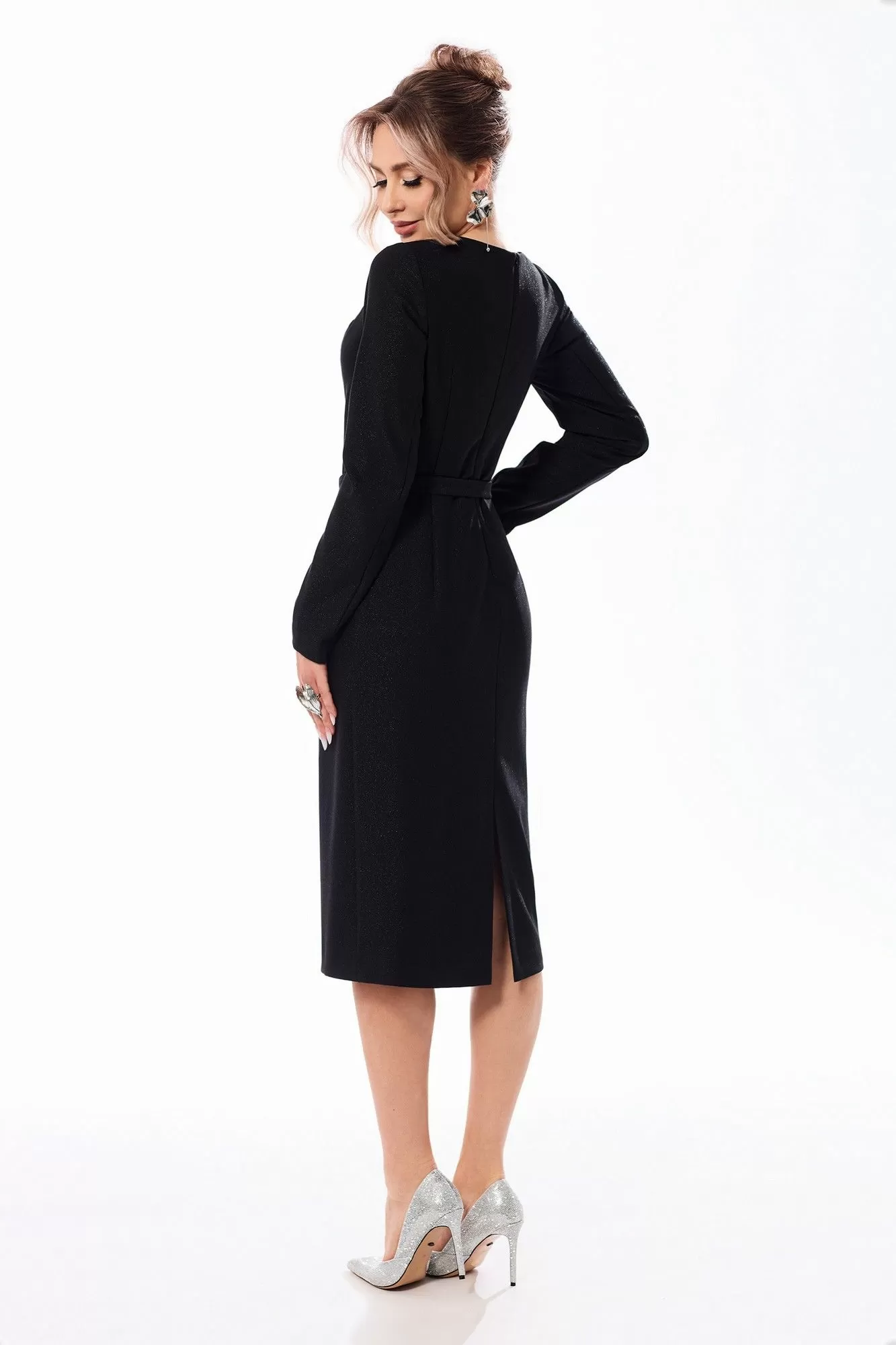 Платье без воротника, с фигурным вырезом горловины, застежкой на потайную молнию в среднем шве спинки. Платье отрезное по линии талии. По горловине переда фигурная драпировка со складками, горловина переда с отрезной планкой, декорированной тесьмой со стразами. Спинка со средним швом, заканчивающимся разрезом, талиевыми вытачками. Рукав втачной, длинный. Платье со съемным поясом.